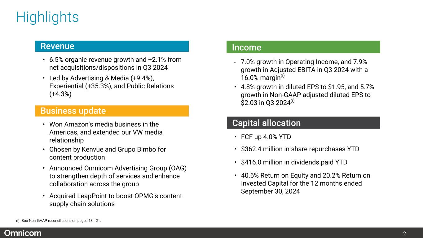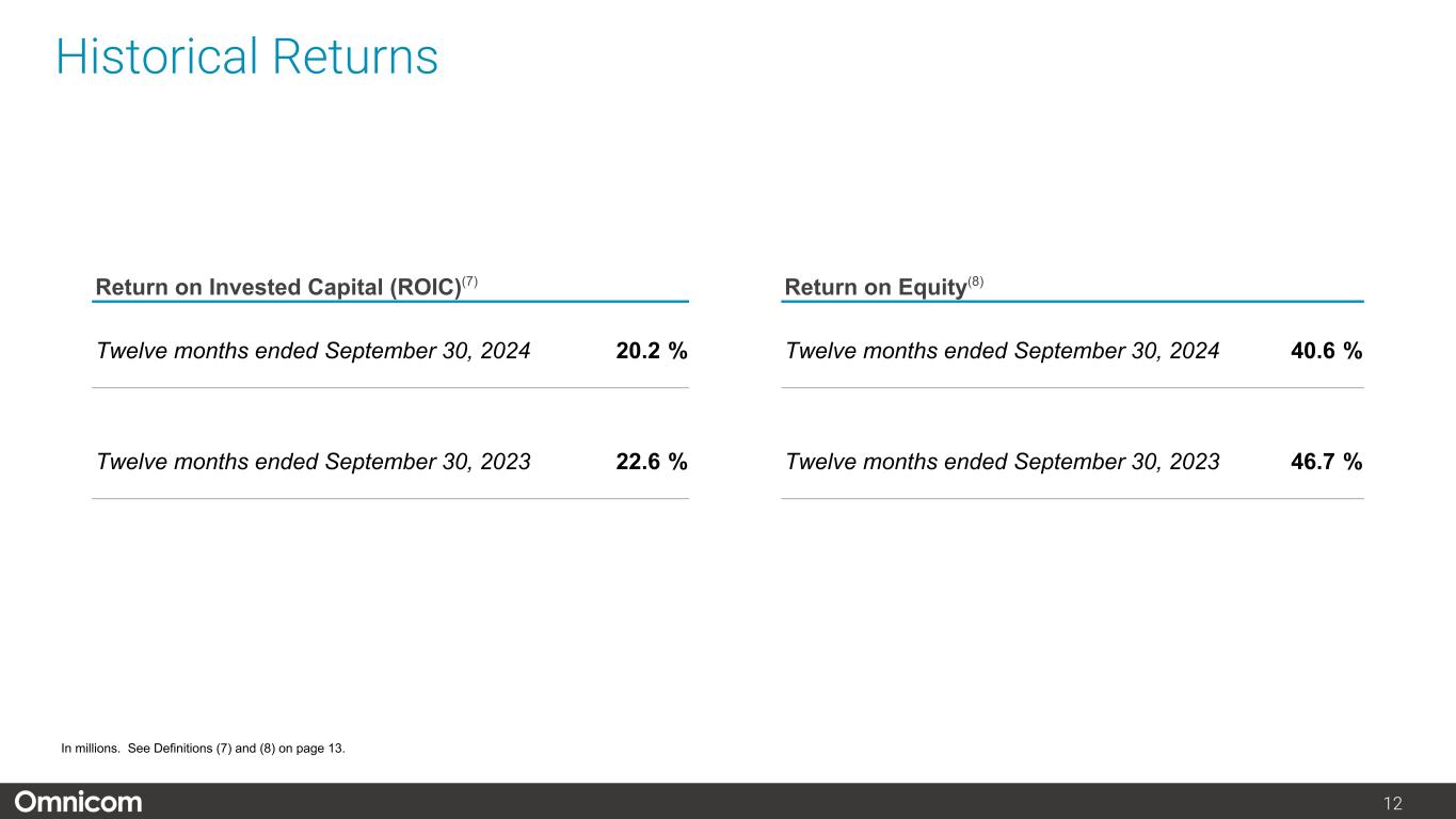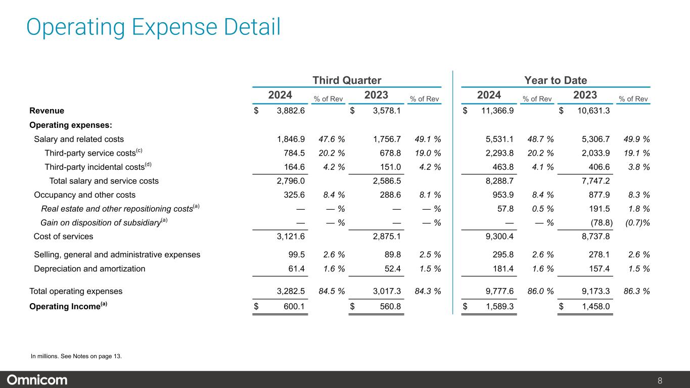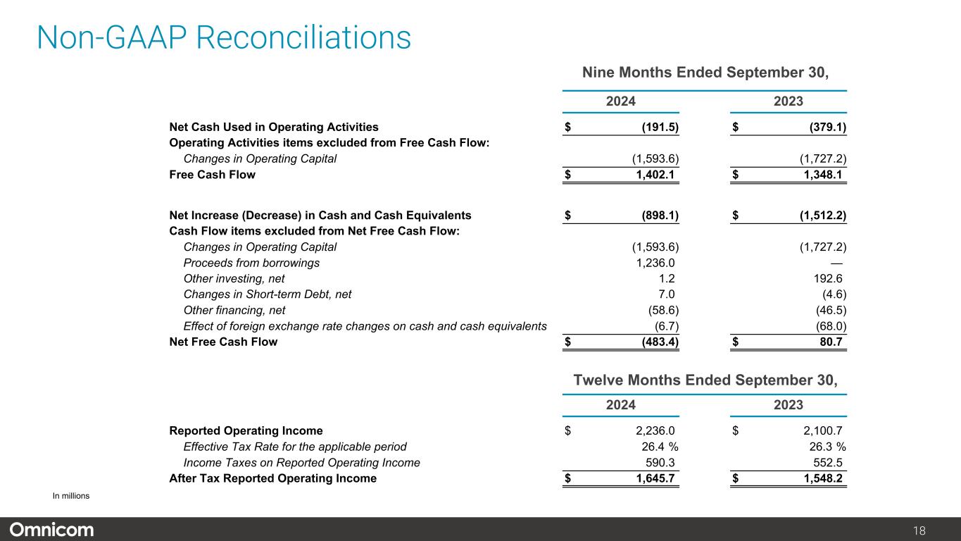 13 Notes (a) For the nine months ended September 30, 2024, operating expenses included $57.8 million ($42.9 million after-tax) of repositioning costs, primarily related to severance, which reduced diluted net income per share- Omnicom Group Inc. by $0.22. There were no repositioning costs for the three months ended September 30, 2024. For the nine months ended September 30, 2023, operating expenses included real estate operating lease impairment charges, severance, and other exit costs of $191.5 million ($145.5 million after-tax) related to repositioning actions we took in the first and second quarters of 2023 to reduce our real estate requirements, rebalance our workforce, and consolidate operations in certain markets. In addition, in the second quarter of 2023, we recorded a gain of $78.8 million ($55.9 million after tax) on disposition of certain of our research businesses in the Execution & Support discipline. There was no impact to operating expenses for the three months ended September 30, 2023 from these actions. The net impact of these actions reduced diluted net income per share- Omnicom Group Inc. by $0.44. (b) Income tax for the nine months ended September 30, 2024 and 2023 included impacts related to real estate and other repositioning actions and gain on disposition of subsidiary. (c) Third-party service costs include third-party supplier costs when we act as principal in providing services to our clients. (d) Third-party incidental costs primarily consist of client-related travel and incidental out-of-pocket costs, which we bill back to the client directly at our cost and which we are required to include in revenue. (e) Constant Dollar ("C$") expense is calculated by translating the current period’s local currency expense using the prior period average exchange rates to derive current period C$ expense. The foreign exchange rate impact is the difference between the current period expense in U.S. Dollars and the current period C$ expense. Financial Definitions (1) Foreign exchange rate impact: calculated by translating the current period’s local currency revenue using the prior period average exchange rates to derive current period constant currency revenue. The foreign exchange rate impact is the difference between the current period revenue in U.S. Dollars and the current period constant currency revenue. (2) Acquisition revenue, net of disposition revenue: Acquisition revenue is calculated as if the acquisition occurred twelve months prior to the acquisition date by aggregating the comparable prior period revenue of acquisitions through the acquisition date. As a result, acquisition revenue excludes the positive or negative difference between our current period revenue subsequent to the acquisition date, and the comparable prior period revenue and the positive or negative growth after the acquisition date is attributed to organic growth. Disposition revenue is calculated as if the disposition occurred twelve months prior to the disposition date by aggregating the comparable prior period revenue of disposals through such date. The acquisition revenue and disposition revenue amounts are netted in the presentation on page 4. (3) Organic growth: calculated by subtracting the foreign exchange rate impact, and the acquisition revenue, net of disposition revenue components from total revenue growth. (4) See page 18 for the reconciliation of non-GAAP financial measures, which reconciles Free Cash Flow to the Net Cash Used in Operating Activities and Net Free Cash Flow to the Net Increase (Decrease) in Cash and Cash Equivalents for the periods presented on page 10. The Free Cash Flow, Primary Uses of Cash and Net Free Cash Flow amounts presented on page 10 are non-GAAP liquidity measures. See page 22 for the definition of Net Free Cash Flow. (5) EBITA, EBITDA, and Non-GAAP Adjusted Net Income per share - Diluted are non-GAAP performance measures. Beginning with the first quarter of 2024, EBITA is defined as operating income before amortization of acquired intangible assets and internally developed strategic platform assets. As a result, we reclassified the prior year periods to be consistent with the revised definition, which reduced EBITA from previously reported amounts. Non-GAAP Adjusted Net Income per share - Diluted reflects the after-tax effects of amortization of acquired intangible assets and internally developed strategic platform assets. We use EBITA and EBITA margin as additional operating performance measures, which exclude the non-cash amortization expense of acquired intangible assets and internally developed strategic platform assets and allows for comparability of the periods presented. See page 22 for the definition of these measures and pages 19 and 20 for the reconciliation of Non-GAAP financial measures. (6) Net Debt is a non-GAAP liquidity measure. See page 22 for the definition of this measure, which is reconciled in the table on page 11. (7) Return on Invested Capital is After Tax Reported Operating Income (a non-GAAP performance measure – see page 22 for the definition of this measure and page 18 for the reconciliation of non-GAAP financial measures) divided by the average of Invested Capital at the beginning and the end of the period (book value of all long-term liabilities, including those related to operating leases, short-term interest bearing debt, the short-term liability related to operating leases plus shareholders’ equity less cash, cash equivalents, short-term investments, and operating lease right of use assets). (8) Return on Equity is Reported Net Income for the given period divided by the average of shareholders’ equity at the beginning and end of the period. (9) The Free Cash Flow amounts presented on page 16 are non-GAAP liquidity measures. See page 22 for the definition of this measure and page 18 for the reconciliation of the non-GAAP financial measures, which reconciles Free Cash Flow to the Net Cash Used in Operating Activ