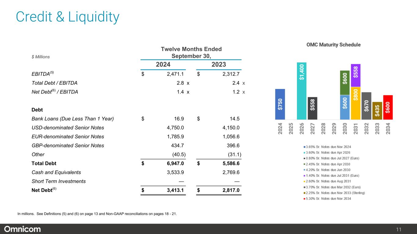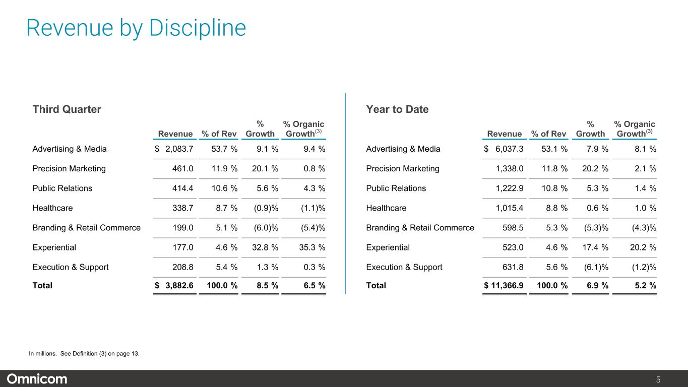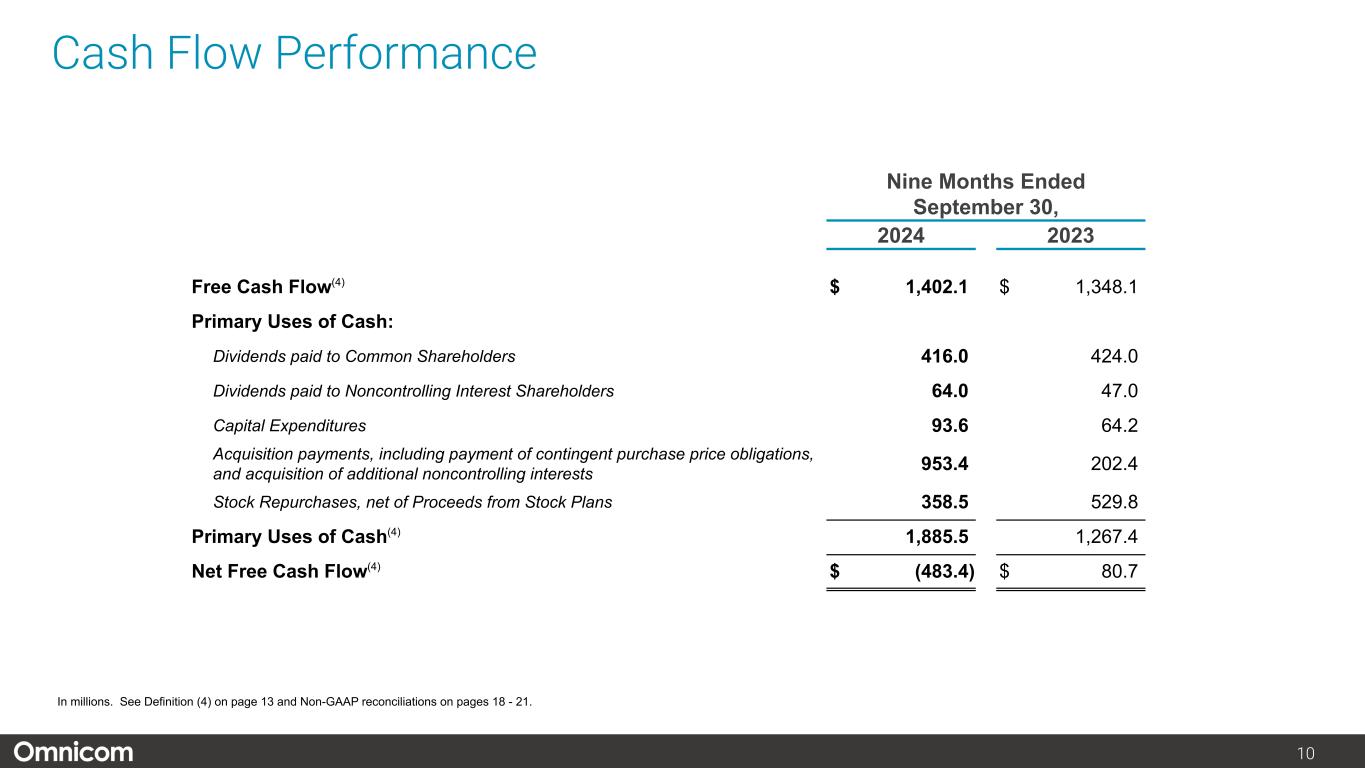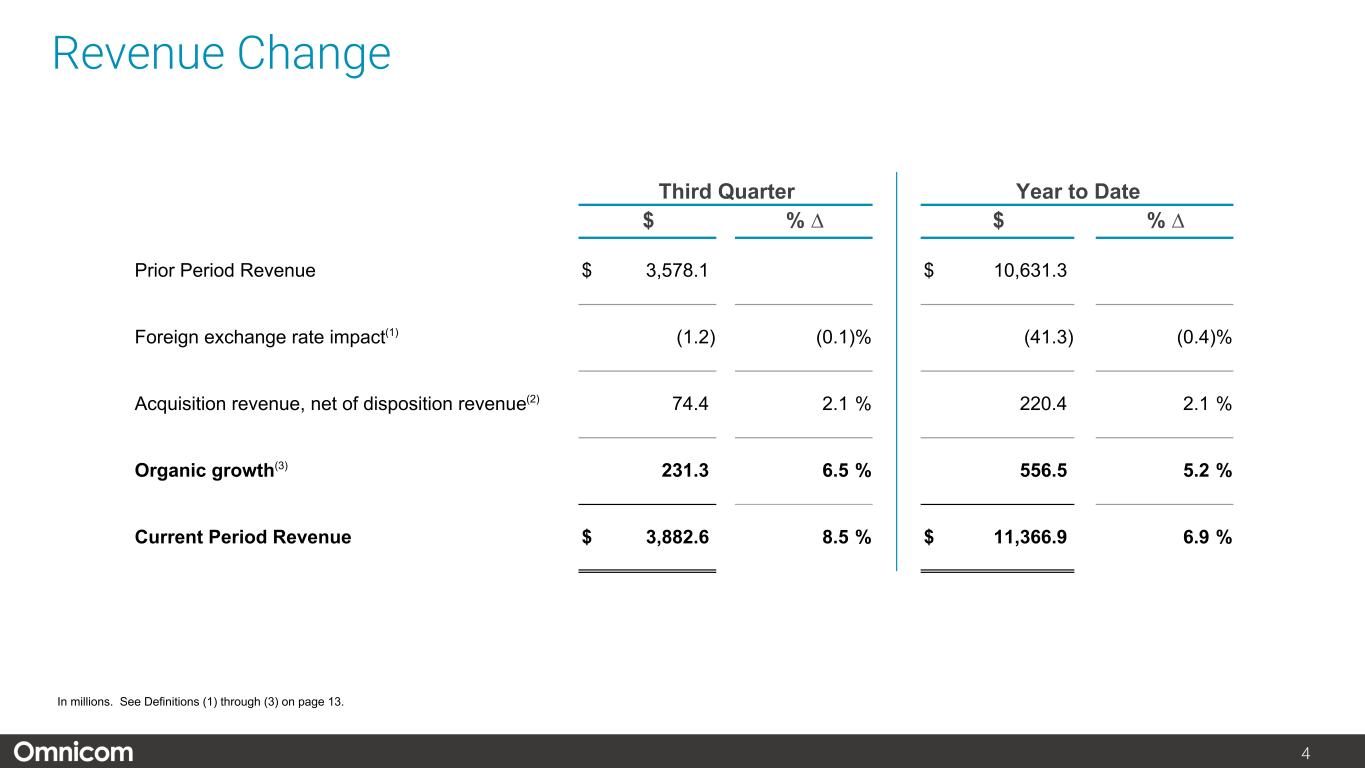 13 Notes (a) For the nine months ended September 30, 2024, operating expenses included $57.8 million ($42.9 million after-tax) of repositioning costs, primarily related to severance, which reduced diluted net income per share- Omnicom Group Inc. by $0.22. There were no repositioning costs for the three months ended September 30, 2024. For the nine months ended September 30, 2023, operating expenses included real estate operating lease impairment charges, severance, and other exit costs of $191.5 million ($145.5 million after-tax) related to repositioning actions we took in the first and second quarters of 2023 to reduce our real estate requirements, rebalance our workforce, and consolidate operations in certain markets. In addition, in the second quarter of 2023, we recorded a gain of $78.8 million ($55.9 million after tax) on disposition of certain of our research businesses in the Execution & Support discipline. There was no impact to operating expenses for the three months ended September 30, 2023 from these actions. The net impact of these actions reduced diluted net income per share- Omnicom Group Inc. by $0.44. (b) Income tax for the nine months ended September 30, 2024 and 2023 included impacts related to real estate and other repositioning actions and gain on disposition of subsidiary. (c) Third-party service costs include third-party supplier costs when we act as principal in providing services to our clients. (d) Third-party incidental costs primarily consist of client-related travel and incidental out-of-pocket costs, which we bill back to the client directly at our cost and which we are required to include in revenue. (e) Constant Dollar ("C$") expense is calculated by translating the current period’s local currency expense using the prior period average exchange rates to derive current period C$ expense. The foreign exchange rate impact is the difference between the current period expense in U.S. Dollars and the current period C$ expense. Financial Definitions (1) Foreign exchange rate impact: calculated by translating the current period’s local currency revenue using the prior period average exchange rates to derive current period constant currency revenue. The foreign exchange rate impact is the difference between the current period revenue in U.S. Dollars and the current period constant currency revenue. (2) Acquisition revenue, net of disposition revenue: Acquisition revenue is calculated as if the acquisition occurred twelve months prior to the acquisition date by aggregating the comparable prior period revenue of acquisitions through the acquisition date. As a result, acquisition revenue excludes the positive or negative difference between our current period revenue subsequent to the acquisition date, and the comparable prior period revenue and the positive or negative growth after the acquisition date is attributed to organic growth. Disposition revenue is calculated as if the disposition occurred twelve months prior to the disposition date by aggregating the comparable prior period revenue of disposals through such date. The acquisition revenue and disposition revenue amounts are netted in the presentation on page 4. (3) Organic growth: calculated by subtracting the foreign exchange rate impact, and the acquisition revenue, net of disposition revenue components from total revenue growth. (4) See page 18 for the reconciliation of non-GAAP financial measures, which reconciles Free Cash Flow to the Net Cash Used in Operating Activities and Net Free Cash Flow to the Net Increase (Decrease) in Cash and Cash Equivalents for the periods presented on page 10. The Free Cash Flow, Primary Uses of Cash and Net Free Cash Flow amounts presented on page 10 are non-GAAP liquidity measures. See page 22 for the definition of Net Free Cash Flow. (5) EBITA, EBITDA, and Non-GAAP Adjusted Net Income per share - Diluted are non-GAAP performance measures. Beginning with the first quarter of 2024, EBITA is defined as operating income before amortization of acquired intangible assets and internally developed strategic platform assets. As a result, we reclassified the prior year periods to be consistent with the revised definition, which reduced EBITA from previously reported amounts. Non-GAAP Adjusted Net Income per share - Diluted reflects the after-tax effects of amortization of acquired intangible assets and internally developed strategic platform assets. We use EBITA and EBITA margin as additional operating performance measures, which exclude the non-cash amortization expense of acquired intangible assets and internally developed strategic platform assets and allows for comparability of the periods presented. See page 22 for the definition of these measures and pages 19 and 20 for the reconciliation of Non-GAAP financial measures. (6) Net Debt is a non-GAAP liquidity measure. See page 22 for the definition of this measure, which is reconciled in the table on page 11. (7) Return on Invested Capital is After Tax Reported Operating Income (a non-GAAP performance measure – see page 22 for the definition of this measure and page 18 for the reconciliation of non-GAAP financial measures) divided by the average of Invested Capital at the beginning and the end of the period (book value of all long-term liabilities, including those related to operating leases, short-term interest bearing debt, the short-term liability related to operating leases plus shareholders’ equity less cash, cash equivalents, short-term investments, and operating lease right of use assets). (8) Return on Equity is Reported Net Income for the given period divided by the average of shareholders’ equity at the beginning and end of the period. (9) The Free Cash Flow amounts presented on page 16 are non-GAAP liquidity measures. See page 22 for the definition of this measure and page 18 for the reconciliation of the non-GAAP financial measures, which reconciles Free Cash Flow to the Net Cash Used in Operating Activ