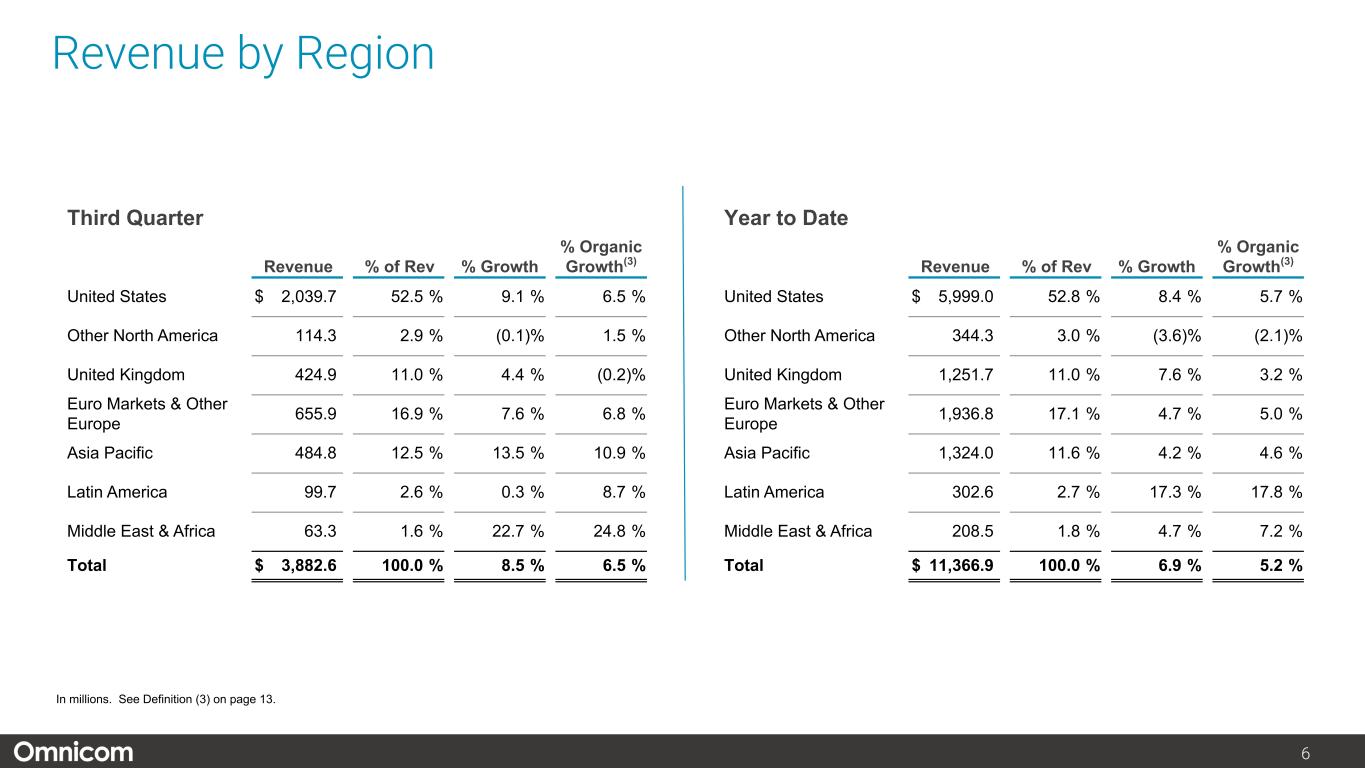 5 Revenue by Discipline Third Quarter Year to Date Revenue % of Rev % Growth % Organic Growth(3) Revenue % of Rev % Growth % Organic Growth(3) Advertising & Media $ 2,083.7 53.7 % 9.1 % 9.4 % Advertising & Media $ 6,037.3 53.1 % 7.9 % 8.1 % Precision Marketing 461.0 11.9 % 20.1 % 0.8 % Precision Marketing 1,338.0 11.8 % 20.2 % 2.1 % Public Relations 414.4 10.6 % 5.6 % 4.3 % Public Relations 1,222.9 10.8 % 5.3 % 1.4 % Healthcare 338.7 8.7 % (0.9) % (1.1) % Healthcare 1,015.4 8.8 % 0.6 % 1.0 % Branding & Retail Commerce 199.0 5.1 % (6.0) % (5.4) % Branding & Retail Commerce 598.5 5.3 % (5.3) % (4.3) % Experiential 177.0 4.6 % 32.8 % 35.3 % Experiential 523.0 4.6 % 17.4 % 20.2 % Execution & Support 208.8 5.4 % 1.3 % 0.3 % Execution & Support 631.8 5.6 % (6.1) % (1.2) % Total $ 3,882.6 100.0 % 8.5 % 6.5 % Total $ 11,366.9 100.0 % 6.9 % 5.2 % In millions. See Definition (3) on page 13.