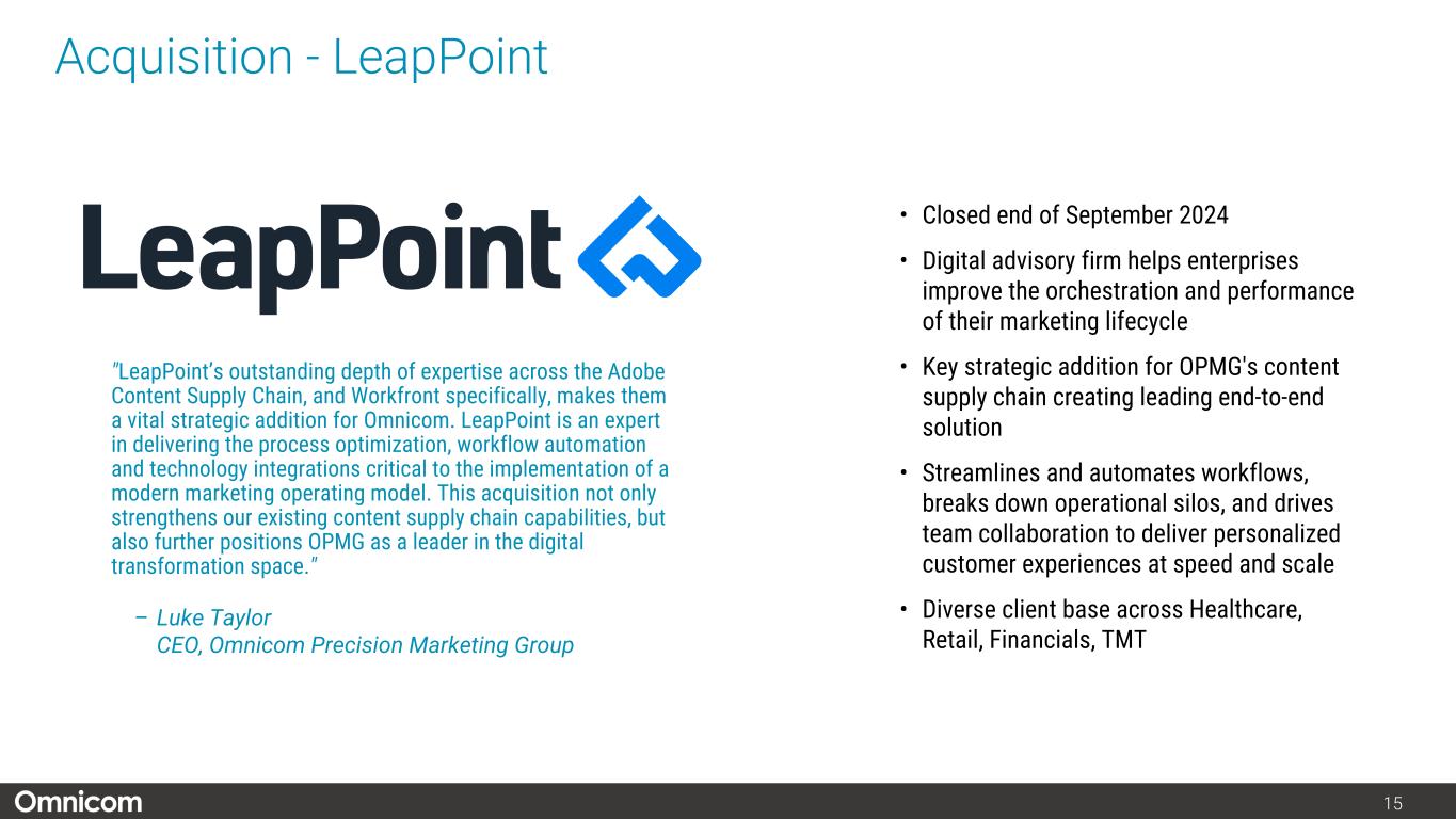 15 Acquisition - LeapPoint "LeapPoint’s outstanding depth of expertise across the Adobe Content Supply Chain, and Workfront specifically, makes them a vital strategic addition for Omnicom. LeapPoint is an expert in delivering the process optimization, workflow automation and technology integrations critical to the implementation of a modern marketing operating model. This acquisition not only strengthens our existing content supply chain capabilities, but also further positions OPMG as a leader in the digital transformation space." – Luke Taylor CEO, Omnicom Precision Marketing Group • Closed end of September 2024 • Digital advisory firm helps enterprises improve the orchestration and performance of their marketing lifecycle • Key strategic addition for OPMG's content supply chain creating leading end-to-end solution • Streamlines and automates workflows, breaks down operational silos, and drives team collaboration to deliver personalized customer experiences at speed and scale • Diverse client base across Healthcare, Retail, Financials, TMT