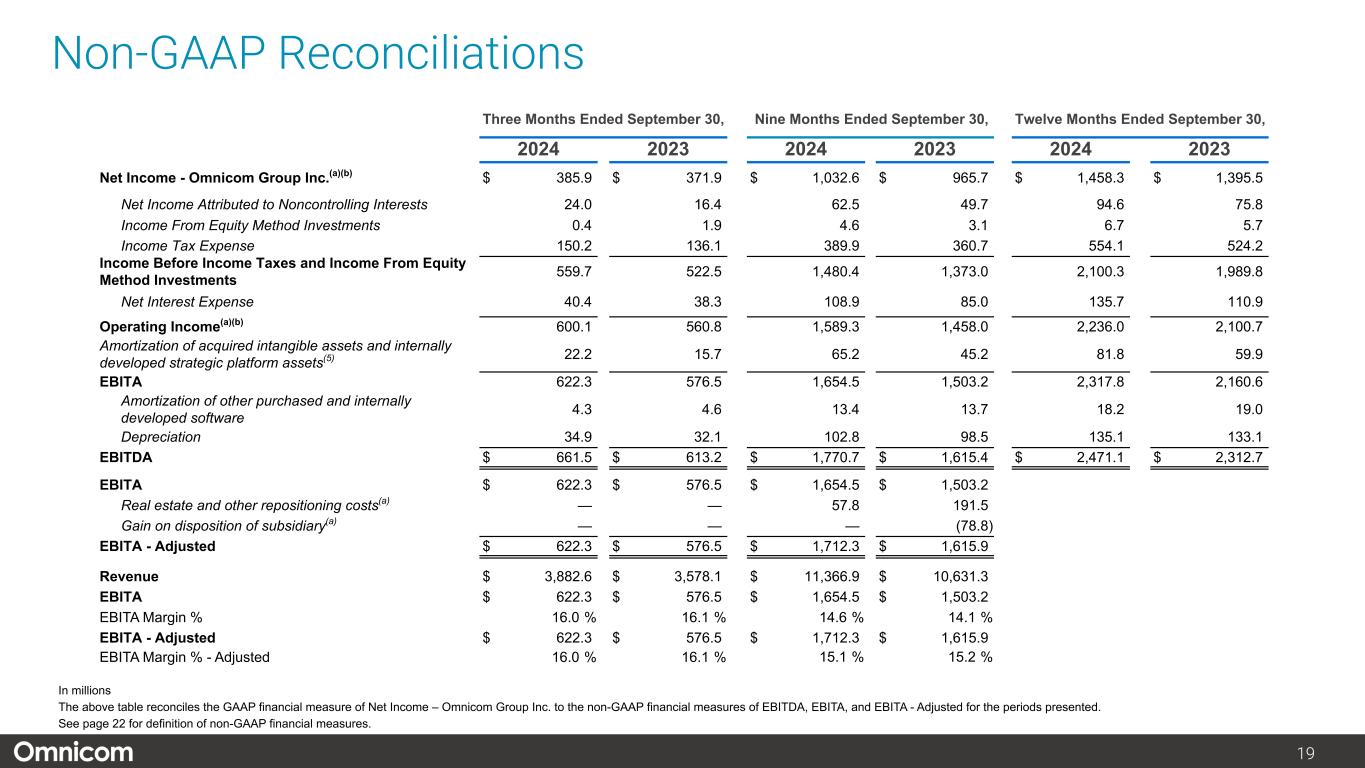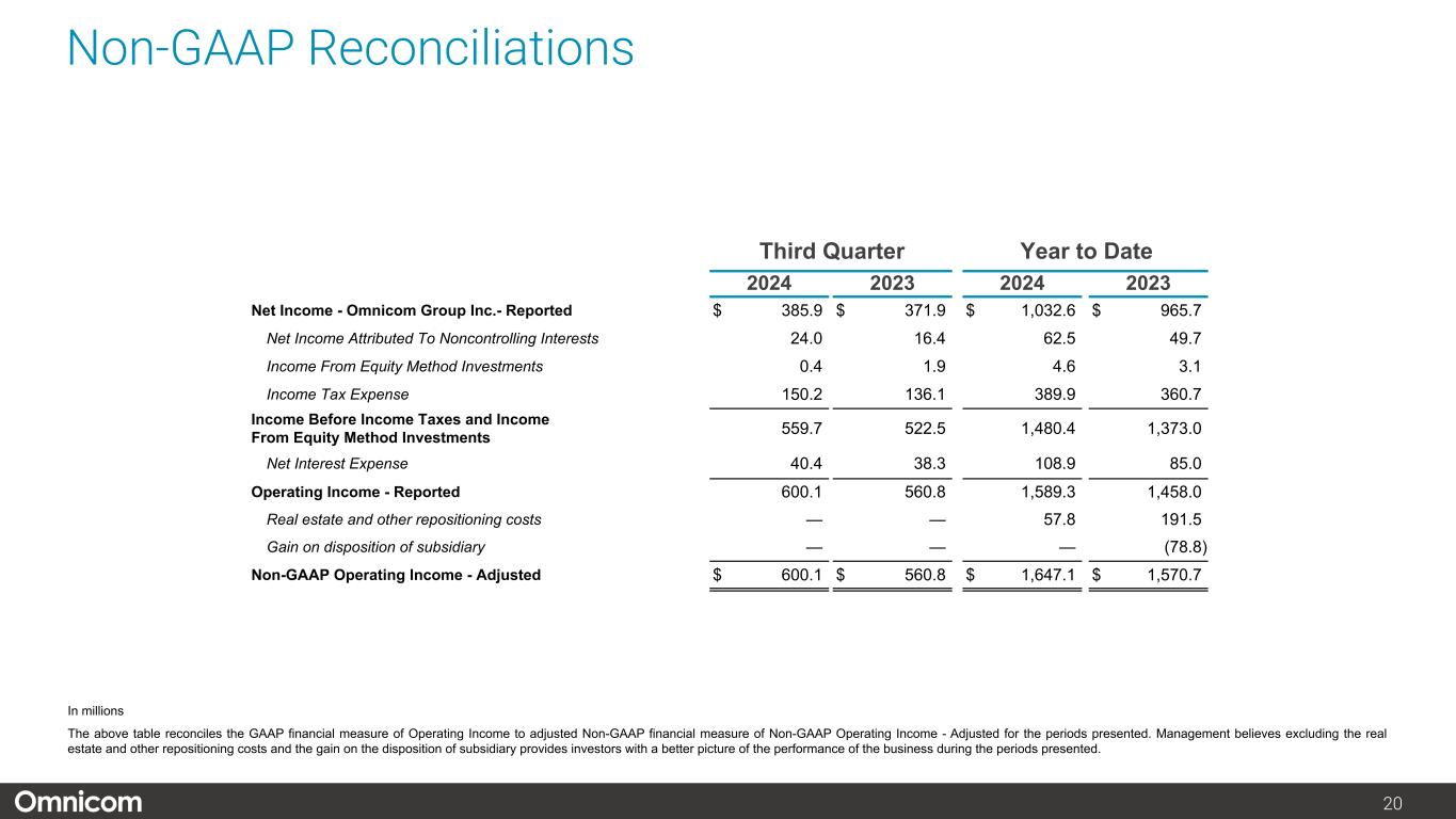 19 Non-GAAP Reconciliations In millions The above table reconciles the GAAP financial measure of Net Income – Omnicom Group Inc. to the non-GAAP financial measures of EBITDA, EBITA, and EBITA - Adjusted for the periods presented. See page 22 for definition of non-GAAP financial measures. Three Months Ended September 30, Nine Months Ended September 30, Twelve Months Ended September 30, 2024 2023 2024 2023 2024 2023 Net Income - Omnicom Group Inc.(a)(b) $ 385.9 $ 371.9 $ 1,032.6 $ 965.7 $ 1,458.3 $ 1,395.5 Net Income Attributed to Noncontrolling Interests 24.0 16.4 62.5 49.7 94.6 75.8 Income From Equity Method Investments 0.4 1.9 4.6 3.1 6.7 5.7 Income Tax Expense 150.2 136.1 389.9 360.7 554.1 524.2 Income Before Income Taxes and Income From Equity Method Investments 559.7 522.5 1,480.4 1,373.0 2,100.3 1,989.8 Net Interest Expense 40.4 38.3 108.9 85.0 135.7 110.9 Operating Income(a)(b) 600.1 560.8 1,589.3 1,458.0 2,236.0 2,100.7 Amortization of acquired intangible assets and internally developed strategic platform assets(5) 22.2 15.7 65.2 45.2 81.8 59.9 EBITA 622.3 576.5 1,654.5 1,503.2 2,317.8 2,160.6 Amortization of other purchased and internally developed software 4.3 4.6 13.4 13.7 18.2 19.0 Depreciation 34.9 32.1 102.8 98.5 135.1 133.1 EBITDA $ 661.5 $ 613.2 $ 1,770.7 $ 1,615.4 $ 2,471.1 $ 2,312.7 EBITA $ 622.3 $ 576.5 $ 1,654.5 $ 1,503.2 Real estate and other repositioning costs(a) — — 57.8 191.5 Gain on disposition of subsidiary(a) — — — (78.8) EBITA - Adjusted $ 622.3 $ 576.5 $ 1,712.3 $ 1,615.9 Revenue $ 3,882.6 $ 3,578.1 $ 11,366.9 $ 10,631.3 EBITA $ 622.3 $ 576.5 $ 1,654.5 $ 1,503.2 EBITA Margin % 16.0 % 16.1 % 14.6 % 14.1 % EBITA - Adjusted $ 622.3 $ 576.5 $ 1,712.3 $ 1,615.9 EBITA Margin % - Adjusted 16.0 % 16.1 % 15.1 % 15.2 %