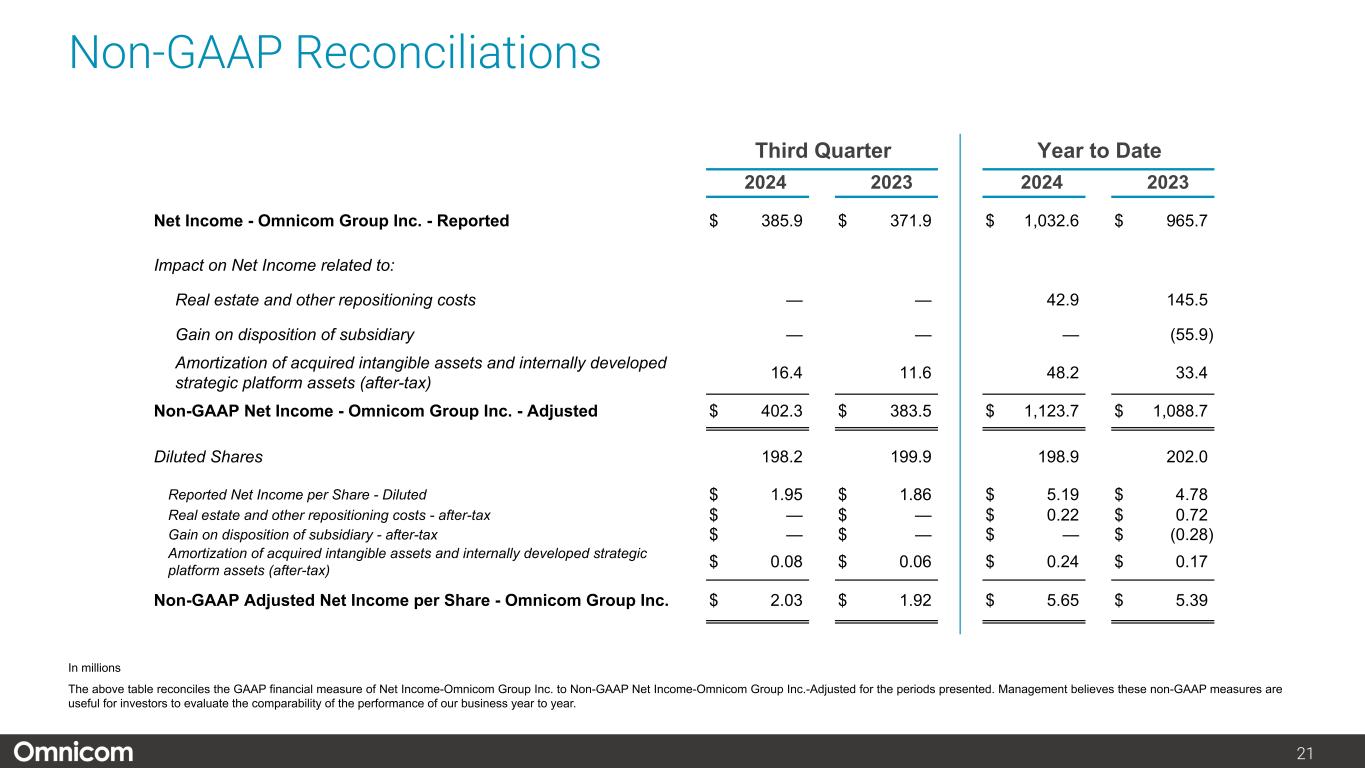 20 Non-GAAP Reconciliations In millions The above table reconciles the GAAP financial measure of Operating Income to adjusted Non-GAAP financial measure of Non-GAAP Operating Income - Adjusted for the periods presented. Management believes excluding the real estate and other repositioning costs and the gain on the disposition of subsidiary provides investors with a better picture of the performance of the business during the periods presented. Third Quarter Year to Date 2024 2023 2024 2023 Net Income - Omnicom Group Inc.- Reported $ 385.9 $ 371.9 $ 1,032.6 $ 965.7 Net Income Attributed To Noncontrolling Interests 24.0 16.4 62.5 49.7 Income From Equity Method Investments 0.4 1.9 4.6 3.1 Income Tax Expense 150.2 136.1 389.9 360.7 Income Before Income Taxes and Income From Equity Method Investments 559.7 522.5 1,480.4 1,373.0 Net Interest Expense 40.4 38.3 108.9 85.0 Operating Income - Reported 600.1 560.8 1,589.3 1,458.0 Real estate and other repositioning costs — — 57.8 191.5 Gain on disposition of subsidiary — — — (78.8) Non-GAAP Operating Income - Adjusted $ 600.1 $ 560.8 $ 1,647.1 $ 1,570.7