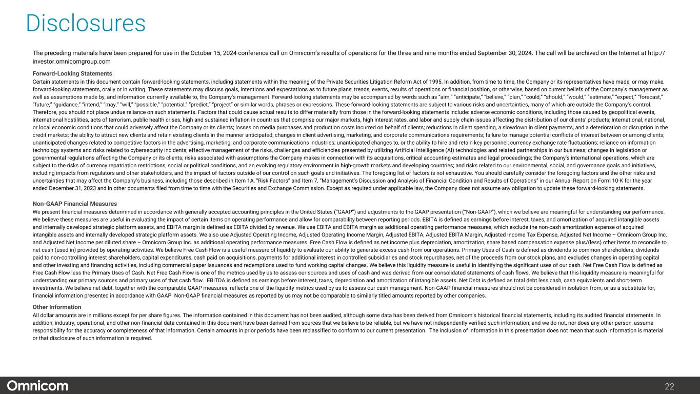 22 Disclosures The preceding materials have been prepared for use in the October 15, 2024 conference call on Omnicom’s results of operations for the three and nine months ended September 30, 2024. The call will be archived on the Internet at http:// investor.omnicomgroup.com Forward-Looking Statements Certain statements in this document contain forward-looking statements, including statements within the meaning of the Private Securities Litigation Reform Act of 1995. In addition, from time to time, the Company or its representatives have made, or may make, forward-looking statements, orally or in writing. These statements may discuss goals, intentions and expectations as to future plans, trends, events, results of operations or financial position, or otherwise, based on current beliefs of the Company’s management as well as assumptions made by, and information currently available to, the Company’s management. Forward-looking statements may be accompanied by words such as “aim,” “anticipate,” “believe,” “plan,” “could,” “should,” “would,” “estimate,” “expect,” “forecast,” “future,” “guidance,” “intend,” “may,” “will,” “possible,” “potential,” “predict,” “project” or similar words, phrases or expressions. These forward-looking statements are subject to various risks and uncertainties, many of which are outside the Company’s control. Therefore, you should not place undue reliance on such statements. Factors that could cause actual results to differ materially from those in the forward-looking statements include: adverse economic conditions, including those caused by geopolitical events, international hostilities, acts of terrorism, public health crises, high and sustained inflation in countries that comprise our major markets, high interest rates, and labor and supply chain issues affecting the distribution of our clients’ products; international, national, or local economic conditions that could adversely affect the Company or its clients; losses on media purchases and production costs incurred on behalf of clients; reductions in client spending, a slowdown in client payments, and a deterioration or disruption in the credit markets; the ability to attract new clients and retain existing clients in the manner anticipated; changes in client advertising, marketing, and corporate communications requirements; failure to manage potential conflicts of interest between or among clients; unanticipated changes related to competitive factors in the advertising, marketing, and corporate communications industries; unanticipated changes to, or the ability to hire and retain key personnel; currency exchange rate fluctuations; reliance on information technology systems and risks related to cybersecurity incidents; effective management of the risks, challenges and efficiencies presented by utilizing Artificial Intelligence (AI) technologies and related partnerships in our business; changes in legislation or governmental regulations affecting the Company or its clients; risks associated with assumptions the Company makes in connection with its acquisitions, critical accounting estimates and legal proceedings; the Company’s international operations, which are subject to the risks of currency repatriation restrictions, social or political conditions, and an evolving regulatory environment in high-growth markets and developing countries; and risks related to our environmental, social, and governance goals and initiatives, including impacts from regulators and other stakeholders, and the impact of factors outside of our control on such goals and initiatives. The foregoing list of factors is not exhaustive. You should carefully consider the foregoing factors and the other risks and uncertainties that may affect the Company’s business, including those described in Item 1A, “Risk Factors” and Item 7, “Management’s Discussion and Analysis of Financial Condition and Results of Operations” in our Annual Report on Form 10-K for the year ended December 31, 2023 and in other documents filed from time to time with the Securities and Exchange Commission. Except as required under applicable law, the Company does not assume any obligation to update these forward-looking statements. Non-GAAP Financial Measures We present financial measures determined in accordance with generally accepted accounting principles in the United States (“GAAP”) and adjustments to the GAAP presentation (“Non-GAAP”), which we believe are meaningful for understanding our performance. We believe these measures are useful in evaluating the impact of certain items on operating performance and allow for comparability between reporting periods. EBITA is defined as earnings before interest, taxes, and amortization of acquired intangible assets and internally developed strategic platform assets, and EBITA margin is defined as EBITA divided by revenue. We use EBITA and EBITA margin as additional operating performance measures, which exclude the non-cash amortization expense of acquired intangible assets and internally developed strategic platform assets. We also use Adjusted Operating Income, Adjusted Operating Income Margin, Adjusted EBITA, Adjusted EBITA Margin, Adjusted Income Tax Expense, Adjusted Net Income – Omnicom Group Inc. and Adjusted Net Income per diluted share – Omnicom Group Inc. as additional operating performance measures. Free Cash Flow is defined as net income plus depreciation, amortization, share based compensation expense plus/(less) other items to reconcile to net cash (used in) provided by operating activities. We believe Free Cash Flow is a useful measure of liquidity to evaluate our ability to generate excess cash from our operations. Primary Uses of Cash is defined as dividends to common shareholders, dividends paid to non-controlling interest shareholders, capital expenditures, cash paid on acquisitions, payments for a