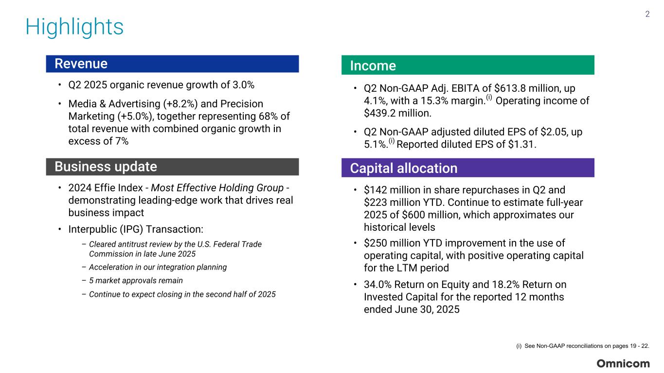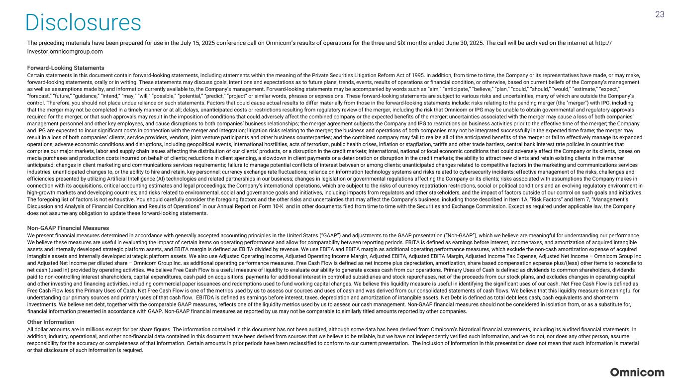 23Disclosures The preceding materials have been prepared for use in the July 15, 2025 conference call on Omnicom’s results of operations for the three and six months ended June 30, 2025. The call will be archived on the internet at http:// investor.omnicomgroup.com Forward-Looking Statements Certain statements in this document contain forward-looking statements, including statements within the meaning of the Private Securities Litigation Reform Act of 1995. In addition, from time to time, the Company or its representatives have made, or may make, forward-looking statements, orally or in writing. These statements may discuss goals, intentions and expectations as to future plans, trends, events, results of operations or financial condition, or otherwise, based on current beliefs of the Company’s management as well as assumptions made by, and information currently available to, the Company’s management. Forward-looking statements may be accompanied by words such as “aim,” “anticipate,” “believe,” “plan,” “could,” “should,” “would,” “estimate,” “expect,” “forecast,” “future,” “guidance,” “intend,” “may,” “will,” “possible,” “potential,” “predict,” “project” or similar words, phrases or expressions. These forward-looking statements are subject to various risks and uncertainties, many of which are outside the Company’s control. Therefore, you should not place undue reliance on such statements. Factors that could cause actual results to differ materially from those in the forward-looking statements include: risks relating to the pending merger (the "merger") with IPG, including: that the merger may not be completed in a timely manner or at all; delays, unanticipated costs or restrictions resulting from regulatory review of the merger, including the risk that Omnicom or IPG may be unable to obtain governmental and regulatory approvals required for the merger, or that such approvals may result in the imposition of conditions that could adversely affect the combined company or the expected benefits of the merger; uncertainties associated with the merger may cause a loss of both companies’ management personnel and other key employees, and cause disruptions to both companies’ business relationships; the merger agreement subjects the Company and IPG to restrictions on business activities prior to the effective time of the merger; the Company and IPG are expected to incur significant costs in connection with the merger and integration; litigation risks relating to the merger; the business and operations of both companies may not be integrated successfully in the expected time frame; the merger may result in a loss of both companies’ clients, service providers, vendors, joint venture participants and other business counterparties; and the combined company may fail to realize all of the anticipated benefits of the merger or fail to effectively manage its expanded operations; adverse economic conditions and disruptions, including geopolitical events, international hostilities, acts of terrorism, public health crises, inflation or stagflation, tariffs and other trade barriers, central bank interest rate policies in countries that comprise our major markets, labor and supply chain issues affecting the distribution of our clients’ products, or a disruption in the credit markets; international, national or local economic conditions that could adversely affect the Company or its clients, losses on media purchases and production costs incurred on behalf of clients; reductions in client spending, a slowdown in client payments or a deterioration or disruption in the credit markets; the ability to attract new clients and retain existing clients in the manner anticipated; changes in client marketing and communications services requirements; failure to manage potential conflicts of interest between or among clients; unanticipated changes related to competitive factors in the marketing and communications services industries; unanticipated changes to, or the ability to hire and retain, key personnel; currency exchange rate fluctuations; reliance on information technology systems and risks related to cybersecurity incidents; effective management of the risks, challenges and efficiencies presented by utilizing Artificial Intelligence (AI) technologies and related partnerships in our business; changes in legislation or governmental regulations affecting the Company or its clients; risks associated with assumptions the Company makes in connection with its acquisitions, critical accounting estimates and legal proceedings; the Company’s international operations, which are subject to the risks of currency repatriation restrictions, social or political conditions and an evolving regulatory environment in high-growth markets and developing countries; and risks related to environmental, social and governance goals and initiatives, including impacts from regulators and other stakeholders, and the impact of factors outside of our control on such goals and initiatives. The foregoing list of factors is not exhaustive. You should carefully consider the foregoing factors and the other risks and uncertainties that may affect the Company’s business, including those described in Item 1A, “Risk Factors” and Item 7, “Management’s Discussion and Analysis of Financial Condition and Results of Operations” in our Annual Report on Form 10-K and in other documents filed from time to time with the Securities and Exchange Commission. Except as required under applicable law, the Company does not assume any obligation to update these forward-looking statements. Non-GAAP Financial Measures We present financial measures determined in accordance with generally accepted accounting principles in the United States (“GAAP”) and adjustments to the GAAP presentation (“Non-GAAP”), which we believe are meaningful for understanding our performan