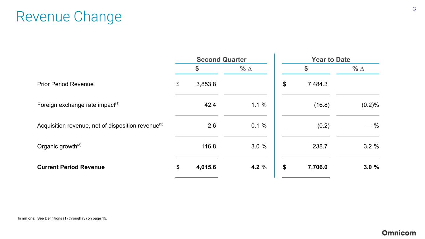 2 Highlights Revenue • Q2 2025 organic revenue growth of 3.0% • Media & Advertising (+8.2%) and Precision Marketing (+5.0%), together representing 68% of total revenue with combined organic growth in excess of 7% Income • Q2 Non-GAAP Adj. EBITA of $613.8 million, up 4.1%, with a 15.3% margin.(i) Operating income of $439.2 million. • Q2 Non-GAAP adjusted diluted EPS of $2.05, up 5.1%.(i) Reported diluted EPS of $1.31. Business update • 2024 Effie Index - Most Effective Holding Group - demonstrating leading-edge work that drives real business impact • Interpublic (IPG) Transaction: – Cleared antitrust review by the U.S. Federal Trade Commission in late June 2025 – Acceleration in our integration planning – 5 market approvals remain – Continue to expect closing in the second half of 2025 Capital allocation • $142 million in share repurchases in Q2 and $223 million YTD. Continue to estimate full-year 2025 of $600 million, which approximates our historical levels • $250 million YTD improvement in the use of operating capital, with positive operating capital for the LTM period • 34.0% Return on Equity and 18.2% Return on Invested Capital for the reported 12 months ended June 30, 2025 (i) See Non-GAAP reconciliations on pages 19 - 22.