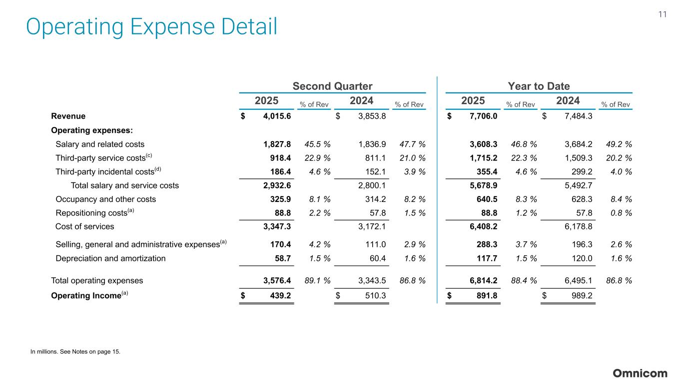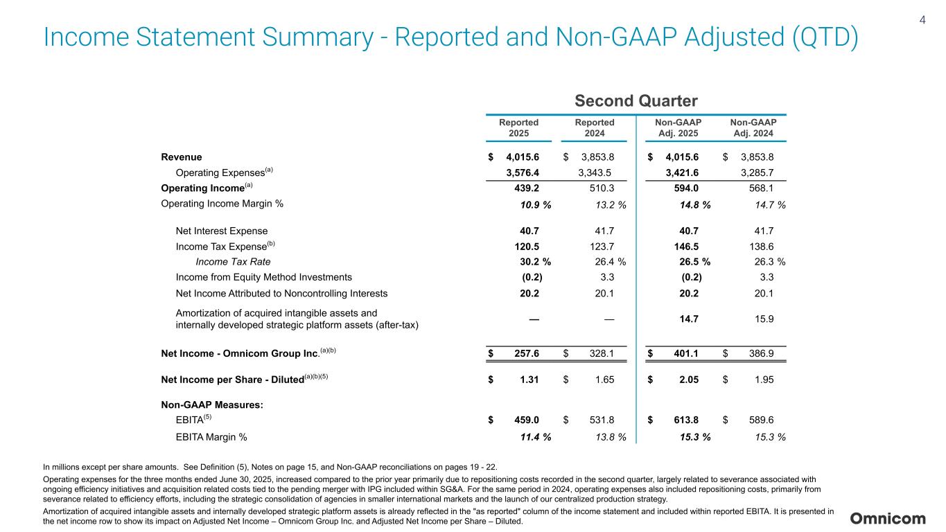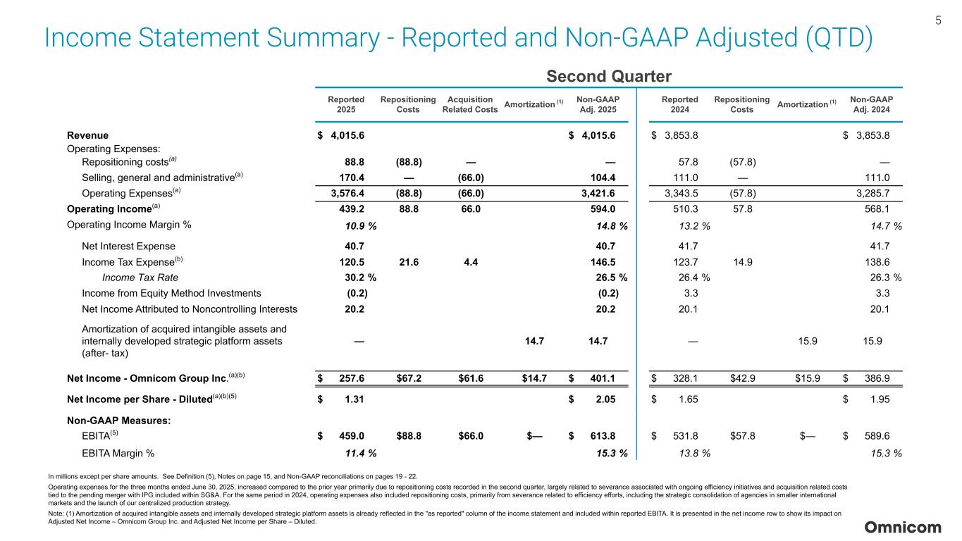 4 Second Quarter Reported 2025 Reported 2024 Non-GAAP Adj. 2025 Non-GAAP Adj. 2024 Revenue $ 4,015.6 $ 3,853.8 $ 4,015.6 $ 3,853.8 Operating Expenses(a) 3,576.4 3,343.5 3,421.6 3,285.7 Operating Income(a) 439.2 510.3 594.0 568.1 Operating Income Margin % 10.9 % 13.2 % 14.8 % 14.7 % Net Interest Expense 40.7 41.7 40.7 41.7 Income Tax Expense(b) 120.5 123.7 146.5 138.6 Income Tax Rate 30.2 % 26.4 % 26.5 % 26.3 % Income from Equity Method Investments (0.2) 3.3 (0.2) 3.3 Net Income Attributed to Noncontrolling Interests 20.2 20.1 20.2 20.1 Amortization of acquired intangible assets and internally developed strategic platform assets (after-tax) — — 14.7 15.9 Net Income - Omnicom Group Inc.(a)(b) $ 257.6 $ 328.1 $ 401.1 $ 386.9 Net Income per Share - Diluted(a)(b)(5) $ 1.31 $ 1.65 $ 2.05 $ 1.95 Non-GAAP Measures: EBITA(5) $ 459.0 $ 531.8 $ 613.8 $ 589.6 EBITA Margin % 11.4 % 13.8 % 15.3 % 15.3 % Income Statement Summary - Reported and Non-GAAP Adjusted (QTD) In millions except per share amounts. See Definition (5), Notes on page 15, and Non-GAAP reconciliations on pages 19 - 22. Operating expenses for the three months ended June 30, 2025, increased compared to the prior year primarily due to repositioning costs recorded in the second quarter, largely related to severance associated with ongoing efficiency initiatives and acquisition related costs tied to the pending merger with IPG included within SG&A. For the same period in 2024, operating expenses also included repositioning costs, primarily from severance related to efficiency efforts, including the strategic consolidation of agencies in smaller international markets and the launch of our centralized production strategy. Amortization of acquired intangible assets and internally developed strategic platform assets is already reflected in the "as reported" column of the income statement and included within reported EBITA. It is presented in the net income row to show its impact on Adjusted Net Income – Omnicom Group Inc. and Adjusted Net Income per Share – Diluted.