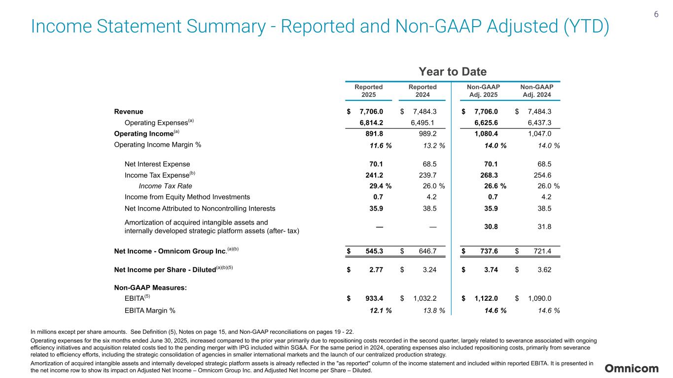 5 Second Quarter Reported 2025 Repositioning Costs Acquisition Related Costs Amortization (1) Non-GAAP Adj. 2025 Reported 2024 Repositioning Costs Amortization (1) Non-GAAP Adj. 2024 Revenue $ 4,015.6 $ 4,015.6 $ 3,853.8 $ 3,853.8 Operating Expenses: Repositioning costs(a) 88.8 (88.8) — — 57.8 (57.8) — Selling, general and administrative(a) 170.4 — (66.0) 104.4 111.0 — 111.0 Operating Expenses(a) 3,576.4 (88.8) (66.0) 3,421.6 3,343.5 (57.8) 3,285.7 Operating Income(a) 439.2 88.8 66.0 594.0 510.3 57.8 568.1 Operating Income Margin % 10.9 % 14.8 % 13.2 % 14.7 % Net Interest Expense 40.7 40.7 41.7 41.7 Income Tax Expense(b) 120.5 21.6 4.4 146.5 123.7 14.9 138.6 Income Tax Rate 30.2 % 26.5 % 26.4 % 26.3 % Income from Equity Method Investments (0.2) (0.2) 3.3 3.3 Net Income Attributed to Noncontrolling Interests 20.2 20.2 20.1 20.1 Amortization of acquired intangible assets and internally developed strategic platform assets (after- tax) — 14.7 14.7 — 15.9 15.9 Net Income - Omnicom Group Inc.(a)(b) $ 257.6 $67.2 $61.6 $14.7 $ 401.1 $ 328.1 $42.9 $15.9 $ 386.9 Net Income per Share - Diluted(a)(b)(5) $ 1.31 $ 2.05 $ 1.65 $ 1.95 Non-GAAP Measures: EBITA(5) $ 459.0 $88.8 $66.0 $— $ 613.8 $ 531.8 $57.8 $— $ 589.6 EBITA Margin % 11.4 % 15.3 % 13.8 % 15.3 % Income Statement Summary - Reported and Non-GAAP Adjusted (QTD) In millions except per share amounts. See Definition (5), Notes on page 15, and Non-GAAP reconciliations on pages 19 - 22. Operating expenses for the three months ended June 30, 2025, increased compared to the prior year primarily due to repositioning costs recorded in the second quarter, largely related to severance associated with ongoing efficiency initiatives and acquisition related costs tied to the pending merger with IPG included within SG&A. For the same period in 2024, operating expenses also included repositioning costs, primarily from severance related to efficiency efforts, including the strategic consolidation of agencies in smaller international markets and the launch of our centralized production strategy. Note: (1) Amortization of acquired intangible assets and internally developed strategic platform assets is already reflected in the "as reported" column of the income statement and included within reported EBITA. It is presented in the net income row to show its impact on Adjusted Net Income – Omnicom Group Inc. and Adjusted Net Income per Share – Diluted.