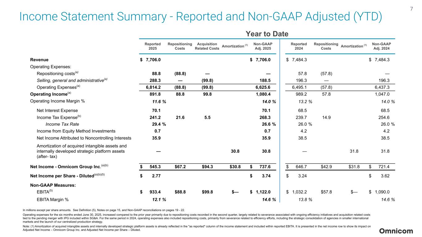 6 Year to Date Reported 2025 Reported 2024 Non-GAAP Adj. 2025 Non-GAAP Adj. 2024 Revenue $ 7,706.0 $ 7,484.3 $ 7,706.0 $ 7,484.3 Operating Expenses(a) 6,814.2 6,495.1 6,625.6 6,437.3 Operating Income(a) 891.8 989.2 1,080.4 1,047.0 Operating Income Margin % 11.6 % 13.2 % 14.0 % 14.0 % Net Interest Expense 70.1 68.5 70.1 68.5 Income Tax Expense(b) 241.2 239.7 268.3 254.6 Income Tax Rate 29.4 % 26.0 % 26.6 % 26.0 % Income from Equity Method Investments 0.7 4.2 0.7 4.2 Net Income Attributed to Noncontrolling Interests 35.9 38.5 35.9 38.5 Amortization of acquired intangible assets and internally developed strategic platform assets (after- tax) — — 30.8 31.8 Net Income - Omnicom Group Inc.(a)(b) $ 545.3 $ 646.7 $ 737.6 $ 721.4 Net Income per Share - Diluted(a)(b)(5) $ 2.77 $ 3.24 $ 3.74 $ 3.62 Non-GAAP Measures: EBITA(5) $ 933.4 $ 1,032.2 $ 1,122.0 $ 1,090.0 EBITA Margin % 12.1 % 13.8 % 14.6 % 14.6 % Income Statement Summary - Reported and Non-GAAP Adjusted (YTD) In millions except per share amounts. See Definition (5), Notes on page 15, and Non-GAAP reconciliations on pages 19 - 22. Operating expenses for the six months ended June 30, 2025, increased compared to the prior year primarily due to repositioning costs recorded in the second quarter, largely related to severance associated with ongoing efficiency initiatives and acquisition related costs tied to the pending merger with IPG included within SG&A. For the same period in 2024, operating expenses also included repositioning costs, primarily from severance related to efficiency efforts, including the strategic consolidation of agencies in smaller international markets and the launch of our centralized production strategy. Amortization of acquired intangible assets and internally developed strategic platform assets is already reflected in the "as reported" column of the income statement and included within reported EBITA. It is presented in the net income row to show its impact on Adjusted Net Income – Omnicom Group Inc. and Adjusted Net Income per Share – Diluted.