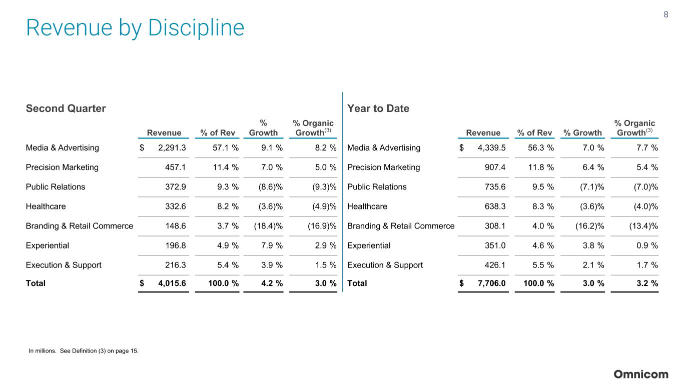 7 Year to Date Reported 2025 Repositioning Costs Acquisition Related Costs Amortization (1) Non-GAAP Adj. 2025 Reported 2024 Repositioning Costs Amortization (1) Non-GAAP Adj. 2024 Revenue $ 7,706.0 $ 7,706.0 $ 7,484.3 $ 7,484.3 Operating Expenses: Repositioning costs(a) 88.8 (88.8) — — 57.8 (57.8) — Selling, general and administrative(a) 288.3 — (99.8) 188.5 196.3 — 196.3 Operating Expenses(a) 6,814.2 (88.8) (99.8) 6,625.6 6,495.1 (57.8) 6,437.3 Operating Income(a) 891.8 88.8 99.8 1,080.4 989.2 57.8 1,047.0 Operating Income Margin % 11.6 % 14.0 % 13.2 % 14.0 % Net Interest Expense 70.1 70.1 68.5 68.5 Income Tax Expense(b) 241.2 21.6 5.5 268.3 239.7 14.9 254.6 Income Tax Rate 29.4 % 26.6 % 26.0 % 26.0 % Income from Equity Method Investments 0.7 0.7 4.2 4.2 Net Income Attributed to Noncontrolling Interests 35.9 35.9 38.5 38.5 Amortization of acquired intangible assets and internally developed strategic platform assets (after- tax) — 30.8 30.8 — 31.8 31.8 Net Income - Omnicom Group Inc.(a)(b) $ 545.3 $67.2 $94.3 $30.8 $ 737.6 $ 646.7 $42.9 $31.8 $ 721.4 Net Income per Share - Diluted(a)(b)(5) $ 2.77 $ 3.74 $ 3.24 $ 3.62 Non-GAAP Measures: EBITA(5) $ 933.4 $88.8 $99.8 $— $ 1,122.0 $ 1,032.2 $57.8 $— $ 1,090.0 EBITA Margin % 12.1 % 14.6 % 13.8 % 14.6 % Income Statement Summary - Reported and Non-GAAP Adjusted (YTD) In millions except per share amounts. See Definition (5), Notes on page 15, and Non-GAAP reconciliations on pages 19 - 22. Operating expenses for the six months ended June 30, 2025, increased compared to the prior year primarily due to repositioning costs recorded in the second quarter, largely related to severance associated with ongoing efficiency initiatives and acquisition related costs tied to the pending merger with IPG included within SG&A. For the same period in 2024, operating expenses also included repositioning costs, primarily from severance related to efficiency efforts, including the strategic consolidation of agencies in smaller international markets and the launch of our centralized production strategy. Note: (1) Amortization of acquired intangible assets and internally developed strategic platform assets is already reflected in the "as reported" column of the income statement and included within reported EBITA. It is presented in the net income row to show its impact on Adjusted Net Income – Omnicom Group Inc. and Adjusted Net Income per Share – Diluted.