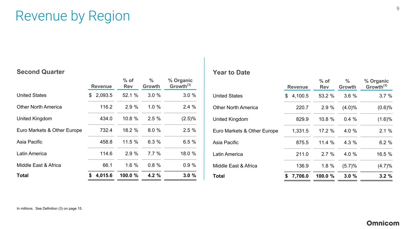 8 Revenue by Discipline Second Quarter Year to Date Revenue % of Rev % Growth % Organic Growth(3) Revenue % of Rev % Growth % Organic Growth(3) Media & Advertising $ 2,291.3 57.1 % 9.1 % 8.2 % Media & Advertising $ 4,339.5 56.3 % 7.0 % 7.7 % Precision Marketing 457.1 11.4 % 7.0 % 5.0 % Precision Marketing 907.4 11.8 % 6.4 % 5.4 % Public Relations 372.9 9.3 % (8.6) % (9.3) % Public Relations 735.6 9.5 % (7.1) % (7.0) % Healthcare 332.6 8.2 % (3.6) % (4.9) % Healthcare 638.3 8.3 % (3.6) % (4.0) % Branding & Retail Commerce 148.6 3.7 % (18.4) % (16.9) % Branding & Retail Commerce 308.1 4.0 % (16.2) % (13.4) % Experiential 196.8 4.9 % 7.9 % 2.9 % Experiential 351.0 4.6 % 3.8 % 0.9 % Execution & Support 216.3 5.4 % 3.9 % 1.5 % Execution & Support 426.1 5.5 % 2.1 % 1.7 % Total $ 4,015.6 100.0 % 4.2 % 3.0 % Total $ 7,706.0 100.0 % 3.0 % 3.2 % In millions. See Definition (3) on page 15.