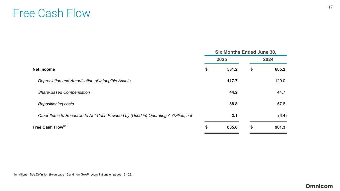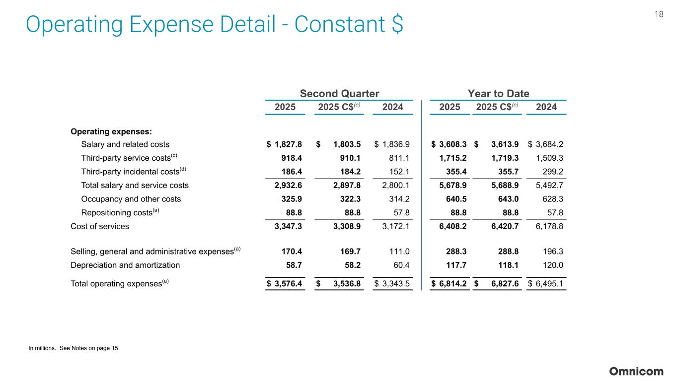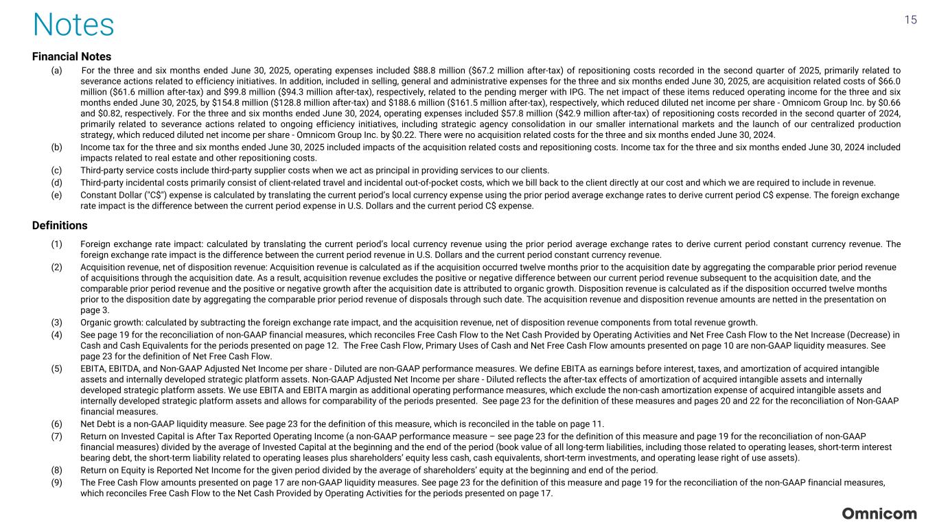 15Notes (a) For the three and six months ended June 30, 2025, operating expenses included $88.8 million ($67.2 million after-tax) of repositioning costs recorded in the second quarter of 2025, primarily related to severance actions related to efficiency initiatives. In addition, included in selling, general and administrative expenses for the three and six months ended June 30, 2025, are acquisition related costs of $66.0 million ($61.6 million after-tax) and $99.8 million ($94.3 million after-tax), respectively, related to the pending merger with IPG. The net impact of these items reduced operating income for the three and six months ended June 30, 2025, by $154.8 million ($128.8 million after-tax) and $188.6 million ($161.5 million after-tax), respectively, which reduced diluted net income per share - Omnicom Group Inc. by $0.66 and $0.82, respectively. For the three and six months ended June 30, 2024, operating expenses included $57.8 million ($42.9 million after-tax) of repositioning costs recorded in the second quarter of 2024, primarily related to severance actions related to ongoing efficiency initiatives, including strategic agency consolidation in our smaller international markets and the launch of our centralized production strategy, which reduced diluted net income per share - Omnicom Group Inc. by $0.22. There were no acquisition related costs for the three and six months ended June 30, 2024. (b) Income tax for the three and six months ended June 30, 2025 included impacts of the acquisition related costs and repositioning costs. Income tax for the three and six months ended June 30, 2024 included impacts related to real estate and other repositioning costs. (c) Third-party service costs include third-party supplier costs when we act as principal in providing services to our clients. (d) Third-party incidental costs primarily consist of client-related travel and incidental out-of-pocket costs, which we bill back to the client directly at our cost and which we are required to include in revenue. (e) Constant Dollar ("C$") expense is calculated by translating the current period’s local currency expense using the prior period average exchange rates to derive current period C$ expense. The foreign exchange rate impact is the difference between the current period expense in U.S. Dollars and the current period C$ expense. Financial Notes Definitions (1) Foreign exchange rate impact: calculated by translating the current period’s local currency revenue using the prior period average exchange rates to derive current period constant currency revenue. The foreign exchange rate impact is the difference between the current period revenue in U.S. Dollars and the current period constant currency revenue. (2) Acquisition revenue, net of disposition revenue: Acquisition revenue is calculated as if the acquisition occurred twelve months prior to the acquisition date by aggregating the comparable prior period revenue of acquisitions through the acquisition date. As a result, acquisition revenue excludes the positive or negative difference between our current period revenue subsequent to the acquisition date, and the comparable prior period revenue and the positive or negative growth after the acquisition date is attributed to organic growth. Disposition revenue is calculated as if the disposition occurred twelve months prior to the disposition date by aggregating the comparable prior period revenue of disposals through such date. The acquisition revenue and disposition revenue amounts are netted in the presentation on page 3. (3) Organic growth: calculated by subtracting the foreign exchange rate impact, and the acquisition revenue, net of disposition revenue components from total revenue growth. (4) See page 19 for the reconciliation of non-GAAP financial measures, which reconciles Free Cash Flow to the Net Cash Provided by Operating Activities and Net Free Cash Flow to the Net Increase (Decrease) in Cash and Cash Equivalents for the periods presented on page 12. The Free Cash Flow, Primary Uses of Cash and Net Free Cash Flow amounts presented on page 10 are non-GAAP liquidity measures. See page 23 for the definition of Net Free Cash Flow. (5) EBITA, EBITDA, and Non-GAAP Adjusted Net Income per share - Diluted are non-GAAP performance measures. We define EBITA as earnings before interest, taxes, and amortization of acquired intangible assets and internally developed strategic platform assets. Non-GAAP Adjusted Net Income per share - Diluted reflects the after-tax effects of amortization of acquired intangible assets and internally developed strategic platform assets. We use EBITA and EBITA margin as additional operating performance measures, which exclude the non-cash amortization expense of acquired intangible assets and internally developed strategic platform assets and allows for comparability of the periods presented. See page 23 for the definition of these measures and pages 20 and 22 for the reconciliation of Non-GAAP financial measures. (6) Net Debt is a non-GAAP liquidity measure. See page 23 for the definition of this measure, which is reconciled in the table on page 11. (7) Return on Invested Capital is After Tax Reported Operating Income (a non-GAAP performance measure – see page 23 for the definition of this measure and page 19 for the reconciliation of non-GAAP financial measures) divided by the average of Invested Capital at the beginning and the end of the period (book value of all long-term liabilities, including those related to operating leases, short-term interest bearing debt, the short-term liability related to operating leases plus shareholders’ equity less cash, cash equivalents, short-term investments, and operating lease right of use assets). (8) Return on Equity is Reported Net Income for the given period divided by the average of shareholders’ equity at the beginning and end of the period. (9) The Free Cash Flow amounts presented on page 17 are non-G