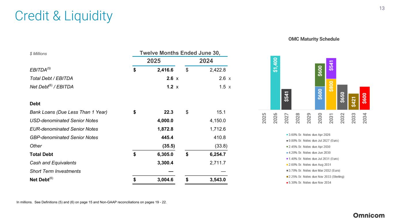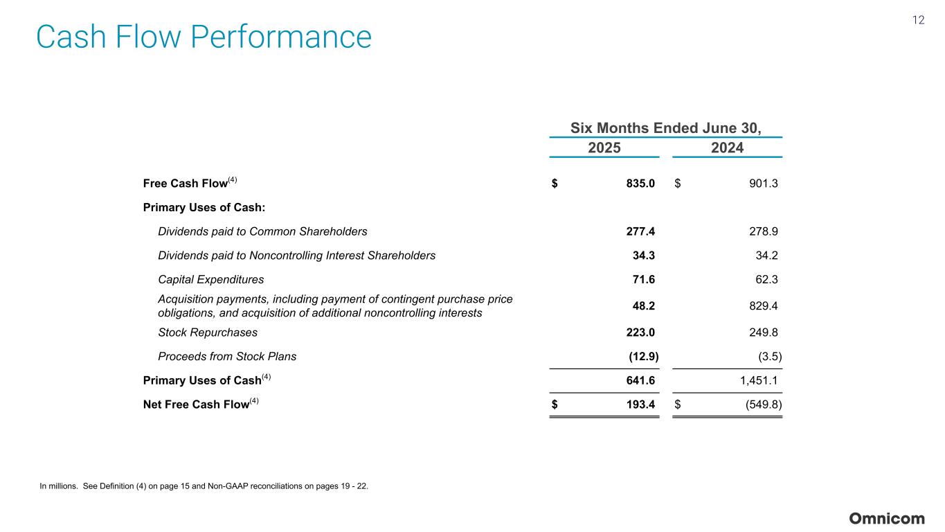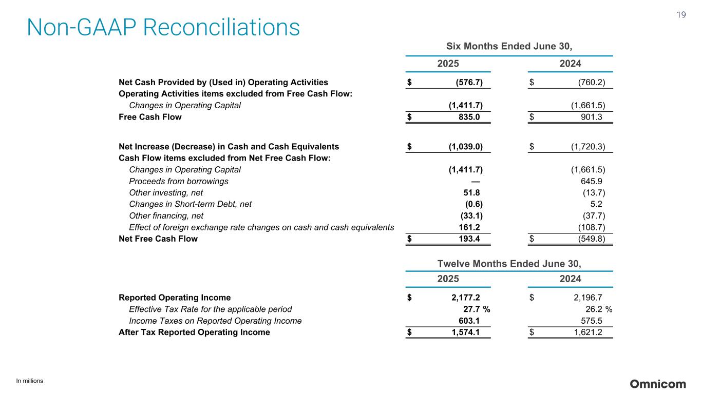 15Notes (a) For the three and six months ended June 30, 2025, operating expenses included $88.8 million ($67.2 million after-tax) of repositioning costs recorded in the second quarter of 2025, primarily related to severance actions related to efficiency initiatives. In addition, included in selling, general and administrative expenses for the three and six months ended June 30, 2025, are acquisition related costs of $66.0 million ($61.6 million after-tax) and $99.8 million ($94.3 million after-tax), respectively, related to the pending merger with IPG. The net impact of these items reduced operating income for the three and six months ended June 30, 2025, by $154.8 million ($128.8 million after-tax) and $188.6 million ($161.5 million after-tax), respectively, which reduced diluted net income per share - Omnicom Group Inc. by $0.66 and $0.82, respectively. For the three and six months ended June 30, 2024, operating expenses included $57.8 million ($42.9 million after-tax) of repositioning costs recorded in the second quarter of 2024, primarily related to severance actions related to ongoing efficiency initiatives, including strategic agency consolidation in our smaller international markets and the launch of our centralized production strategy, which reduced diluted net income per share - Omnicom Group Inc. by $0.22. There were no acquisition related costs for the three and six months ended June 30, 2024. (b) Income tax for the three and six months ended June 30, 2025 included impacts of the acquisition related costs and repositioning costs. Income tax for the three and six months ended June 30, 2024 included impacts related to real estate and other repositioning costs. (c) Third-party service costs include third-party supplier costs when we act as principal in providing services to our clients. (d) Third-party incidental costs primarily consist of client-related travel and incidental out-of-pocket costs, which we bill back to the client directly at our cost and which we are required to include in revenue. (e) Constant Dollar ("C$") expense is calculated by translating the current period’s local currency expense using the prior period average exchange rates to derive current period C$ expense. The foreign exchange rate impact is the difference between the current period expense in U.S. Dollars and the current period C$ expense. Financial Notes Definitions (1) Foreign exchange rate impact: calculated by translating the current period’s local currency revenue using the prior period average exchange rates to derive current period constant currency revenue. The foreign exchange rate impact is the difference between the current period revenue in U.S. Dollars and the current period constant currency revenue. (2) Acquisition revenue, net of disposition revenue: Acquisition revenue is calculated as if the acquisition occurred twelve months prior to the acquisition date by aggregating the comparable prior period revenue of acquisitions through the acquisition date. As a result, acquisition revenue excludes the positive or negative difference between our current period revenue subsequent to the acquisition date, and the comparable prior period revenue and the positive or negative growth after the acquisition date is attributed to organic growth. Disposition revenue is calculated as if the disposition occurred twelve months prior to the disposition date by aggregating the comparable prior period revenue of disposals through such date. The acquisition revenue and disposition revenue amounts are netted in the presentation on page 3. (3) Organic growth: calculated by subtracting the foreign exchange rate impact, and the acquisition revenue, net of disposition revenue components from total revenue growth. (4) See page 19 for the reconciliation of non-GAAP financial measures, which reconciles Free Cash Flow to the Net Cash Provided by Operating Activities and Net Free Cash Flow to the Net Increase (Decrease) in Cash and Cash Equivalents for the periods presented on page 12. The Free Cash Flow, Primary Uses of Cash and Net Free Cash Flow amounts presented on page 10 are non-GAAP liquidity measures. See page 23 for the definition of Net Free Cash Flow. (5) EBITA, EBITDA, and Non-GAAP Adjusted Net Income per share - Diluted are non-GAAP performance measures. We define EBITA as earnings before interest, taxes, and amortization of acquired intangible assets and internally developed strategic platform assets. Non-GAAP Adjusted Net Income per share - Diluted reflects the after-tax effects of amortization of acquired intangible assets and internally developed strategic platform assets. We use EBITA and EBITA margin as additional operating performance measures, which exclude the non-cash amortization expense of acquired intangible assets and internally developed strategic platform assets and allows for comparability of the periods presented. See page 23 for the definition of these measures and pages 20 and 22 for the reconciliation of Non-GAAP financial measures. (6) Net Debt is a non-GAAP liquidity measure. See page 23 for the definition of this measure, which is reconciled in the table on page 11. (7) Return on Invested Capital is After Tax Reported Operating Income (a non-GAAP performance measure – see page 23 for the definition of this measure and page 19 for the reconciliation of non-GAAP financial measures) divided by the average of Invested Capital at the beginning and the end of the period (book value of all long-term liabilities, including those related to operating leases, short-term interest bearing debt, the short-term liability related to operating leases plus shareholders’ equity less cash, cash equivalents, short-term investments, and operating lease right of use assets). (8) Return on Equity is Reported Net Income for the given period divided by the average of shareholders’ equity at the beginning and end of the period. (9) The Free Cash Flow amounts presented on page 17 are non-G