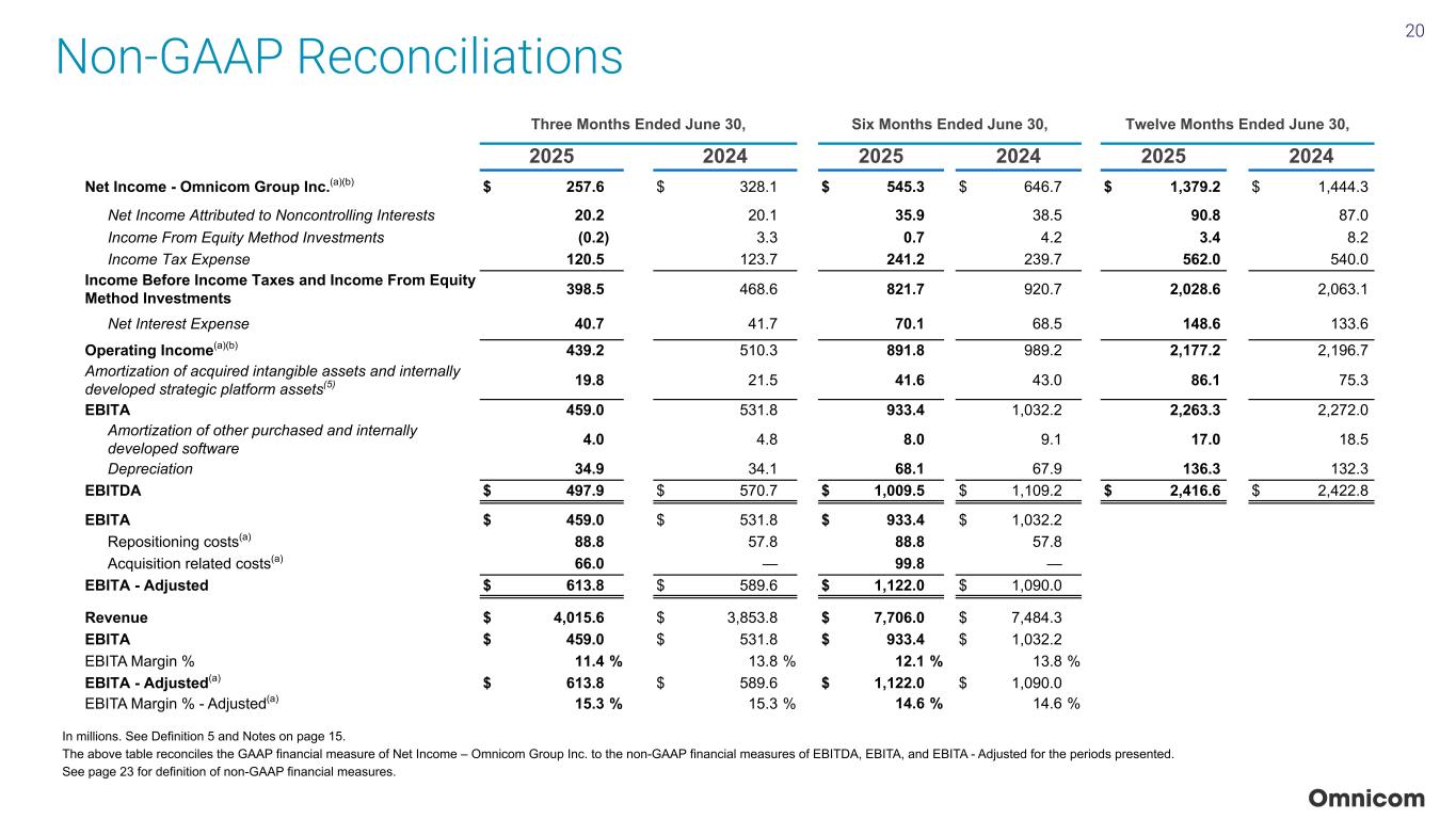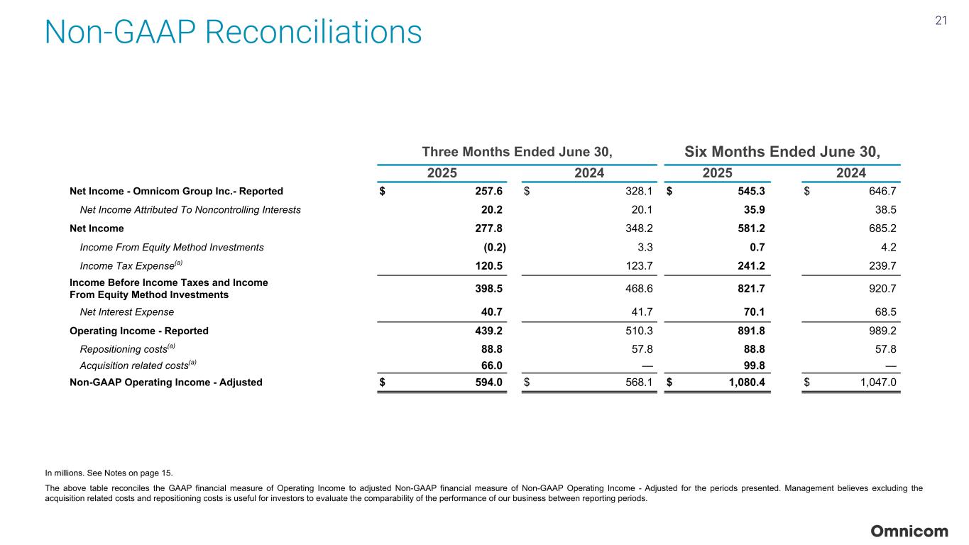 20 Non-GAAP Reconciliations In millions. See Definition 5 and Notes on page 15. The above table reconciles the GAAP financial measure of Net Income – Omnicom Group Inc. to the non-GAAP financial measures of EBITDA, EBITA, and EBITA - Adjusted for the periods presented. See page 23 for definition of non-GAAP financial measures. Three Months Ended June 30, Six Months Ended June 30, Twelve Months Ended June 30, 2025 2024 2025 2024 2025 2024 Net Income - Omnicom Group Inc.(a)(b) $ 257.6 $ 328.1 $ 545.3 $ 646.7 $ 1,379.2 $ 1,444.3 Net Income Attributed to Noncontrolling Interests 20.2 20.1 35.9 38.5 90.8 87.0 Income From Equity Method Investments (0.2) 3.3 0.7 4.2 3.4 8.2 Income Tax Expense 120.5 123.7 241.2 239.7 562.0 540.0 Income Before Income Taxes and Income From Equity Method Investments 398.5 468.6 821.7 920.7 2,028.6 2,063.1 Net Interest Expense 40.7 41.7 70.1 68.5 148.6 133.6 Operating Income(a)(b) 439.2 510.3 891.8 989.2 2,177.2 2,196.7 Amortization of acquired intangible assets and internally developed strategic platform assets(5) 19.8 21.5 41.6 43.0 86.1 75.3 EBITA 459.0 531.8 933.4 1,032.2 2,263.3 2,272.0 Amortization of other purchased and internally developed software 4.0 4.8 8.0 9.1 17.0 18.5 Depreciation 34.9 34.1 68.1 67.9 136.3 132.3 EBITDA $ 497.9 $ 570.7 $ 1,009.5 $ 1,109.2 $ 2,416.6 $ 2,422.8 EBITA $ 459.0 $ 531.8 $ 933.4 $ 1,032.2 Repositioning costs(a) 88.8 57.8 88.8 57.8 Acquisition related costs(a) 66.0 — 99.8 — EBITA - Adjusted $ 613.8 $ 589.6 $ 1,122.0 $ 1,090.0 Revenue $ 4,015.6 $ 3,853.8 $ 7,706.0 $ 7,484.3 EBITA $ 459.0 $ 531.8 $ 933.4 $ 1,032.2 EBITA Margin % 11.4 % 13.8 % 12.1 % 13.8 % EBITA - Adjusted(a) $ 613.8 $ 589.6 $ 1,122.0 $ 1,090.0 EBITA Margin % - Adjusted(a) 15.3 % 15.3 % 14.6 % 14.6 %