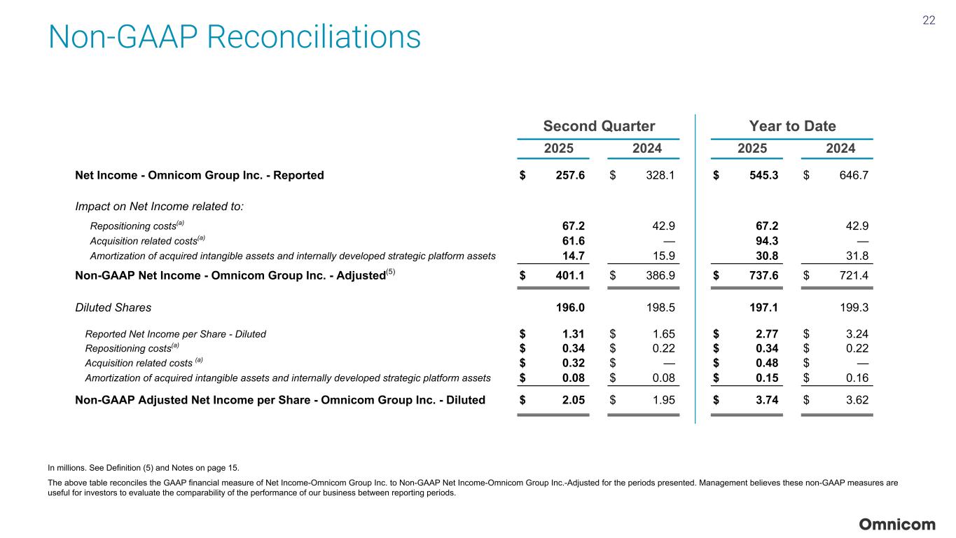 21Non-GAAP Reconciliations In millions. See Notes on page 15. The above table reconciles the GAAP financial measure of Operating Income to adjusted Non-GAAP financial measure of Non-GAAP Operating Income - Adjusted for the periods presented. Management believes excluding the acquisition related costs and repositioning costs is useful for investors to evaluate the comparability of the performance of our business between reporting periods. Three Months Ended June 30, Six Months Ended June 30, 2025 2024 2025 2024 Net Income - Omnicom Group Inc.- Reported $ 257.6 $ 328.1 $ 545.3 $ 646.7 Net Income Attributed To Noncontrolling Interests 20.2 20.1 35.9 38.5 Net Income 277.8 348.2 581.2 685.2 Income From Equity Method Investments (0.2) 3.3 0.7 4.2 Income Tax Expense(a) 120.5 123.7 241.2 239.7 Income Before Income Taxes and Income From Equity Method Investments 398.5 468.6 821.7 920.7 Net Interest Expense 40.7 41.7 70.1 68.5 Operating Income - Reported 439.2 510.3 891.8 989.2 Repositioning costs(a) 88.8 57.8 88.8 57.8 Acquisition related costs(a) 66.0 — 99.8 — Non-GAAP Operating Income - Adjusted $ 594.0 $ 568.1 $ 1,080.4 $ 1,047.0