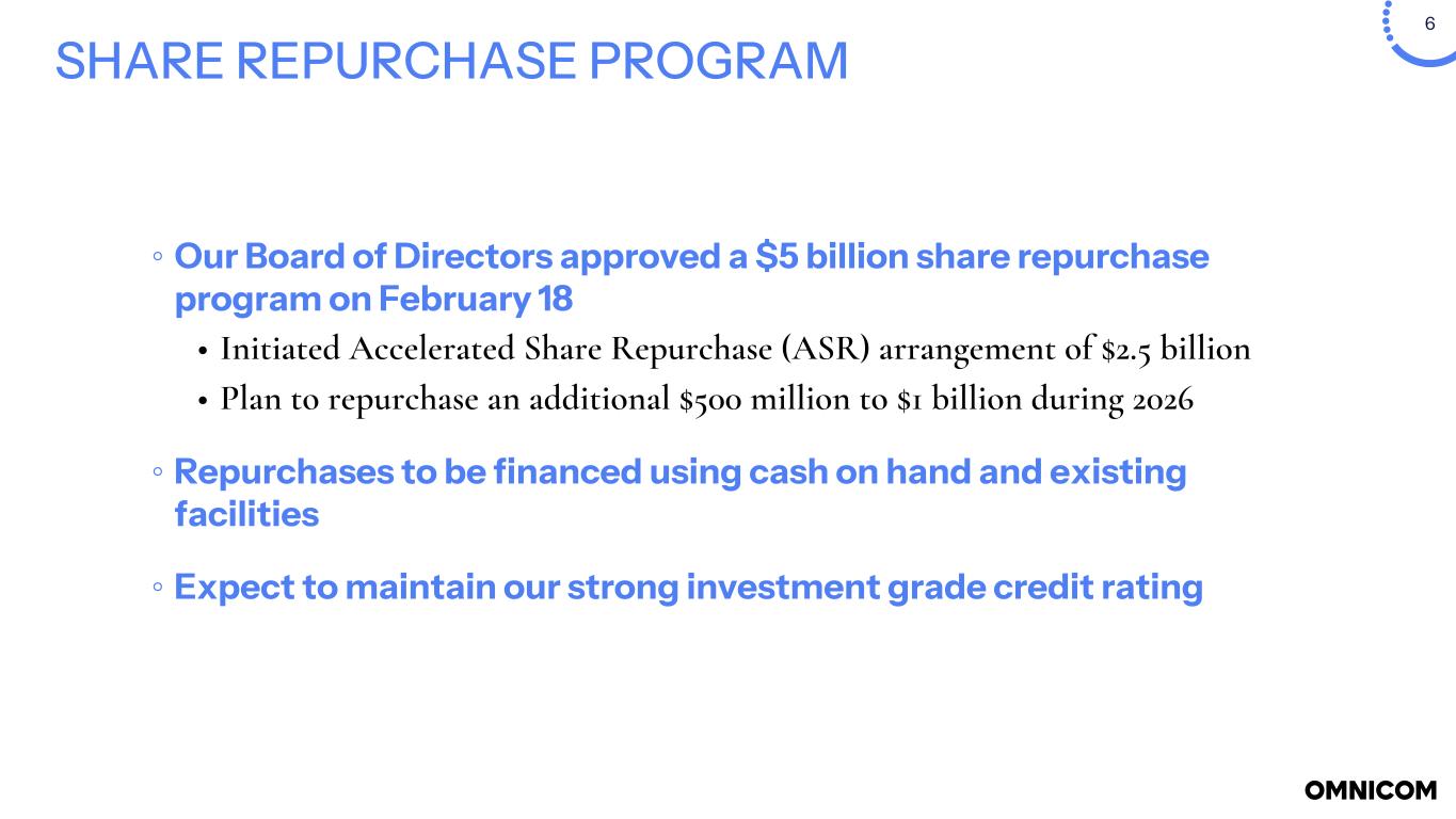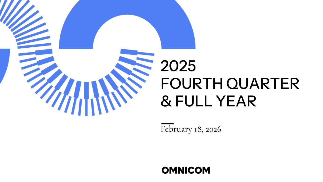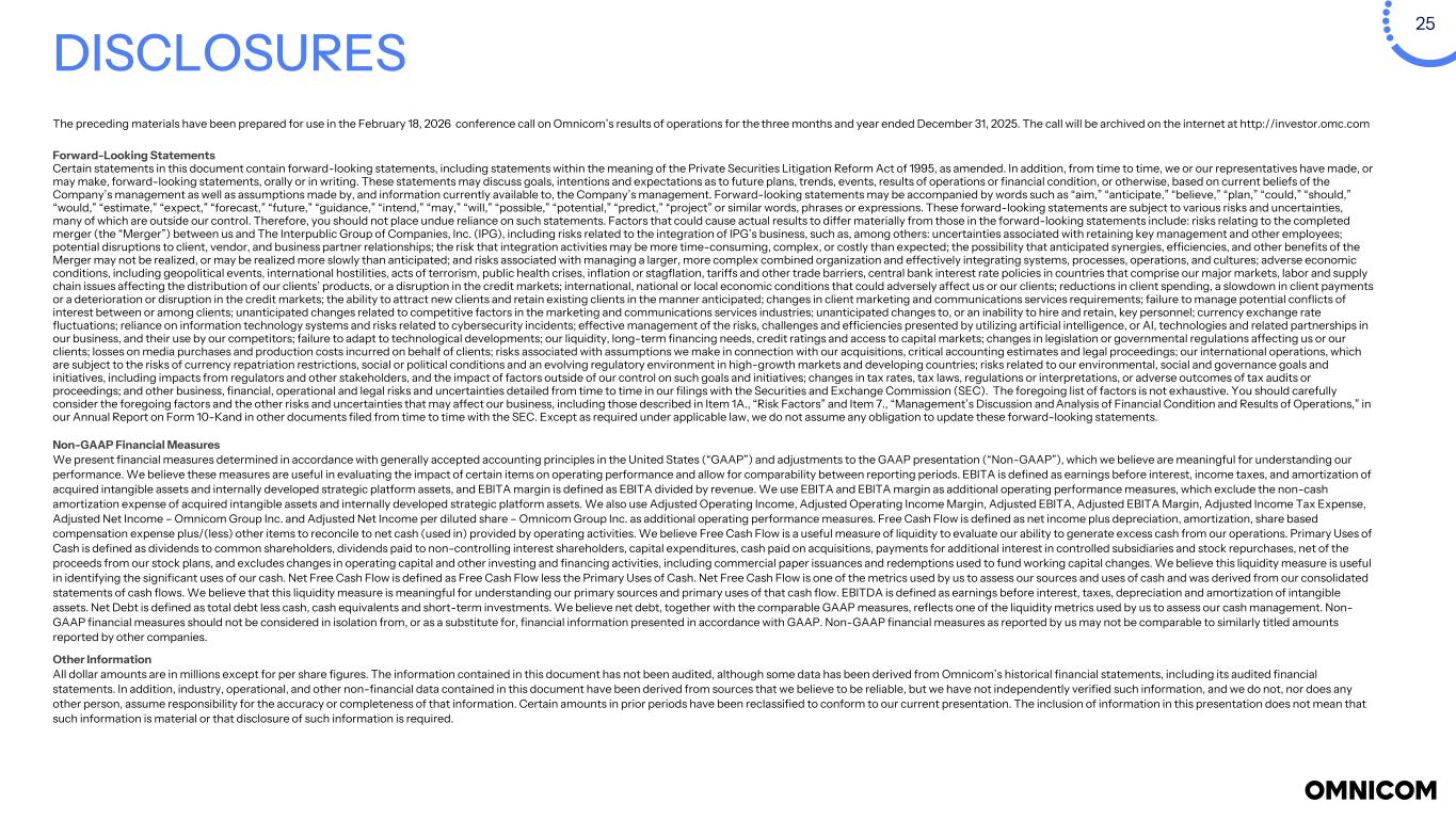 25 DISCLOSURES The preceding materials have been prepared for use in the February 18, 2026 conference call on Omnicom’s results of operations for the three months and year ended December 31, 2025. The call will be archived on the internet at http://investor.omc.com Forward-Looking Statements Certain statements in this document contain forward-looking statements, including statements within the meaning of the Private Securities Litigation Reform Act of 1995, as amended. In addition, from time to time, we or our representatives have made, or may make, forward-looking statements, orally or in writing. These statements may discuss goals, intentions and expectations as to future plans, trends, events, results of operations or financial condition, or otherwise, based on current beliefs of the Company’s management as well as assumptions made by, and information currently available to, the Company’s management. Forward-looking statements may be accompanied by words such as “aim,” “anticipate,” “believe,” “plan,” “could,” “should,” “would,” “estimate,” “expect,” “forecast,” “future,” “guidance,” “intend,” “may,” “will,” “possible,” “potential,” “predict,” “project” or similar words, phrases or expressions. These forward-looking statements are subject to various risks and uncertainties, many of which are outside our control. Therefore, you should not place undue reliance on such statements. Factors that could cause actual results to differ materially from those in the forward-looking statements include: risks relating to the completed merger (the “Merger”) between us and The Interpublic Group of Companies, Inc. (IPG), including risks related to the integration of IPG’s business, such as, among others: uncertainties associated with retaining key management and other employees; potential disruptions to client, vendor, and business partner relationships; the risk that integration activities may be more time-consuming, complex, or costly than expected; the possibility that anticipated synergies, efficiencies, and other benefits of the Merger may not be realized, or may be realized more slowly than anticipated; and risks associated with managing a larger, more complex combined organization and effectively integrating systems, processes, operations, and cultures; adverse economic conditions, including geopolitical events, international hostilities, acts of terrorism, public health crises, inflation or stagflation, tariffs and other trade barriers, central bank interest rate policies in countries that comprise our major markets, labor and supply chain issues affecting the distribution of our clients’ products, or a disruption in the credit markets; international, national or local economic conditions that could adversely affect us or our clients; reductions in client spending, a slowdown in client payments or a deterioration or disruption in the credit markets; the ability to attract new clients and retain existing clients in the manner anticipated; changes in client marketing and communications services requirements; failure to manage potential conflicts of interest between or among clients; unanticipated changes related to competitive factors in the marketing and communications services industries; unanticipated changes to, or an inability to hire and retain, key personnel; currency exchange rate fluctuations; reliance on information technology systems and risks related to cybersecurity incidents; effective management of the risks, challenges and efficiencies presented by utilizing artificial intelligence, or AI, technologies and related partnerships in our business, and their use by our competitors; failure to adapt to technological developments; our liquidity, long-term financing needs, credit ratings and access to capital markets; changes in legislation or governmental regulations affecting us or our clients; losses on media purchases and production costs incurred on behalf of clients; risks associated with assumptions we make in connection with our acquisitions, critical accounting estimates and legal proceedings; our international operations, which are subject to the risks of currency repatriation restrictions, social or political conditions and an evolving regulatory environment in high-growth markets and developing countries; risks related to our environmental, social and governance goals and initiatives, including impacts from regulators and other stakeholders, and the impact of factors outside of our control on such goals and initiatives; changes in tax rates, tax laws, regulations or interpretations, or adverse outcomes of tax audits or proceedings; and other business, financial, operational and legal risks and uncertainties detailed from time to time in our filings with the Securities and Exchange Commission (SEC). The foregoing list of factors is not exhaustive. You should carefully consider the foregoing factors and the other risks and uncertainties that may affect our business, including those described in Item 1A., “Risk Factors” and Item 7., “Management’s Discussion and Analysis of Financial Condition and Results of Operations,” in our Annual Report on Form 10-Kand in other documents filed from time to time with the SEC. Except as required under applicable law, we do not assume any obligation to update these forward-looking statements. Non-GAAP Financial Measures We present financial measures determined in accordance with generally accepted accounting principles in the United States (“GAAP”) and adjustments to the GAAP presentation (“Non-GAAP”), which we believe are meaningful for understanding our performance. We believe these measures are useful in evaluating the impact of certain items on operating performance and allow for comparability between reporting periods. EBITA is defined as earnings before interest, income taxes, and amortization of acquired intangible assets and int
