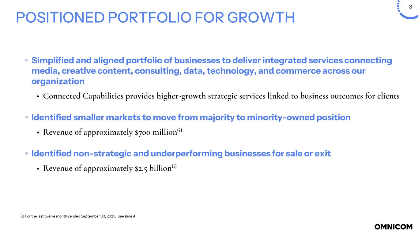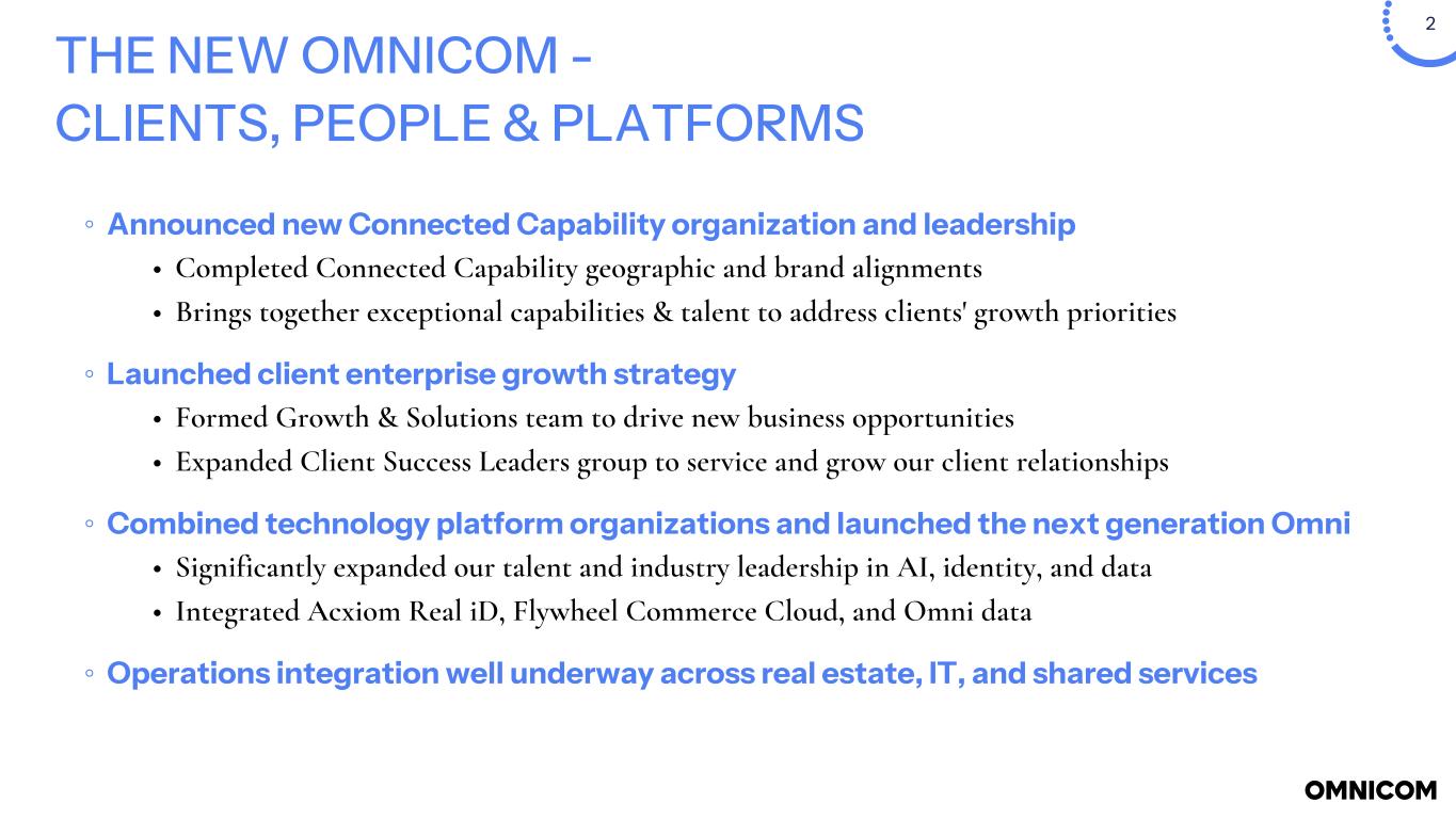 2 THE NEW OMNICOM - CLIENTS, PEOPLE & PLATFORMS ◦ Announced new Connected Capability organization and leadership • Completed Connected Capability geographic and brand alignments • Brings together exceptional capabilities & talent to address clients' growth priorities ◦ Launched client enterprise growth strategy • Formed Growth & Solutions team to drive new business opportunities • Expanded Client Success Leaders group to service and grow our client relationships ◦ Combined technology platform organizations and launched the next generation Omni • Significantly expanded our talent and industry leadership in AI, identity, and data • Integrated Acxiom Real iD, Flywheel Commerce Cloud, and Omni data ◦ Operations integration well underway across real estate, IT, and shared services