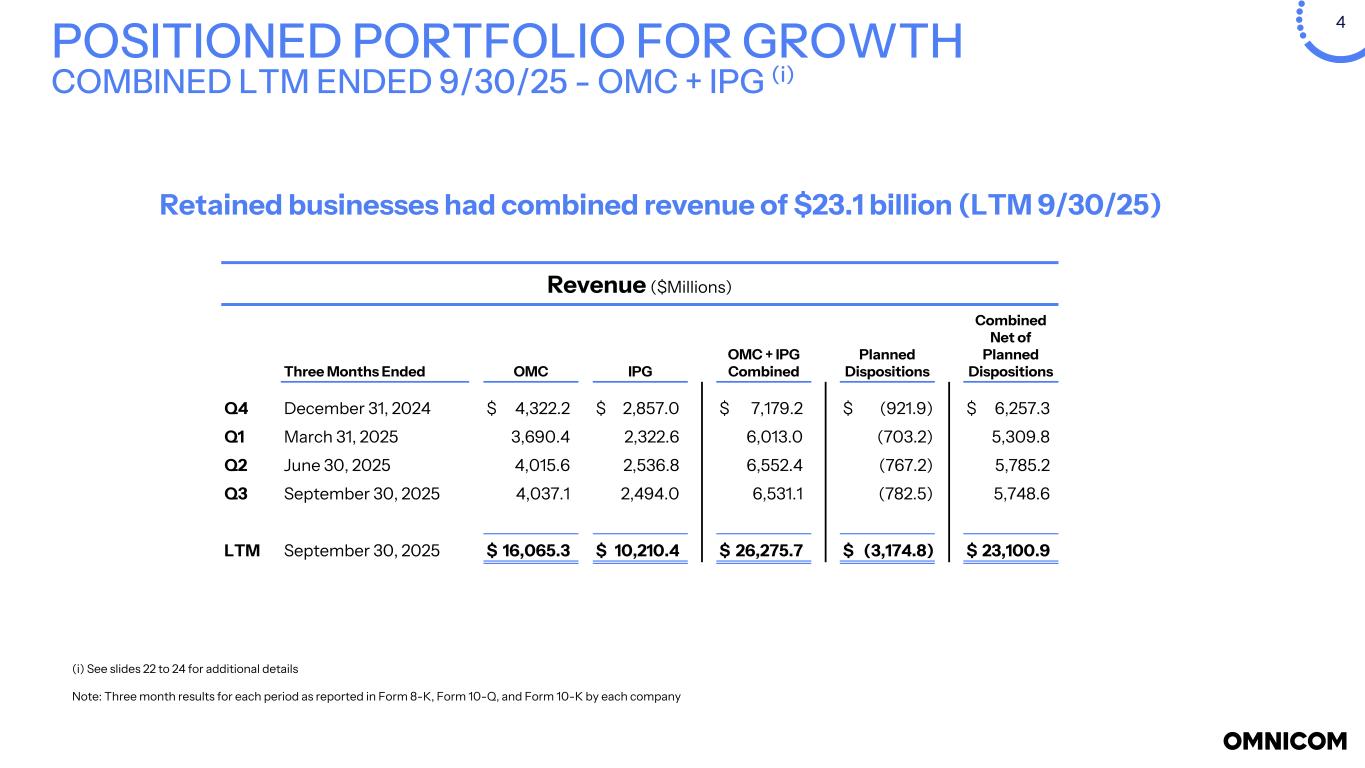 3 POSITIONED PORTFOLIO FOR GROWTH ◦ Simplified and aligned portfolio of businesses to deliver integrated services connecting media, creative content, consulting, data, technology, and commerce across our organization • Connected Capabilities provides higher-growth strategic services linked to business outcomes for clients ◦ Identified smaller markets to move from majority to minority-owned position • Revenue of approximately $700 million(i) ◦ Identified non-strategic and underperforming businesses for sale or exit • Revenue of approximately $2.5 billion(i) (i) For the last twelve months ended September 30, 2025. See slide 4