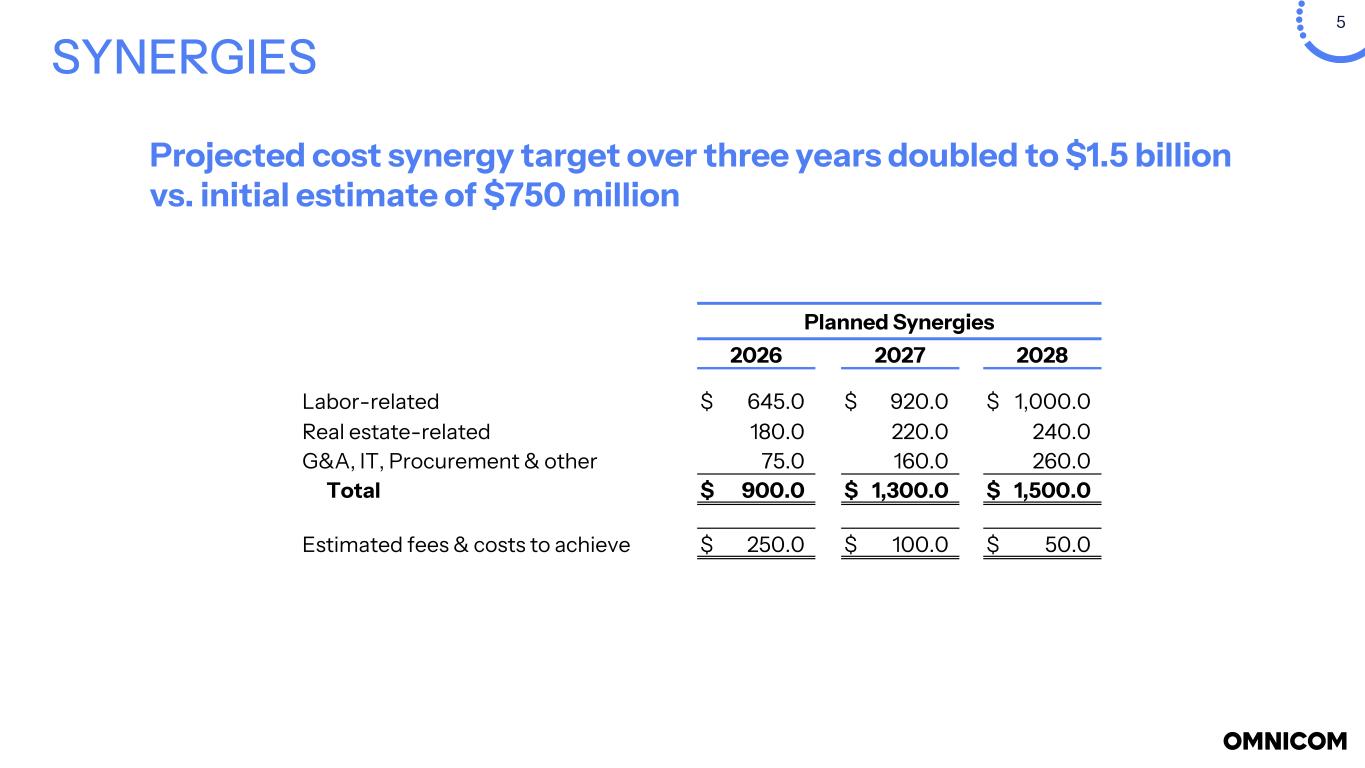 4POSITIONED PORTFOLIO FOR GROWTH COMBINED LTM ENDED 9/30/25 - OMC + IPG (i) Retained businesses had combined revenue of $23.1 billion (LTM 9/30/25) Revenue ($Millions) Three Months Ended OMC IPG OMC + IPG Combined Planned Dispositions Combined Net of Planned Dispositions Q4 December 31, 2024 $ 4,322.2 $ 2,857.0 $ 7,179.2 $ (921.9) $ 6,257.3 Q1 March 31, 2025 3,690.4 2,322.6 6,013.0 (703.2) 5,309.8 Q2 June 30, 2025 4,015.6 2,536.8 6,552.4 (767.2) 5,785.2 Q3 September 30, 2025 4,037.1 2,494.0 6,531.1 (782.5) 5,748.6 LTM September 30, 2025 $ 16,065.3 $ 10,210.4 $ 26,275.7 $ (3,174.8) $ 23,100.9 (i) See slides 22 to 24 for additional details Note: Three month results for each period as reported in Form 8-K, Form 10-Q, and Form 10-K by each company