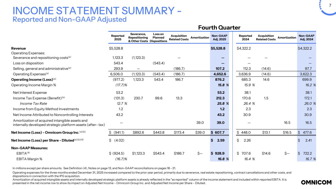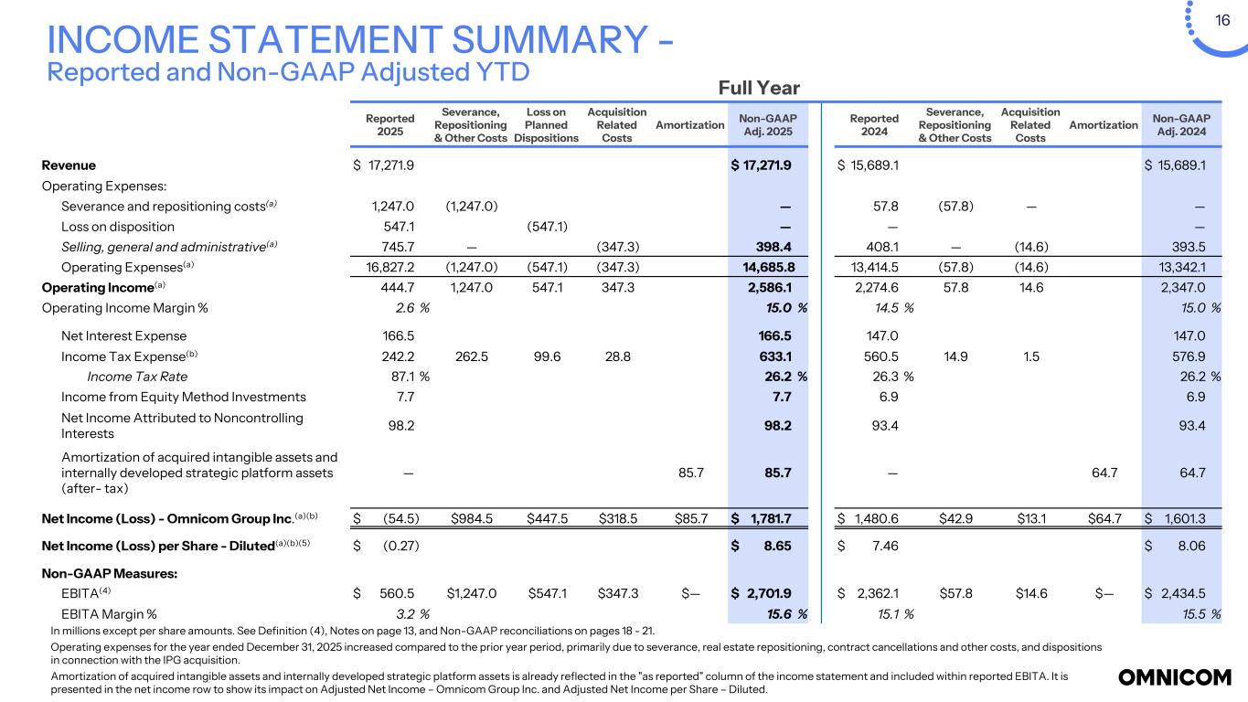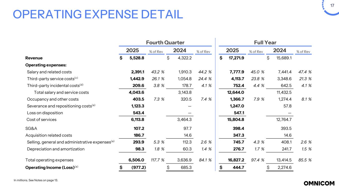 16 Full Year Reported 2025 Severance, Repositioning & Other Costs Loss on Planned Dispositions Acquisition Related Costs Amortization Non-GAAP Adj. 2025 Reported 2024 Severance, Repositioning & Other Costs Acquisition Related Costs Amortization Non-GAAP Adj. 2024 Revenue $ 17,271.9 $ 17,271.9 $ 15,689.1 $ 15,689.1 Operating Expenses: Severance and repositioning costs(a) 1,247.0 (1,247.0) — 57.8 (57.8) — — Loss on disposition 547.1 (547.1) — — — Selling, general and administrative(a) 745.7 — (347.3) 398.4 408.1 — (14.6) 393.5 Operating Expenses(a) 16,827.2 (1,247.0) (547.1) (347.3) 14,685.8 13,414.5 (57.8) (14.6) 13,342.1 Operating Income(a) 444.7 1,247.0 547.1 347.3 2,586.1 2,274.6 57.8 14.6 2,347.0 Operating Income Margin % 2.6 % 15.0 % 14.5 % 15.0 % Net Interest Expense 166.5 166.5 147.0 147.0 Income Tax Expense(b) 242.2 262.5 99.6 28.8 633.1 560.5 14.9 1.5 576.9 Income Tax Rate 87.1 % 26.2 % 26.3 % 26.2 % Income from Equity Method Investments 7.7 7.7 6.9 6.9 Net Income Attributed to Noncontrolling Interests 98.2 98.2 93.4 93.4 Amortization of acquired intangible assets and internally developed strategic platform assets (after- tax) — 85.7 85.7 — 64.7 64.7 Net Income (Loss) - Omnicom Group Inc.(a)(b) $ (54.5) $984.5 $447.5 $318.5 $85.7 $ 1,781.7 $ 1,480.6 $42.9 $13.1 $64.7 $ 1,601.3 Net Income (Loss) per Share - Diluted(a)(b)(5) $ (0.27) $ 8.65 $ 7.46 $ 8.06 Non-GAAP Measures: EBITA(4) $ 560.5 $1,247.0 $547.1 $347.3 $— $ 2,701.9 $ 2,362.1 $57.8 $14.6 $— $ 2,434.5 EBITA Margin % 3.2 % 15.6 % 15.1 % 15.5 % INCOME STATEMENT SUMMARY - Reported and Non-GAAP Adjusted YTD In millions except per share amounts. See Definition (4), Notes on page 13, and Non-GAAP reconciliations on pages 18 - 21. Operating expenses for the year ended December 31, 2025 increased compared to the prior year period, primarily due to severance, real estate repositioning, contract cancellations and other costs, and dispositions in connection with the IPG acquisition. Amortization of acquired intangible assets and internally developed strategic platform assets is already reflected in the "as reported" column of the income statement and included within reported EBITA. It is presented in the net income row to show its impact on Adjusted Net Income – Omnicom Group Inc. and Adjusted Net Income per Share – Diluted.