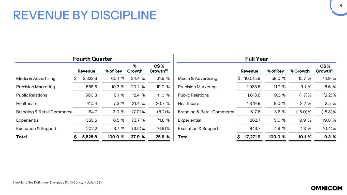 7 Fourth Quarter Reported 2025 Severance, Repositioning & Other Costs Loss on Planned Dispositions Acquisition Related Costs Amortization Non-GAAP Adj. 2025 Reported 2024 Acquisition Related Costs Amortization Non-GAAP Adj. 2024 Revenue $ 5,528.8 $ 5,528.8 $ 4,322.2 $ 4,322.2 Operating Expenses: Severance and repositioning costs(a) 1,123.3 (1,123.3) — — — — — Loss on disposition 543.4 (543.4) — — — Selling, general and administrative(a) 293.9 — (186.7) 107.2 112.3 (14.6) 97.7 Operating Expenses(a) 6,506.0 (1,123.3) (543.4) (186.7) 4,652.6 3,636.9 (14.6) 3,622.3 Operating Income (Loss)(a) (977.2) 1,123.3 543.4 186.7 876.2 685.3 14.6 699.9 Operating Income Margin % (17.7) % 15.8 % 15.9 % 16.2 % Net Interest Expense 53.2 53.2 38.1 38.1 Income Tax Expense (Benefit)(b) (131.3) 230.7 99.6 13.3 212.3 170.6 1.5 172.1 Income Tax Rate 12.7 % 25.8 % 26.4 % 26.0 % Income from Equity Method Investments 1.2 1.2 2.3 2.3 Net Income Attributed to Noncontrolling Interests 43.2 43.2 30.9 30.9 Amortization of acquired intangible assets and internally developed strategic platform assets (after- tax) — 39.0 39.0 — 16.5 16.5 Net Income (Loss) - Omnicom Group Inc.(a)(b) $ (941.1) $892.6 $443.8 $173.4 $39.0 $ 607.7 $ 448.0 $13.1 $16.5 $ 477.6 Net Income (Loss) per Share - Diluted(a)(b)(4) $ (4.02) $ 2.59 $ 2.26 $ 2.41 Non-GAAP Measures: EBITA(4) $ (924.5) $1,123.3 $543.4 $186.7 $— $ 928.9 $ 707.6 $14.6 $— $ 722.2 EBITA Margin % (16.7) % 16.8 % 16.4 % 16.7 % INCOME STATEMENT SUMMARY - Reported and Non-GAAP Adjusted In millions except per share amounts. See Definition (4), Notes on page 13, and Non-GAAP reconciliations on pages 18 - 21. Operating expenses for the three months ended December 31, 2025 increased compared to the prior year period, primarily due to severance, real estate repositioning, contract cancellations and other costs, and dispositions in connection with the IPG acquisition. Amortization of acquired intangible assets and internally developed strategic platform assets is already reflected in the "as reported" column of the income statement and included within reported EBITA. It is presented in the net income row to show its impact on Adjusted Net Income – Omnicom Group Inc. and Adjusted Net Income per Share – Diluted.