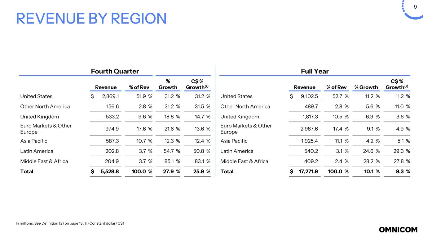 8 REVENUE BY DISCIPLINE Fourth Quarter Full Year Revenue % of Rev % Growth C$ % Growth(i) Revenue % of Rev % Growth C$ % Growth(i) Media & Advertising $ 3,322.6 60.1 % 34.4 % 31.9 % Media & Advertising $ 10,015.9 58.0 % 15.7 % 14.9 % Precision Marketing 568.6 10.3 % 20.2 % 19.0 % Precision Marketing 1,938.5 11.2 % 9.1 % 8.6 % Public Relations 500.8 9.1 % 12.4 % 11.0 % Public Relations 1,613.6 9.3 % (1.7) % (2.2) % Healthcare 410.4 7.3 % 21.4 % 20.7 % Healthcare 1,379.9 8.0 % 3.2 % 2.5 % Branding & Retail Commerce 164.7 3.0 % (7.0) % (8.2) % Branding & Retail Commerce 617.6 3.6 % (15.0) % (15.8) % Experiential 359.5 6.5 % 73.7 % 71.8 % Experiential 862.7 5.0 % 19.9 % 19.0 % Execution & Support 202.2 3.7 % (3.5) % (6.9) % Execution & Support 843.7 4.9 % 1.3 % (0.4) % Total $ 5,528.8 100.0 % 27.9 % 25.9 % Total $ 17,271.9 100.0 % 10.1 % 9.3 % In millions. See Definition (2) on page 13 . (i) Constant dollar (C$)