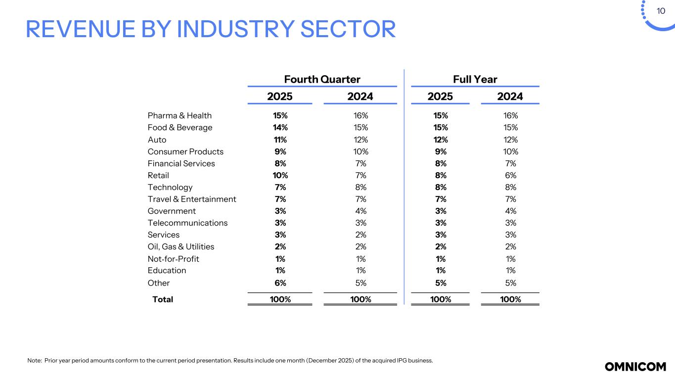 10 Fourth Quarter Full Year 2025 2024 2025 2024 Pharma & Health 15% 16% 15% 16% Food & Beverage 14% 15% 15% 15% Auto 11% 12% 12% 12% Consumer Products 9% 10% 9% 10% Financial Services 8% 7% 8% 7% Retail 10% 7% 8% 6% Technology 7% 8% 8% 8% Travel & Entertainment 7% 7% 7% 7% Government 3% 4% 3% 4% Telecommunications 3% 3% 3% 3% Services 3% 2% 3% 3% Oil, Gas & Utilities 2% 2% 2% 2% Not-for-Profit 1% 1% 1% 1% Education 1% 1% 1% 1% Other 6% 5% 5% 5% Total 100% 100% 100% 100% REVENUE BY INDUSTRY SECTOR Note: Prior year period amounts conform to the current period presentation. Results include one month (December 2025) of the acquired IPG business.