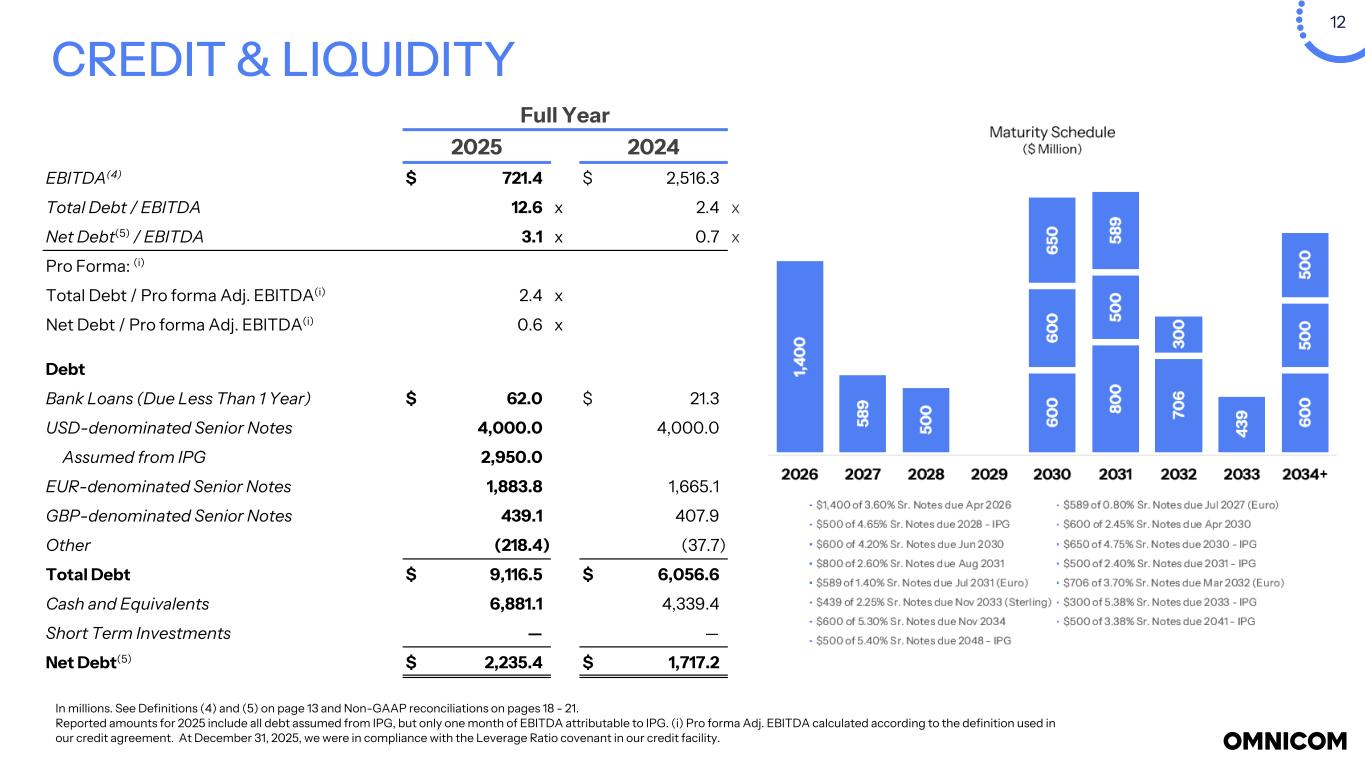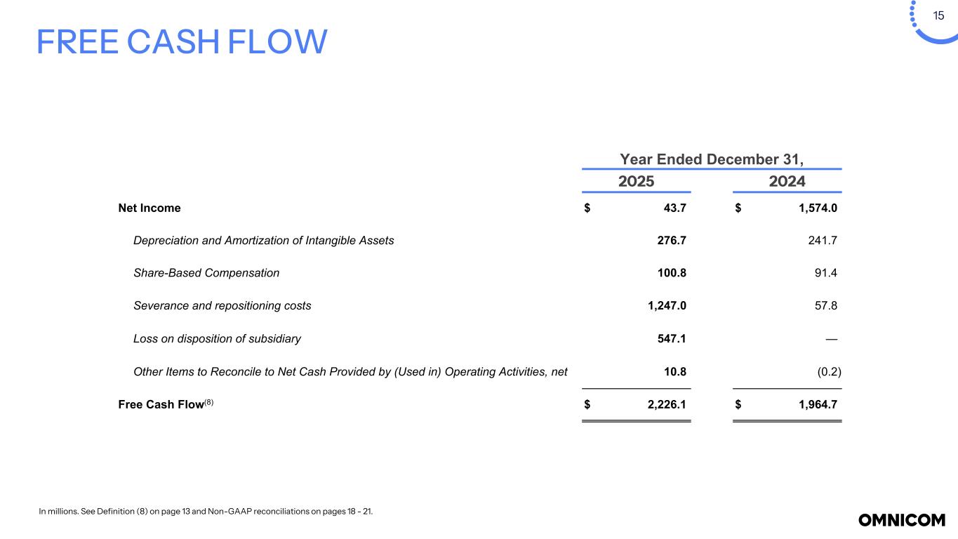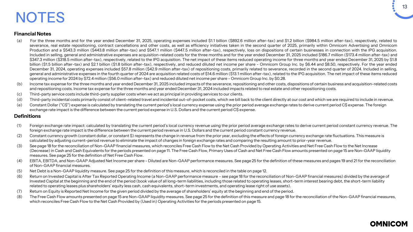 13 NOTES (a) For the three months and for the year ended December  31, 2025, operating expenses included $1.1 billion ($892.6 million after-tax) and $1.2 billion ($984.5 million after-tax), respectively, related to severance, real estate repositioning, contract cancellations and other costs, as well as efficiency initiatives taken in the second quarter of 2025, primarily within Omnicom Advertising and Omnicom Production and a $543.3 million ($443.8 million after-tax) and $547.1 million ($447.5 million after-tax), respectively, loss on dispositions of certain businesses in connection with the IPG acquisition. Included in selling, general and administrative expenses are acquisition-related costs for the three months and for the year ended December 31, 2025 included $186.7 million ($173.4 million after-tax) and $347.3 million ($318.5 million after-tax), respectively, related to the IPG acquisition. The net impact of these items reduced operating income for three months and year ended December 31, 2025 by $1.8 billion ($1.5 billion after-tax) and $2.1 billion ($1.8 billion after-tax), respectively, and reduced diluted net income per share - Omnicom Group Inc. by $6.44 and $8.50, respectively. For the year ended December 31, 2024, operating expenses included $57.8 million ($42.9 million after-tax) of repositioning costs, primarily related to severance, recorded in the second quarter of 2024. Included in selling, general and administrative expenses in the fourth quarter of 2024 are acquisition related costs of $14.6 million ($13.1 million after-tax), related to the IPG acquisition. The net impact of these items reduced operating income for 2024 by $72.4 million ($56.0 million after-tax) and reduced diluted net income per share - Omnicom Group Inc. by $0.28. (b) Income tax expense for the three months and year ended December 31, 2025 included impacts of the severance, repositioning and other costs, dispositions of certain business and acquisition-related costs and repositioning costs. Income tax expense for the three months and year ended December 31, 2024 included impacts related to real estate and other repositioning costs. (c) Third-party service costs include third-party supplier costs when we act as principal in providing services to our clients. (d) Third-party incidental costs primarily consist of client-related travel and incidental out-of-pocket costs, which we bill back to the client directly at our cost and which we are required to include in revenue. (e) Constant Dollar ("C$") expense is calculated by translating the current period’s local currency expense using the prior period average exchange rates to derive current period C$ expense. The foreign exchange rate impact is the difference between the current period expense in U.S. Dollars and the current period C$ expense. Financial Notes Definitions (1) Foreign exchange rate impact: calculated by translating the current period’s local currency revenue using the prior period average exchange rates to derive current period constant currency revenue. The foreign exchange rate impact is the difference between the current period revenue in U.S. Dollars and the current period constant currency revenue. (2) Constant currency growth (constant dollar, or constant $) represents the change in revenue from the prior year, excluding the effects of foreign currency exchange rate fluctuations. This measure is calculated by adjusting current-period revenue to eliminate the impact of changes in foreign exchange rates and comparing the resulting amount to prior-year revenue. (3) See page 18 for the reconciliation of Non-GAAP financial measures, which reconciles Free Cash Flow to the Net Cash Provided by Operating Activities and Net Free Cash Flow to the Net Increase (Decrease) in Cash and Cash Equivalents for the periods presented on page 11. The Free Cash Flow, Primary Uses of Cash and Net Free Cash Flow amounts presented on page 15 are Non-GAAP liquidity measures. See page 25 for the definition of Net Free Cash Flow. (4) EBITA, EBITDA, and Non-GAAP Adjusted Net Income per share - Diluted are Non-GAAP performance measures. See page 25 for the definition of these measures and pages 19 and 21 for the reconciliation of Non-GAAP financial measures. (5) Net Debt is a Non-GAAP liquidity measure. See page 25 for the definition of this measure, which is reconciled in the table on page 12. (6) Return on Invested Capital is After Tax Reported Operating Income (a Non-GAAP performance measure – see page 18 for the reconciliation of Non-GAAP financial measures) divided by the average of Invested Capital at the beginning and the end of the period (book value of all long-term liabilities, including those related to operating leases, short-term interest bearing debt, the short-term liability related to operating leases plus shareholders’ equity less cash, cash equivalents, short-term investments, and operating lease right of use assets). (7) Return on Equity is Reported Net Income for the given period divided by the average of shareholders’ equity at the beginning and end of the period. (8) The Free Cash Flow amounts presented on page 15 are Non-GAAP liquidity measures. See page 25 for the definition of this measure and page 18 for the reconciliation of the Non-GAAP financial measures, which reconciles Free Cash Flow to the Net Cash Provided by (Used in) Operating Activities for the periods presented on page 15.