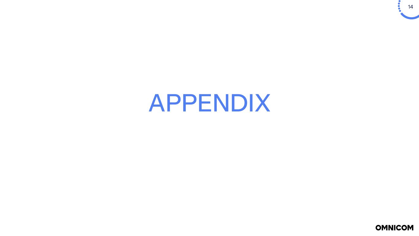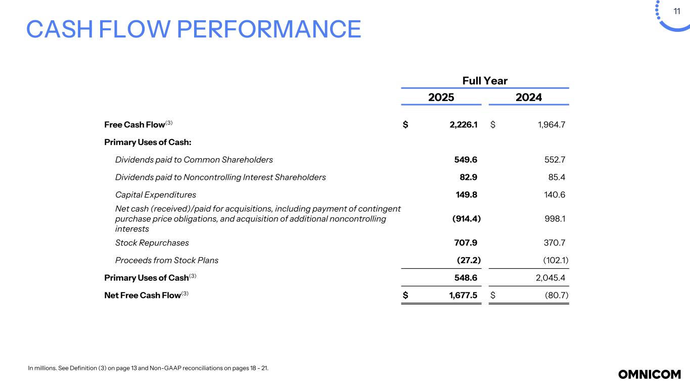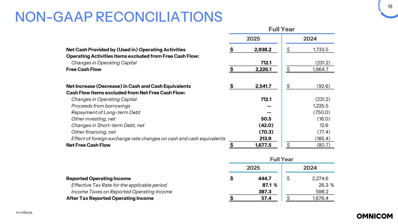 13 NOTES (a) For the three months and for the year ended December  31, 2025, operating expenses included $1.1 billion ($892.6 million after-tax) and $1.2 billion ($984.5 million after-tax), respectively, related to severance, real estate repositioning, contract cancellations and other costs, as well as efficiency initiatives taken in the second quarter of 2025, primarily within Omnicom Advertising and Omnicom Production and a $543.3 million ($443.8 million after-tax) and $547.1 million ($447.5 million after-tax), respectively, loss on dispositions of certain businesses in connection with the IPG acquisition. Included in selling, general and administrative expenses are acquisition-related costs for the three months and for the year ended December 31, 2025 included $186.7 million ($173.4 million after-tax) and $347.3 million ($318.5 million after-tax), respectively, related to the IPG acquisition. The net impact of these items reduced operating income for three months and year ended December 31, 2025 by $1.8 billion ($1.5 billion after-tax) and $2.1 billion ($1.8 billion after-tax), respectively, and reduced diluted net income per share - Omnicom Group Inc. by $6.44 and $8.50, respectively. For the year ended December 31, 2024, operating expenses included $57.8 million ($42.9 million after-tax) of repositioning costs, primarily related to severance, recorded in the second quarter of 2024. Included in selling, general and administrative expenses in the fourth quarter of 2024 are acquisition related costs of $14.6 million ($13.1 million after-tax), related to the IPG acquisition. The net impact of these items reduced operating income for 2024 by $72.4 million ($56.0 million after-tax) and reduced diluted net income per share - Omnicom Group Inc. by $0.28. (b) Income tax expense for the three months and year ended December 31, 2025 included impacts of the severance, repositioning and other costs, dispositions of certain business and acquisition-related costs and repositioning costs. Income tax expense for the three months and year ended December 31, 2024 included impacts related to real estate and other repositioning costs. (c) Third-party service costs include third-party supplier costs when we act as principal in providing services to our clients. (d) Third-party incidental costs primarily consist of client-related travel and incidental out-of-pocket costs, which we bill back to the client directly at our cost and which we are required to include in revenue. (e) Constant Dollar ("C$") expense is calculated by translating the current period’s local currency expense using the prior period average exchange rates to derive current period C$ expense. The foreign exchange rate impact is the difference between the current period expense in U.S. Dollars and the current period C$ expense. Financial Notes Definitions (1) Foreign exchange rate impact: calculated by translating the current period’s local currency revenue using the prior period average exchange rates to derive current period constant currency revenue. The foreign exchange rate impact is the difference between the current period revenue in U.S. Dollars and the current period constant currency revenue. (2) Constant currency growth (constant dollar, or constant $) represents the change in revenue from the prior year, excluding the effects of foreign currency exchange rate fluctuations. This measure is calculated by adjusting current-period revenue to eliminate the impact of changes in foreign exchange rates and comparing the resulting amount to prior-year revenue. (3) See page 18 for the reconciliation of Non-GAAP financial measures, which reconciles Free Cash Flow to the Net Cash Provided by Operating Activities and Net Free Cash Flow to the Net Increase (Decrease) in Cash and Cash Equivalents for the periods presented on page 11. The Free Cash Flow, Primary Uses of Cash and Net Free Cash Flow amounts presented on page 15 are Non-GAAP liquidity measures. See page 25 for the definition of Net Free Cash Flow. (4) EBITA, EBITDA, and Non-GAAP Adjusted Net Income per share - Diluted are Non-GAAP performance measures. See page 25 for the definition of these measures and pages 19 and 21 for the reconciliation of Non-GAAP financial measures. (5) Net Debt is a Non-GAAP liquidity measure. See page 25 for the definition of this measure, which is reconciled in the table on page 12. (6) Return on Invested Capital is After Tax Reported Operating Income (a Non-GAAP performance measure – see page 18 for the reconciliation of Non-GAAP financial measures) divided by the average of Invested Capital at the beginning and the end of the period (book value of all long-term liabilities, including those related to operating leases, short-term interest bearing debt, the short-term liability related to operating leases plus shareholders’ equity less cash, cash equivalents, short-term investments, and operating lease right of use assets). (7) Return on Equity is Reported Net Income for the given period divided by the average of shareholders’ equity at the beginning and end of the period. (8) The Free Cash Flow amounts presented on page 15 are Non-GAAP liquidity measures. See page 25 for the definition of this measure and page 18 for the reconciliation of the Non-GAAP financial measures, which reconciles Free Cash Flow to the Net Cash Provided by (Used in) Operating Activities for the periods presented on page 15.