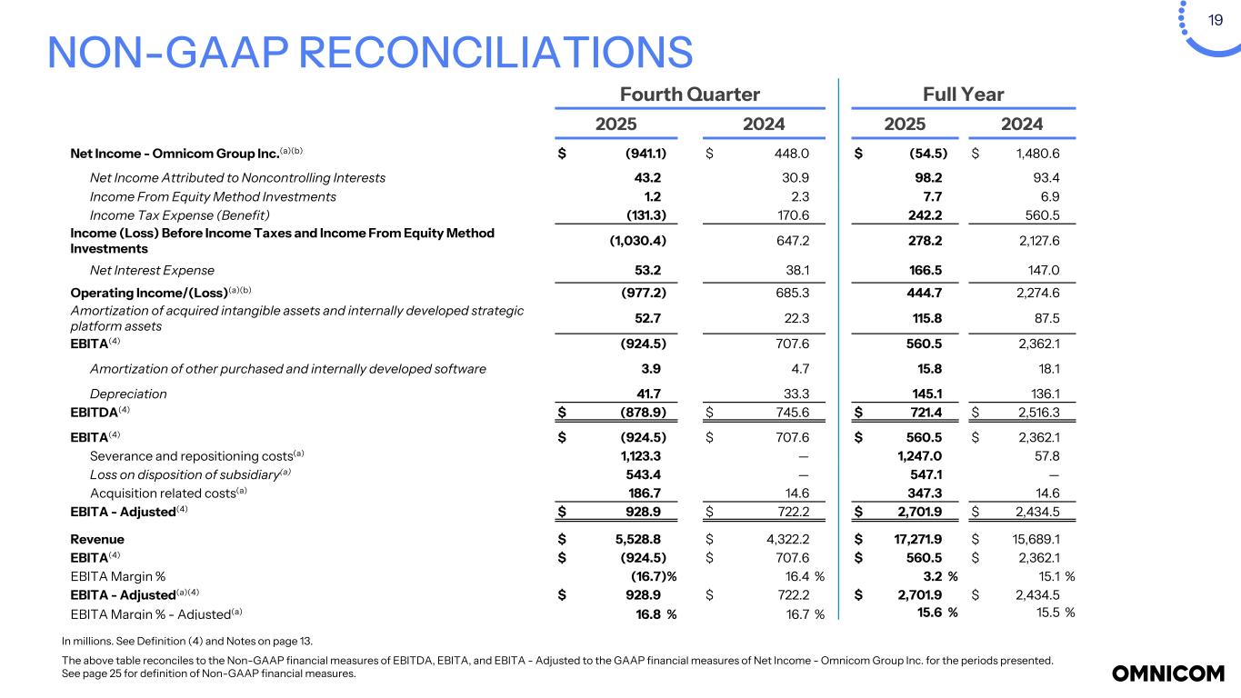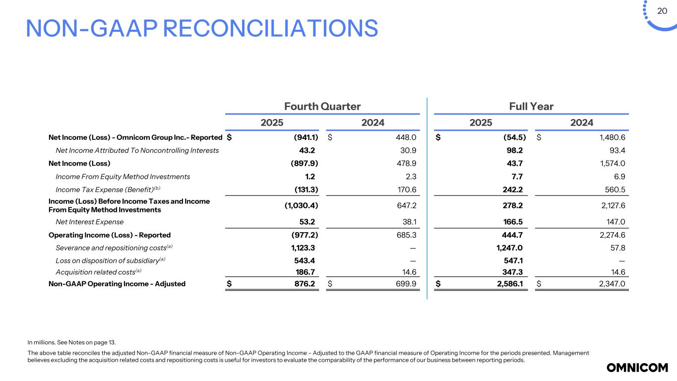 19 NON-GAAP RECONCILIATIONS In millions. See Definition (4) and Notes on page 13. The above table reconciles to the Non-GAAP financial measures of EBITDA, EBITA, and EBITA - Adjusted to the GAAP financial measures of Net Income - Omnicom Group Inc. for the periods presented. See page 25 for definition of Non-GAAP financial measures. Fourth Quarter Full Year 2025 2024 2025 2024 Net Income - Omnicom Group Inc.(a)(b) $ (941.1) $ 448.0 $ (54.5) $ 1,480.6 Net Income Attributed to Noncontrolling Interests 43.2 30.9 98.2 93.4 Income From Equity Method Investments 1.2 2.3 7.7 6.9 Income Tax Expense (Benefit) (131.3) 170.6 242.2 560.5 Income (Loss) Before Income Taxes and Income From Equity Method Investments (1,030.4) 647.2 278.2 2,127.6 Net Interest Expense 53.2 38.1 166.5 147.0 Operating Income/(Loss)(a)(b) (977.2) 685.3 444.7 2,274.6 Amortization of acquired intangible assets and internally developed strategic platform assets 52.7 22.3 115.8 87.5 EBITA(4) (924.5) 707.6 560.5 2,362.1 Amortization of other purchased and internally developed software 3.9 4.7 15.8 18.1 Depreciation 41.7 33.3 145.1 136.1 EBITDA(4) $ (878.9) $ 745.6 $ 721.4 $ 2,516.3 EBITA(4) $ (924.5) $ 707.6 $ 560.5 $ 2,362.1 Severance and repositioning costs(a) 1,123.3 — 1,247.0 57.8 Loss on disposition of subsidiary(a) 543.4 — 547.1 — Acquisition related costs(a) 186.7 14.6 347.3 14.6 EBITA - Adjusted(4) $ 928.9 $ 722.2 $ 2,701.9 $ 2,434.5 Revenue $ 5,528.8 $ 4,322.2 $ 17,271.9 $ 15,689.1 EBITA(4) $ (924.5) $ 707.6 $ 560.5 $ 2,362.1 EBITA Margin % (16.7) % 16.4 % 3.2 % 15.1 % EBITA - Adjusted(a)(4) $ 928.9 $ 722.2 $ 2,701.9 $ 2,434.5 EBITA Margin % - Adjusted(a) 16.8 % 16.7 % 15.6 % 15.5 %