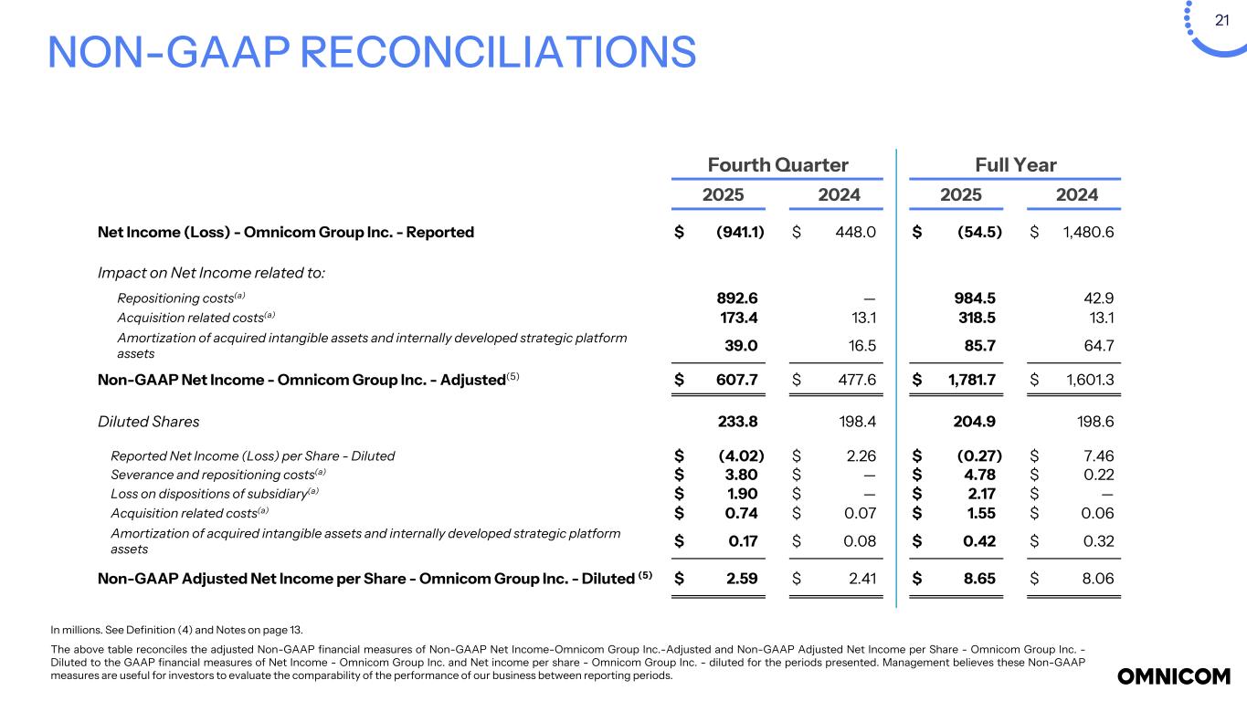 20 NON-GAAP RECONCILIATIONS In millions. See Notes on page 13. The above table reconciles the adjusted Non-GAAP financial measure of Non-GAAP Operating Income - Adjusted to the GAAP financial measure of Operating Income for the periods presented. Management believes excluding the acquisition related costs and repositioning costs is useful for investors to evaluate the comparability of the performance of our business between reporting periods. Fourth Quarter Full Year 2025 2024 2025 2024 Net Income (Loss) - Omnicom Group Inc.- Reported $ (941.1) $ 448.0 $ (54.5) $ 1,480.6 Net Income Attributed To Noncontrolling Interests 43.2 30.9 98.2 93.4 Net Income (Loss) (897.9) 478.9 43.7 1,574.0 Income From Equity Method Investments 1.2 2.3 7.7 6.9 Income Tax Expense (Benefit)(b) (131.3) 170.6 242.2 560.5 Income (Loss) Before Income Taxes and Income From Equity Method Investments (1,030.4) 647.2 278.2 2,127.6 Net Interest Expense 53.2 38.1 166.5 147.0 Operating Income (Loss) - Reported (977.2) 685.3 444.7 2,274.6 Severance and repositioning costs(a) 1,123.3 — 1,247.0 57.8 Loss on disposition of subsidiary(a) 543.4 — 547.1 — Acquisition related costs(a) 186.7 14.6 347.3 14.6 Non-GAAP Operating Income - Adjusted $ 876.2 $ 699.9 $ 2,586.1 $ 2,347.0