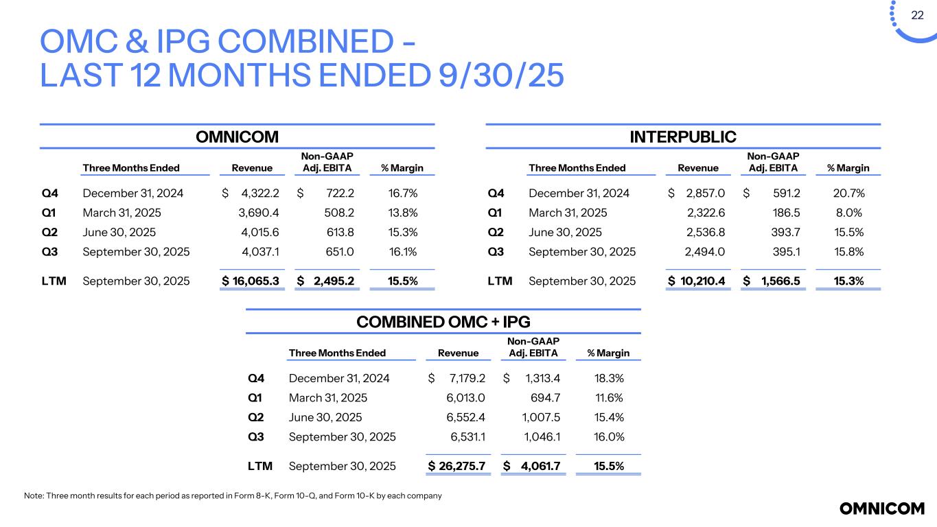 21 Fourth Quarter Full Year 2025 2024 2025 2024 Net Income (Loss) - Omnicom Group Inc. - Reported $ (941.1) $ 448.0 $ (54.5) $ 1,480.6 Impact on Net Income related to: Repositioning costs(a) 892.6 — 984.5 42.9 Acquisition related costs(a) 173.4 13.1 318.5 13.1 Amortization of acquired intangible assets and internally developed strategic platform assets 39.0 16.5 85.7 64.7 Non-GAAP Net Income - Omnicom Group Inc. - Adjusted(5) $ 607.7 $ 477.6 $ 1,781.7 $ 1,601.3 Diluted Shares 233.8 198.4 204.9 198.6 Reported Net Income (Loss) per Share - Diluted $ (4.02) $ 2.26 $ (0.27) $ 7.46 Severance and repositioning costs(a) $ 3.80 $ — $ 4.78 $ 0.22 Loss on dispositions of subsidiary(a) $ 1.90 $ — $ 2.17 $ — Acquisition related costs(a) $ 0.74 $ 0.07 $ 1.55 $ 0.06 Amortization of acquired intangible assets and internally developed strategic platform assets $ 0.17 $ 0.08 $ 0.42 $ 0.32 Non-GAAP Adjusted Net Income per Share - Omnicom Group Inc. - Diluted (5) $ 2.59 $ 2.41 $ 8.65 $ 8.06 NON-GAAP RECONCILIATIONS In millions. See Definition (4) and Notes on page 13. The above table reconciles the adjusted Non-GAAP financial measures of Non-GAAP Net Income-Omnicom Group Inc.-Adjusted and Non-GAAP Adjusted Net Income per Share - Omnicom Group Inc. - Diluted to the GAAP financial measures of Net Income - Omnicom Group Inc. and Net income per share - Omnicom Group Inc. - diluted for the periods presented. Management believes these Non-GAAP measures are useful for investors to evaluate the comparability of the performance of our business between reporting periods.
