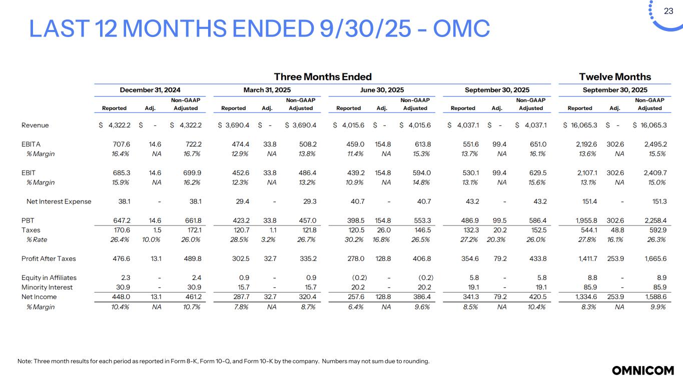 23 LAST 12 MONTHS ENDED 9/30/25 - OMC Note: Three month results for each period as reported in Form 8-K, Form 10-Q, and Form 10-K by the company. Numbers may not sum due to rounding.