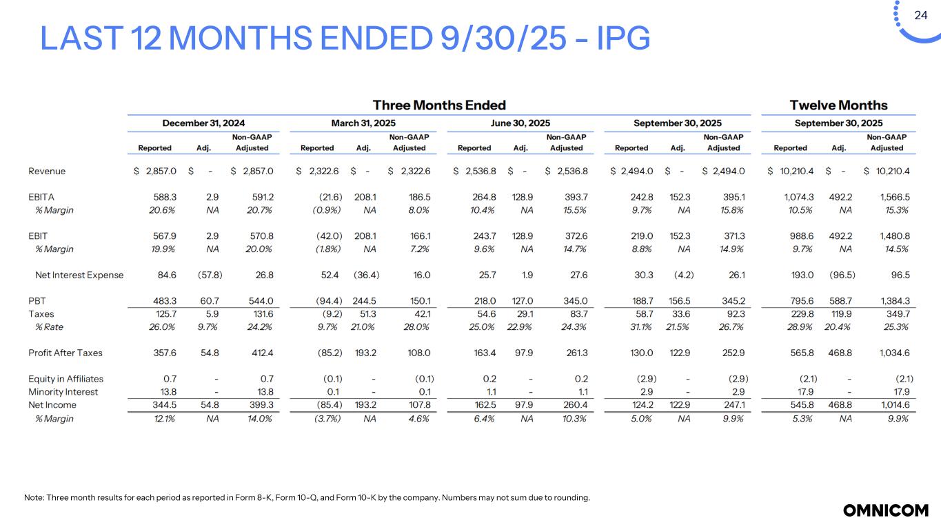 24 LAST 12 MONTHS ENDED 9/30/25 - IPG Note: Three month results for each period as reported in Form 8-K, Form 10-Q, and Form 10-K by the company. Numbers may not sum due to rounding.