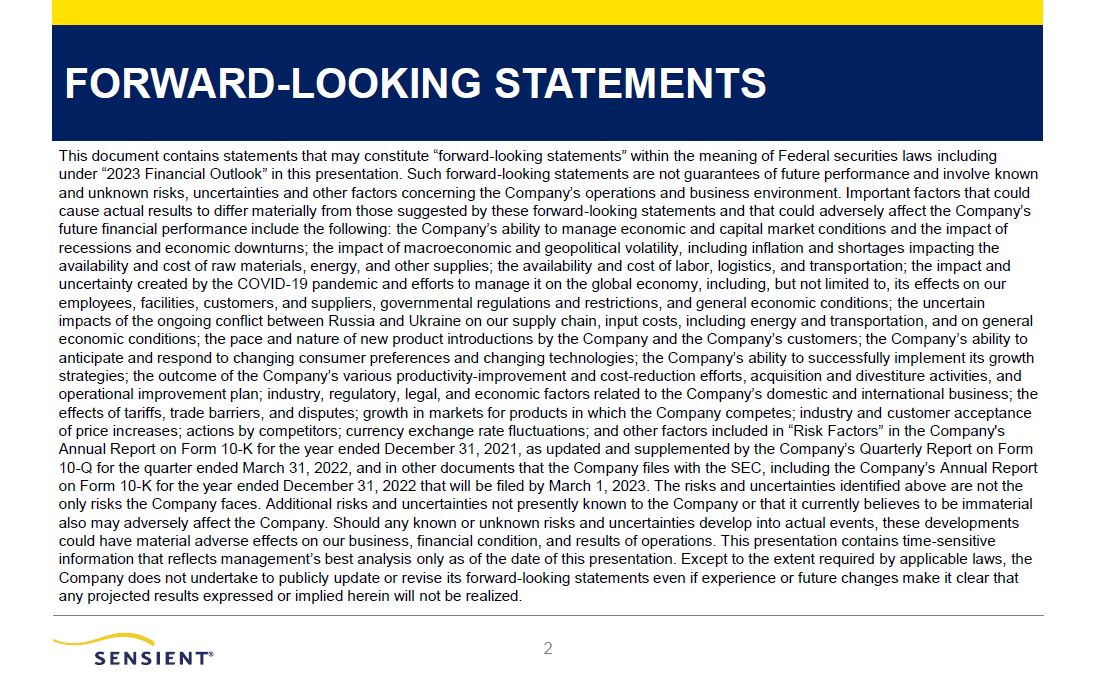 FORWARD-LOOKING STATEMENTS  2  This document contains statements that may constitute “forward-looking statements” within the meaning of Federal securities laws including under “2023 Financial Outlook” in this presentation. Such forward-looking statements are not guarantees of future performance and involve known and unknown risks, uncertainties and other factors concerning the Company’s operations and business environment. Important factors that could cause actual results to differ materially from those suggested by these forward-looking statements and that could adversely affect the Company’s future financial performance include the following: the Company’s ability to manage economic and capital market conditions and the impact of recessions and economic downturns; the impact of macroeconomic and geopolitical volatility, including inflation and shortages impacting the availability and cost of raw materials, energy, and other supplies; the availability and cost of labor, logistics, and transportation; the impact and uncertainty created by the COVID-19 pandemic and efforts to manage it on the global economy, including, but not limited to, its effects on our employees, facilities, customers, and suppliers, governmental regulations and restrictions, and general economic conditions; the uncertain impacts of the ongoing conflict between Russia and Ukraine on our supply chain, input costs, including energy and transportation, and on general economic conditions; the pace and nature of new product introductions by the Company and the Company’s customers; the Company’s ability to anticipate and respond to changing consumer preferences and changing technologies; the Company’s ability to successfully implement its growth strategies; the outcome of the Company’s various productivity-improvement and cost-reduction efforts, acquisition and divestiture activities, and operational improvement plan; industry, regulatory, legal, and economic factors related to the Company’s domestic and international business; the effects of tariffs, trade barriers, and disputes; growth in markets for products in which the Company competes; industry and customer acceptance of price increases; actions by competitors; currency exchange rate fluctuations; and other factors included in “Risk Factors” in the Company's Annual Report on Form 10-K for the year ended December 31, 2021, as updated and supplemented by the Company’s Quarterly Report on Form 10-Q for the quarter ended March 31, 2022, and in other documents that the Company files with the SEC, including the Company’s Annual Report on Form 10-K for the year ended December 31, 2022 that will be filed by March 1, 2023. The risks and uncertainties identified above are not the only risks the Company faces. Additional risks and uncertainties not presently known to the Company or that it currently believes to be immaterial also may adversely affect the Company. Should any known or unknown risks and uncertainties develop into actual events, these developments could have material adverse effects on our business, financial condition, and results of operations. This presentation contains time-sensitive information that reflects management’s best analysis only as of the date of this presentation. Except to the extent required by applicable laws, the Company does not undertake to publicly update or revise its forward-looking statements even if experience or future changes make it clear that any projected results expressed or implied herein will not be realized.