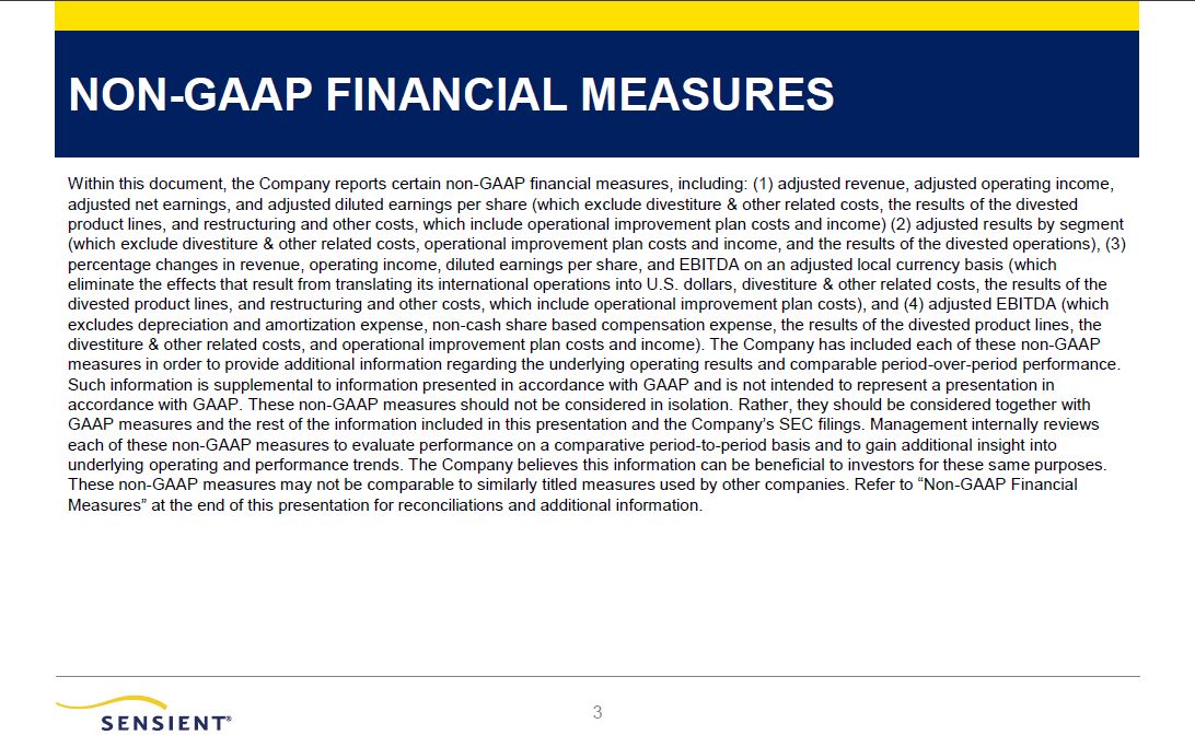 NON-GAAP FINANCIAL MEASURES  2  Within this document, the Company reports certain non-GAAP financial measures, including: (1) adjusted revenue, adjusted operating income, adjusted net earnings, and adjusted diluted earnings per share (which exclude divestiture & other related costs, the results of the divested product lines, and restructuring and other costs, which include operational improvement plan costs and income) (2) adjusted results by segment (which exclude divestiture & other related costs, operational improvement plan costs and income, and the results of the divested operations), (3) percentage changes in revenue, operating income, diluted earnings per share, and EBITDA on an adjusted local currency basis (which eliminate the effects that result from translating its international operations into U.S. dollars, divestiture & other related costs, the results of the divested product lines, and restructuring and other costs, which include operational improvement plan costs), and (4) adjusted EBITDA (which excludes depreciation and amortization expense, non-cash share based compensation expense, the results of the divested product lines, the divestiture & other related costs, and operational improvement plan costs and income). The Company has included each of these non-GAAP measures in order to provide additional information regarding the underlying operating results and comparable period-over-period performance. Such information is supplemental to information presented in accordance with GAAP and is not intended to represent a presentation in accordance with GAAP. These non-GAAP measures should not be considered in isolation. Rather, they should be considered together with GAAP measures and the rest of the information included in this presentation and the Company’s SEC filings. Management internally reviews each of these non-GAAP measures to evaluate performance on a comparative period-to-period basis and to gain additional insight into underlying operating and performance trends. The Company believes this information can be beneficial to investors for these same purposes.  These non-GAAP measures may not be comparable to similarly titled measures used by other companies. Refer to “Non-GAAP Financial Measures” at the end of this presentation for reconciliations and additional information.