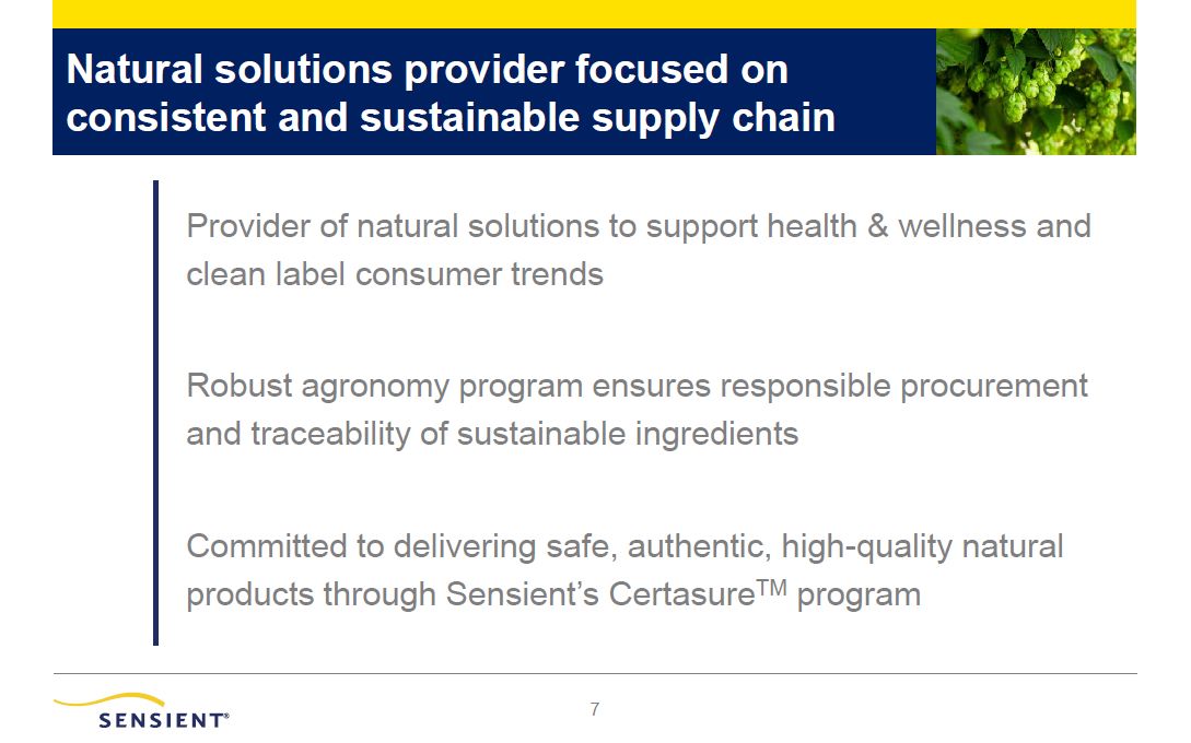 Natural solutions provider focused on consistent and sustainable supply chain  2  Provider of natural solutions to support health & wellness and  clean label consumer trends  Robust agronomy program ensures responsible procurement  and traceability of sustainable ingredients  Committed to delivering safe, authentic, high-quality natural  products through Sensient’s CertasureTM program