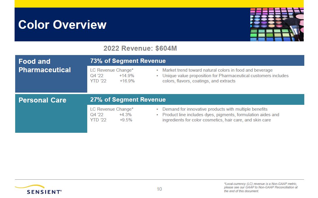 10  Color Overview  Food and Pharmaceutical  73% of Segment Revenue  LC Revenue Change*  Q4 ’22  YTD ’22  +14.9%  +16.9%  Market trend toward natural colors in food and beverage  Unique value proposition for Pharmaceutical customers includes  colors, flavors, coatings, and extracts  Personal Care 27% of  Segment Revenue  LC Revenue Q4 ’22  YTD ’22  Change* • Demand for innovative products with multiple benefits  +4.3% • Product line includes dyes, pigments, formulation aides and  +9.5% ingredients for color cosmetics, hair care, and skin care  2022 Revenue: $604M  *Local-currency (LC) revenue is a Non-GAAP metric, please see our GAAP to Non-GAAP Reconciliation at the end of this document.