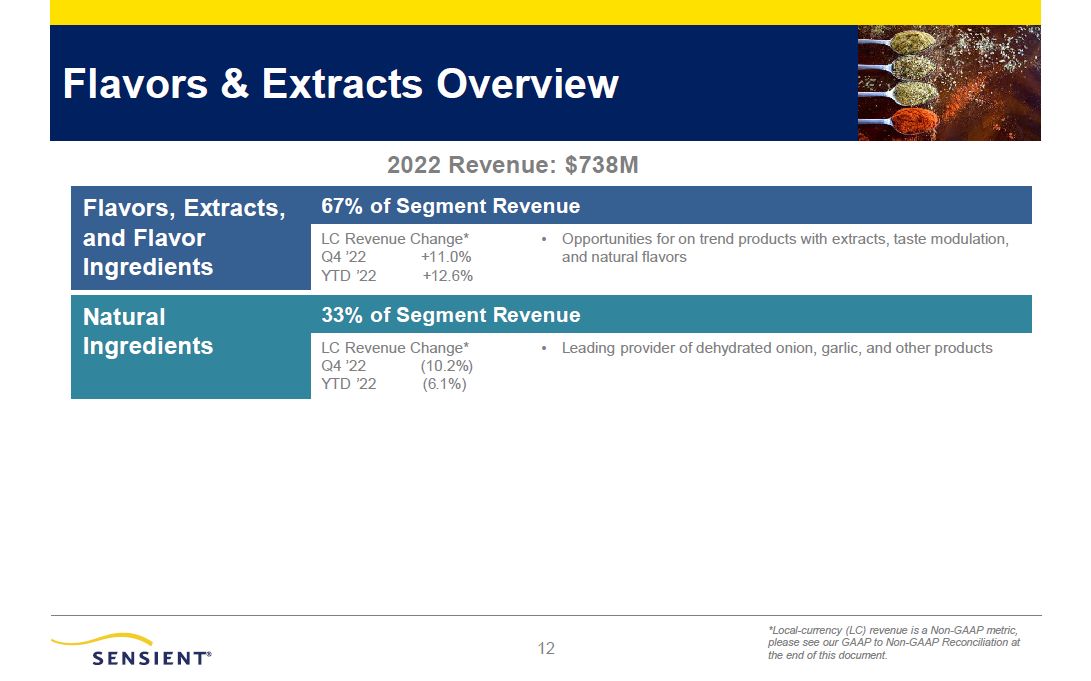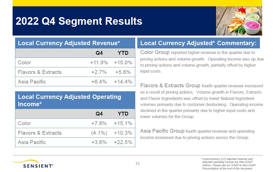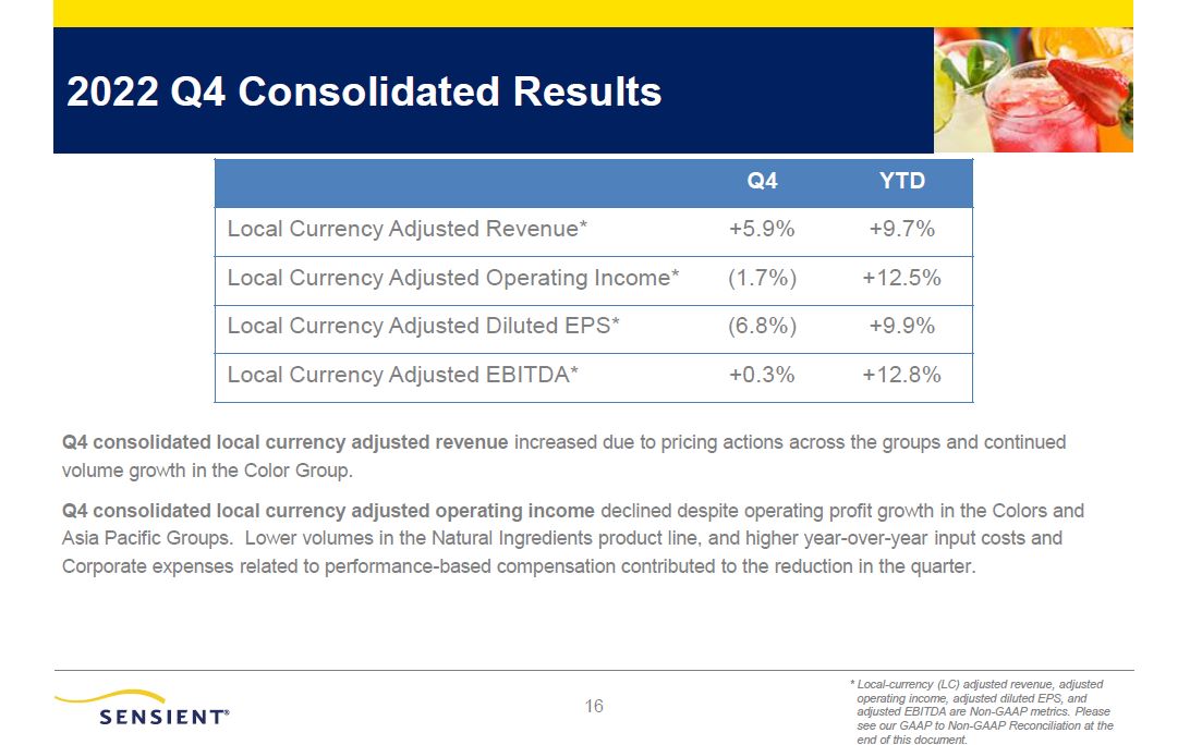 15  2022 Q4 Segment Results  Color Group reported higher revenue in the quarter due to pricing actions and volume growth. Operating income was up due to pricing actions, partially offset by higher input costs.  Flavors & Extracts Group fourth quarter revenue increased as a result of pricing actions. Volume growth in Flavors, Extracts and Flavor Ingredients was offset by lower Natural Ingredient volumes primarily due to customer destocking. Operating income declined in the quarter primarily due to higher input costs and lower volumes for the Group.  Asia Pacific Group fourth quarter revenue and operating income increased due to pricing actions across the Group.  Local Currency Adjusted Operating Income*  Q4  YTD  Color  +7.8%  +15.1%  Flavors & Extracts  (4.1%)  +10.3%  Asia Pacific  +3.6%  +22.5%  Local Currency Adjusted Revenue*  Local Currency Adjusted* Commentary:  Q4  YTD  Color  +11.9%  +15.0%  Flavors & Extracts  +2.7%  +5.8%  Asia Pacific  +6.4%  +14.4%  * Local-currency (LC) adjusted revenue and adjusted operating income are Non-GAAP metrics. Please see our GAAP to Non-GAAP Reconciliation at the end of this document.
