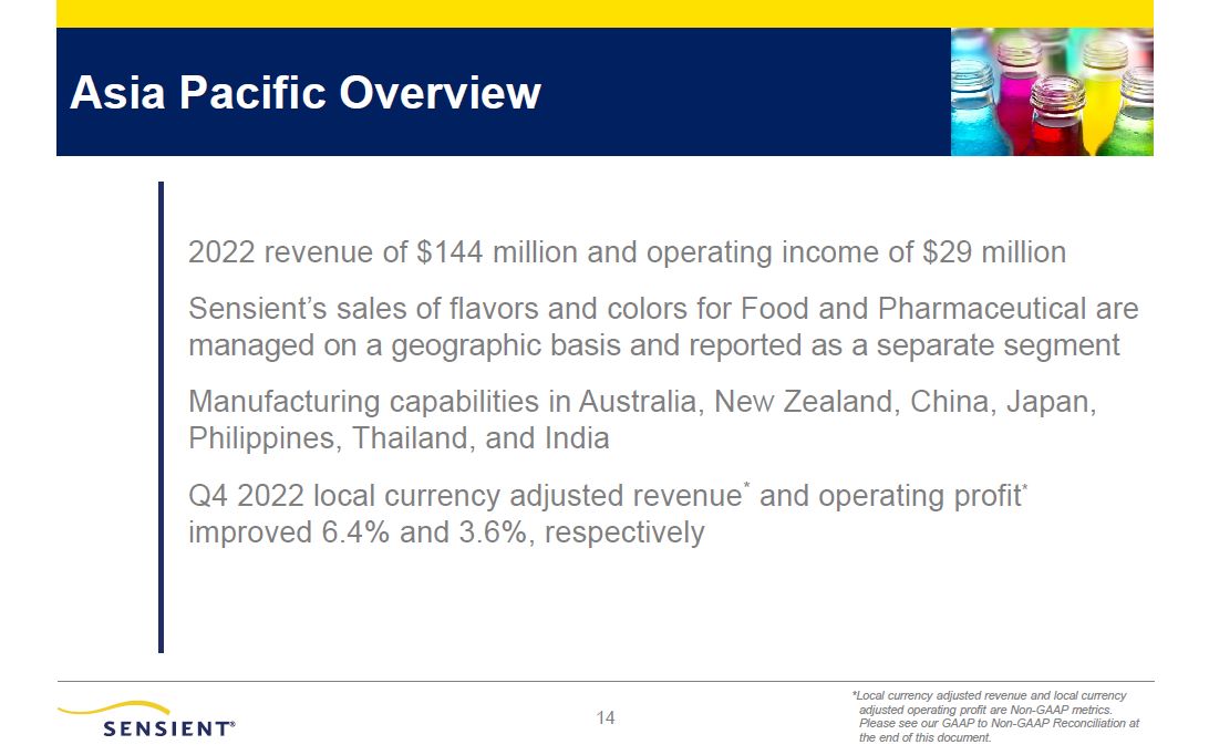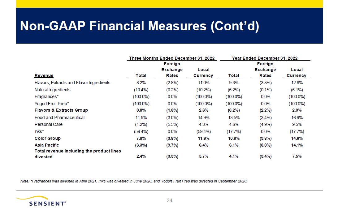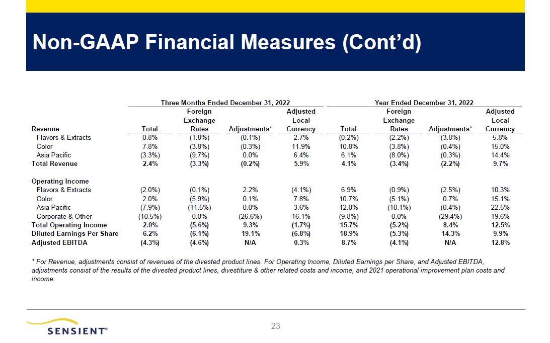 Non-GAAP Financial Measures (Cont’d)  28  Revenue   Total   Foreign  Exchange   Rates    Adjustments*  Adjusted  Local   Currency    Total   Foreign  Exchange   Rates    Adjustments*  Adjusted  Local   Currency   Flavors & Extracts  0.8%  (1.8%)  (0.1%)  2.7%  (0.2%)  (2.2%)  (3.8%)  5.8%  Color  7.8%  (3.8%)  (0.3%)  11.9%  10.8%  (3.8%)  (0.4%)  15.0%  Asia Pacific  (3.3%)  (9.7%)  0.0%  6.4%  6.1%  (8.0%)  (0.3%)  14.4%  Total Revenue  2.4%  (3.3%)  (0.2%)  5.9%  4.1%  (3.4%)  (2.2%)  9.7%  Operating Income  Flavors & Extracts  (2.0%)  (0.1%)  2.2%  (4.1%)  6.9%  (0.9%)  (2.5%)  10.3%  Color  2.0%  (5.9%)  0.1%  7.8%  10.7%  (5.1%)  0.7%  15.1%  Asia Pacific  (7.9%)  (11.5%)  0.0%  3.6%  12.0%  (10.1%)  (0.4%)  22.5%  Corporate & Other  (10.5%)  0.0%  (26.6%)  16.1%  (9.8%)  0.0%  (29.4%)  19.6%  Total Operating Income  2.0%  (5.6%)  9.3%  (1.7%)  15.7%  (5.2%)  8.4%  12.5%  Diluted Earnings Per Share  6.2%  (6.1%)  19.1%  (6.8%)  18.9%  (5.3%)  14.3%  9.9%  Adjusted EBITDA  (4.3%)  (4.6%)  N/A  0.3%  8.7%  (4.1%)  N/A  12.8%  * For Revenue, adjustments consist of revenues of the divested product lines. For Operating Income, Diluted Earnings per Share, and Adjusted EBITDA, adjustments consist of the results of the divested product lines, divestiture & other related costs and income, and 2021 operational improvement plan costs and income.   Three Months Ended December 31, 2022 Year Ended December 31, 2022