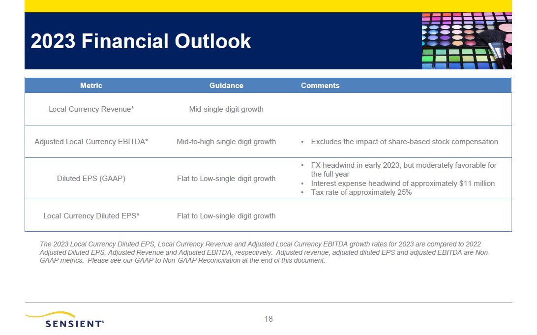 2023 Financial Outlook  17  Metric  Guidance  Comments  Local Currency Revenue*  Mid-single digit growth  Adjusted Local Currency EBITDA*  Mid-to-high single digit growth  Excludes the impact of share-based stock compensation  Diluted EPS (GAAP)  Flat to Low-single digit growth  FX headwind in early 2023, but moderately favorable for  the full year  Interest expense headwind of $10-$12 million  Tax rate of approximately 25%  Local Currency Diluted EPS*  Flat to Low-single digit growth  The 2023 Local Currency Diluted EPS, Local Currency Revenue and Adjusted Local Currency EBITDA growth rates for 2023 are compared to 2022 Adjusted Diluted EPS, Adjusted Revenue and Adjusted EBITDA, respectively. Adjusted revenue, adjusted diluted EPS and adjusted EBITDA are Non- GAAP metrics. Please see our GAAP to Non-GAAP Reconciliation at the end of this document.