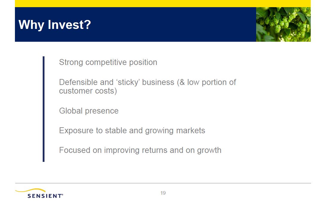 Why Invest?  Strong competitive position  Defensible and ‘sticky’ business (& low portion of customer costs)  Global presence  Exposure to stable and growing markets Focused on improving returns and on growth  17