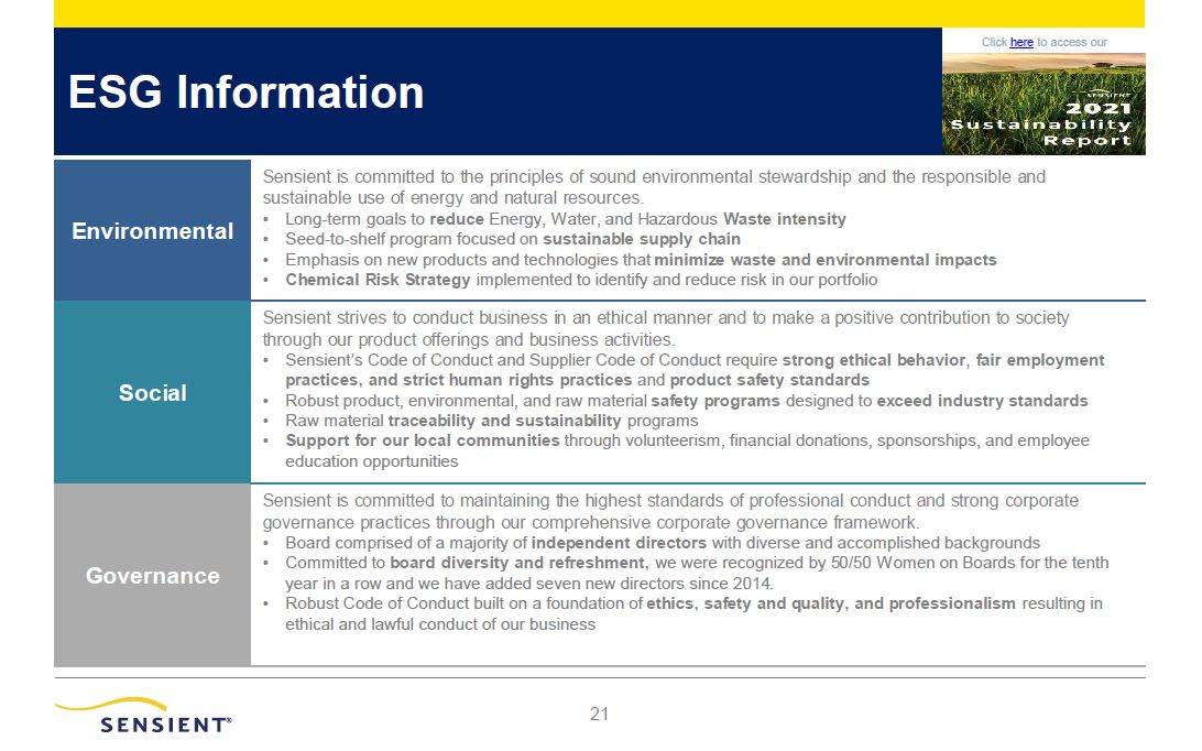 ESG Information  Click here to access our  Environmental  Sensient is committed to the principles of sound environmental stewardship and the responsible and sustainable use of energy and natural resources.  Long-term goals to reduce Energy, Water, and Hazardous Waste intensity  Seed-to-shelf program focused on sustainable supply chain  Emphasis on new products and technologies that minimize waste and environmental impacts  Chemical Risk Strategy implemented to identify and reduce risk in our portfolio  Social  Sensient strives to conduct business in an ethical manner and to make a positive contribution to society through our product offerings and business activities.  Sensient’s Code of Conduct and Supplier Code of Conduct require strong ethical behavior, fair employment practices, and strict human rights practices and product safety standards  Robust product, environmental, and raw material safety programs designed to exceed industry standards  Raw material traceability and sustainability programs  Support for our local communities through volunteerism, financial donations, sponsorships, and employee  education opportunities  Governance  Sensient is committed to maintaining the highest standards of professional conduct and strong corporate governance practices through our comprehensive corporate governance framework.  Board comprised of a majority of independent directors with diverse and accomplished backgrounds  Committed to board diversity and refreshment, we were recognized by 50/50 Women on Boards for the tenth year in a row and we have added seven new directors since 2014.  Robust Code of Conduct built on a foundation of ethics, safety and quality, and professionalism resulting in ethical and lawful conduct of our business  21