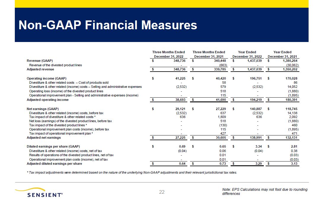 22  Non-GAAP Financial Measures  Note: EPS Calculations may not foot due to rounding differences  Three Months Ended  Three Months Ended  Year Ended  Year Ended   December 31, 2022    December 31, 2021    December 31, 2022    December 31, 2021   Revenue (GAAP)  $ 348,736  $ 340,448  $ 1,437,039  $ 1,380,264  Revenue of the divested product lines   -    (663)   -    (30,062)  Adjusted revenue   $ 348,736   $ 339,785  $ 1,437,039  $ 1,350,202  Operating income (GAAP)  $  41,225  $  40,420  $ 196,751  $ 170,028  Divestiture & other related costs – Cost of products sold  -  58  -  86  Divestiture & other related (income) costs – Selling and administrative expenses  (2,532)  579  (2,532)  14,052  Operating loss (income) of the divested product lines  -  518  -  (1,880)  Operational improvement plan - Selling and administrative expenses (income)   -    115    -    (1,895)  Adjusted operating income   $ 38,693   $ 41,690  $ 194,219  $ 180,391  Net earnings (GAAP)  $  29,121  $  27,229  $ 140,887  $ 118,745  Divestiture & other related (income) costs, before tax  (2,532)  637  (2,532)  14,138  Tax impact of divestiture & other related costs *  636  1,809  636  2,092  Net loss (earnings) of the divested product lines, before tax  -  518  -  (1,880)  Tax impact of the divested product lines *  -  (130)  -  460  Operational improvement plan costs (income), before tax  -  115  -  (1,895)  Tax impact of operational improvement plan *   -    427    -    471   Adjusted net earnings   $ 27,225   $ 30,605  $ 138,991  $ 132,131  Diluted earnings per share (GAAP)  $  0.69  $  0.65  $  3.34  $  2.81  Divestiture & other related (income) costs, net of tax  (0.04)  0.06  (0.04)  0.38  Results of operations of the divested product lines, net of tax  -  0.01  -  (0.03)  Operational improvement plan costs (income), net of tax - 0.01 - (0.03)  Adjusted diluted earnings per share $ 0.64 $ 0.73 $ 3.29 $ 3.13  * Tax impact adjustments were determined based on the nature of the underlying Non-GAAP adjustments and their relevant jurisdictional tax rates.