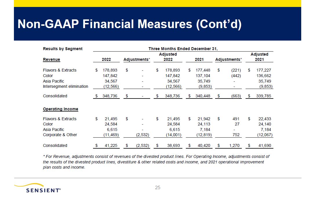 Non-GAAP Financial Measures (Cont’d)  28  Revenue   2022   Adjustments*  Adjusted   2022    2021   Adjustments*  Adjusted   2021   Flavors & Extracts  $ 178,893  $ -  $ 178,893  $ 177,448  $ (221)  $ 177,227  Color  147,842  -  147,842  137,104  (442)  136,662  Asia Pacific  34,567  -  34,567  35,749  -  35,749  Intersegment elimination   (12,566)   -    (12,566)   (9,853)   -    (9,853)  Consolidated   $ 348,736   $ -  $ 348,736  $ 340,448  $ (663)  $ 339,785  Operating Income  Flavors & Extracts  $ 21,495  $ -  $ 21,495  $ 21,942  $ 491  $ 22,433  Color  24,584  -  24,584  24,113  27  24,140  Asia Pacific  6,615  -  6,615  7,184  -  7,184  Corporate & Other   (11,469)   (2,532)   (14,001)   (12,819)   752    (12,067)  Consolidated   $ 41,225   $ (2,532)  $ 38,693  $ 40,420  $ 1,270  $ 41,690  * For Revenue, adjustments consist of revenues of the divested product lines. For Operating Income, adjustments consist of the results of the divested product lines, divestiture & other related costs and income, and 2021 operational improvement plan costs and income.  Results by Segment Three Months Ended December 31,