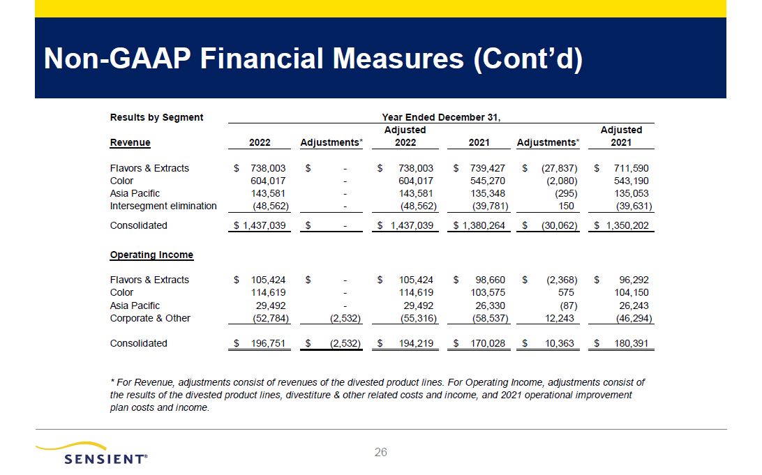 Non-GAAP Financial Measures (Cont’d)  28  Revenue   2022   Adjustments*  Adjusted   2022    2021   Adjustments*  Adjusted   2021   Flavors & Extracts  $ 738,003  $ -  $ 738,003  $ 739,427  $ (27,837)  $ 711,590  Color  604,017  -  604,017  545,270  (2,080)  543,190  Asia Pacific  143,581  -  143,581  135,348  (295)  135,053  Intersegment elimination   (48,562)   -    (48,562)   (39,781)   150    (39,631)  Consolidated   $ 1,437,039   $ -  $ 1,437,039  $ 1,380,264  $ (30,062)  $ 1,350,202  Operating Income  Flavors & Extracts  $ 105,424  $ -  $ 105,424  $ 98,660  $ (2,368)  $ 96,292  Color  114,619  -  114,619  103,575  575  104,150  Asia Pacific  29,492  -  29,492  26,330  (87)  26,243  Corporate & Other   (52,784)   (2,532)   (55,316)   (58,537)   12,243    (46,294)  Consolidated   $ 196,751   $ (2,532)  $ 194,219  $ 170,028  $ 10,363  $ 180,391  Results by Segment Year Ended December 31,   * For Revenue, adjustments consist of revenues of the divested product lines. For Operating Income, adjustments consist of the results of the divested product lines, divestiture & other related costs and income, and 2021 operational improvement plan costs and income.