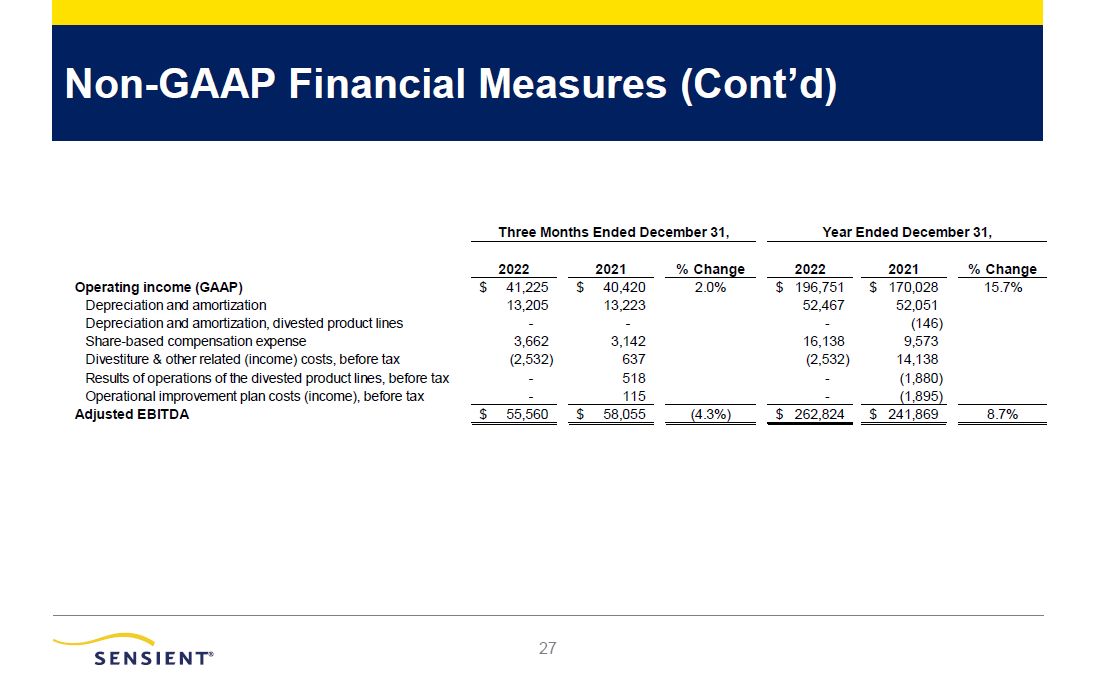 Non-GAAP Financial Measures (Cont’d)   2022    2021    % Change    2022    2021    % Change   Operating income (GAAP)  $ 41,225  $ 40,420  2.0%  $ 196,751  $ 170,028  15.7%  Depreciation and amortization  13,205  13,223  52,467  52,051  Depreciation and amortization, divested product lines  -  -  -  (146)  Share-based compensation expense  3,662  3,142  16,138  9,573  Divestiture & other related (income) costs, before tax  (2,532)  637  (2,532)  14,138  Results of operations of the divested product lines, before tax  -  518  -  (1,880)  Operational improvement plan costs (income), before tax   -    115       -    (1,895)     Adjusted EBITDA   $ 55,560   $ 58,055  (4.3%)  $ 262,824  $ 241,869  8.7%   Three Months Ended December 31, Year Ended December 31,   28