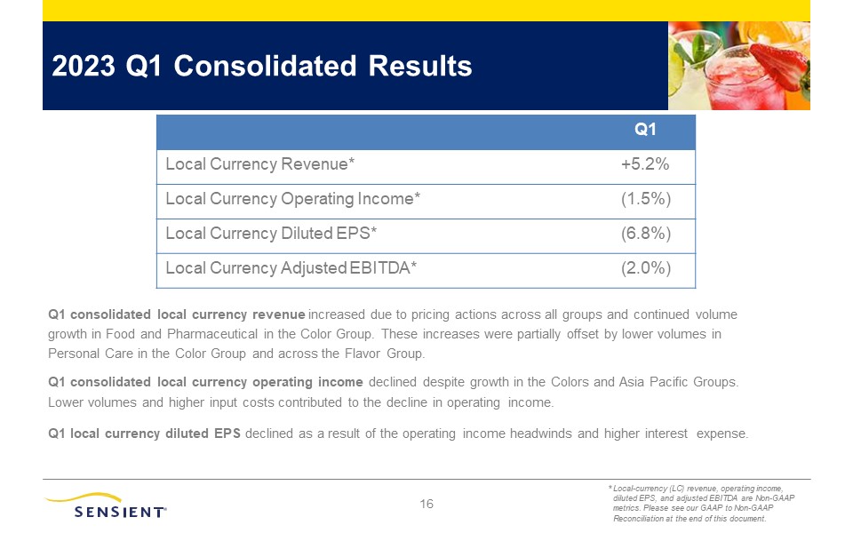 15  2023 Q1 Segment Results  Flavors & Extracts Group first quarter revenue decreased due to lower volumes, partially offset by pricing actions. Lower volumes in the Group were primarily due to customer destocking. Operating income declined in the quarter primarily due to higher input costs and lower volumes, partially offset by pricing actions.  Asia Pacific Group first quarter revenue and operating income increased as a result of higher volumes and pricing actions across the Group.  Local Currency Operating Income*  Q1  Color  +6.3%  Flavors & Extracts  (19.5%)  Asia Pacific  +18.0%  Local Currency Revenue*  Local Currency* Commentary:  Q1  Color Group reported higher revenue in the quarter due to pricing  actions across the Group and volume growth in Food & Pharmaceutical, partially offset by lower Personal Care volumes. Operating income was up due to pricing actions across the Group and volume growth within Food & Pharmaceutical, partially offset by lower Personal Care volumes.  Color  +10.0%  Flavors & Extracts  (1.3%)  Asia Pacific  +14.6%  * Local-currency (LC) revenue and operating income are Non-GAAP metrics. Please see our GAAP to Non-GAAP Reconciliation at the end of this document.