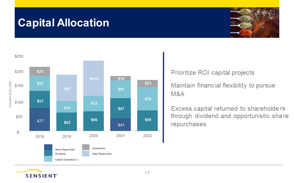 Capital Allocation  rs  re  DOLLARS IN MILLIONS  $250  $200 $31  $150 $51  $87  $100 $57  $39  $50  $77 $62  $-  2018 2019  Share Repurchase  Prioritize ROI capital projects  $118 $14  $23 Maintain financial flexibility to pursue  $61  M&A  $79  $52  $67 Excess capital returned to shareholde  through dividend and opportunistic sha  $66 $69  $43 repurchases  2020 2021 2022  Acquisitions  Dividends  Debt Repayments  Capital Expenditure  s  17