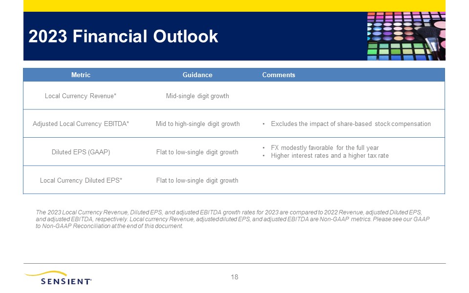 2023 Financial Outlook  17  Metric  Guidance  Comments  Local Currency Revenue*  Mid-single digit growth  Adjusted Local Currency EBITDA*  Mid to high-single digit growth  Excludes the impact of share-based stock compensation  Diluted EPS (GAAP)  Flat to low-single digit growth  FX modestly favorable for the full year  Higher interest rates and a higher tax rate  Local Currency Diluted EPS*  Flat to low-single digit growth  The 2023 Local Currency Revenue, Diluted EPS, and adjusted EBITDA growth rates for 2023 are compared to 2022 Revenue, adjusted Diluted EPS, and adjusted EBITDA, respectively. Local currency Revenue, adjusted diluted EPS, and adjusted EBITDA are Non-GAAP metrics. Please see our GAAP to Non-GAAP Reconciliation at the end of this document.