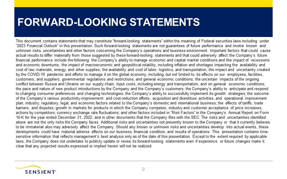 FORWARD-LOOKING STATEMENTS  2  This document contains statements that may constitute “forward-looking statements” within the meaning of Federal securities laws including under “2023 Financial Outlook” in this presentation. Such forward-looking statements are not guarantees of future performance and involve known and unknown risks, uncertainties and other factors concerning the Company’s operations and business environment. Important factors that could cause actual results to differ materially from those suggested by these forward-looking statements and that could adversely affect the Company’s future financial performance include the following: the Company’s ability to manage economic and capital market conditions and the impact of recessions and economic downturns; the impact of macroeconomic and geopolitical volatility, including inflation and shortages impacting the availability and cost of raw materials, energy, and other supplies; the availability and cost of labor, logistics, and transportation; the impact and uncertainty created by the COVID-19 pandemic and efforts to manage it on the global economy, including, but not limited to, its effects on our employees, facilities, customers, and suppliers, governmental regulations and restrictions, and general economic conditions; the uncertain impacts of the ongoing conflict between Russia and Ukraine on our supply chain, input costs, including energy and transportation, and on general economic conditions; the pace and nature of new product introductions by the Company and the Company’s customers; the Company’s ability to anticipate and respond to changing consumer preferences and changing technologies; the Company’s ability to successfully implement its growth strategies; the outcome of the Company’s various productivity-improvement and cost-reduction efforts, acquisition and divestiture activities, and operational improvement plan; industry, regulatory, legal, and economic factors related to the Company’s domestic and international business; the effects of tariffs, trade barriers, and disputes; growth in markets for products in which the Company competes; industry and customer acceptance of price increases; actions by competitors; currency exchange rate fluctuations; and other factors included in “Risk Factors” in the Company's Annual Report on Form 10-K for the year ended December 31, 2022, and in other documents that the Company files with the SEC. The risks and uncertainties identified above are not the only risks the Company faces. Additional risks and uncertainties not presently known to the Company or that it currently believes to be immaterial also may adversely affect the Company. Should any known or unknown risks and uncertainties develop into actual events, these developments could have material adverse effects on our business, financial condition, and results of operations. This presentation contains time-sensitive information that reflects management’s best analysis only as of the date of this presentation. Except to the extent required by applicable laws, the Company does not undertake to publicly update or revise its forward-looking statements even if experience or future changes make it clear that any projected results expressed or implied herein will not be realized.